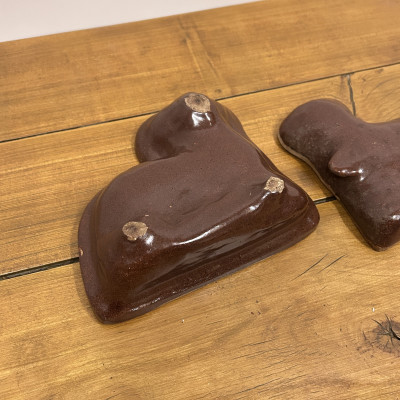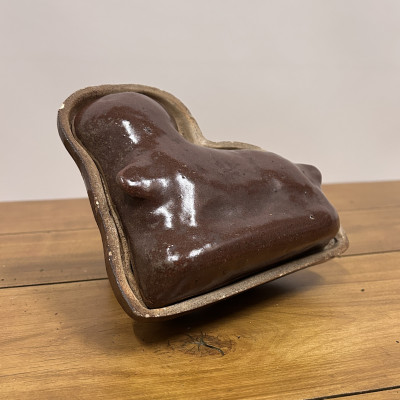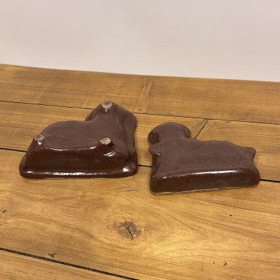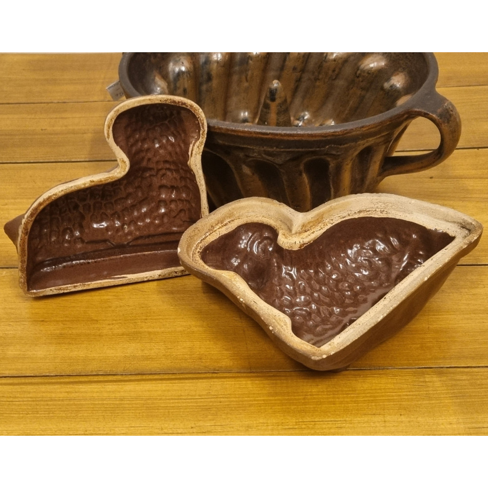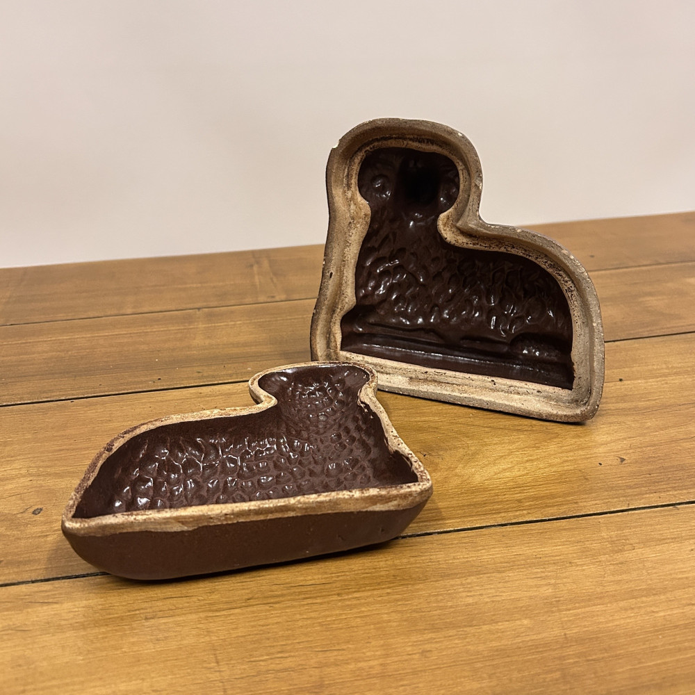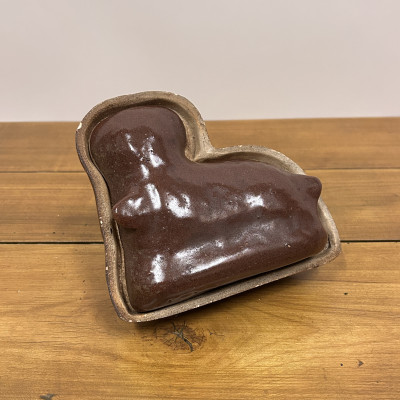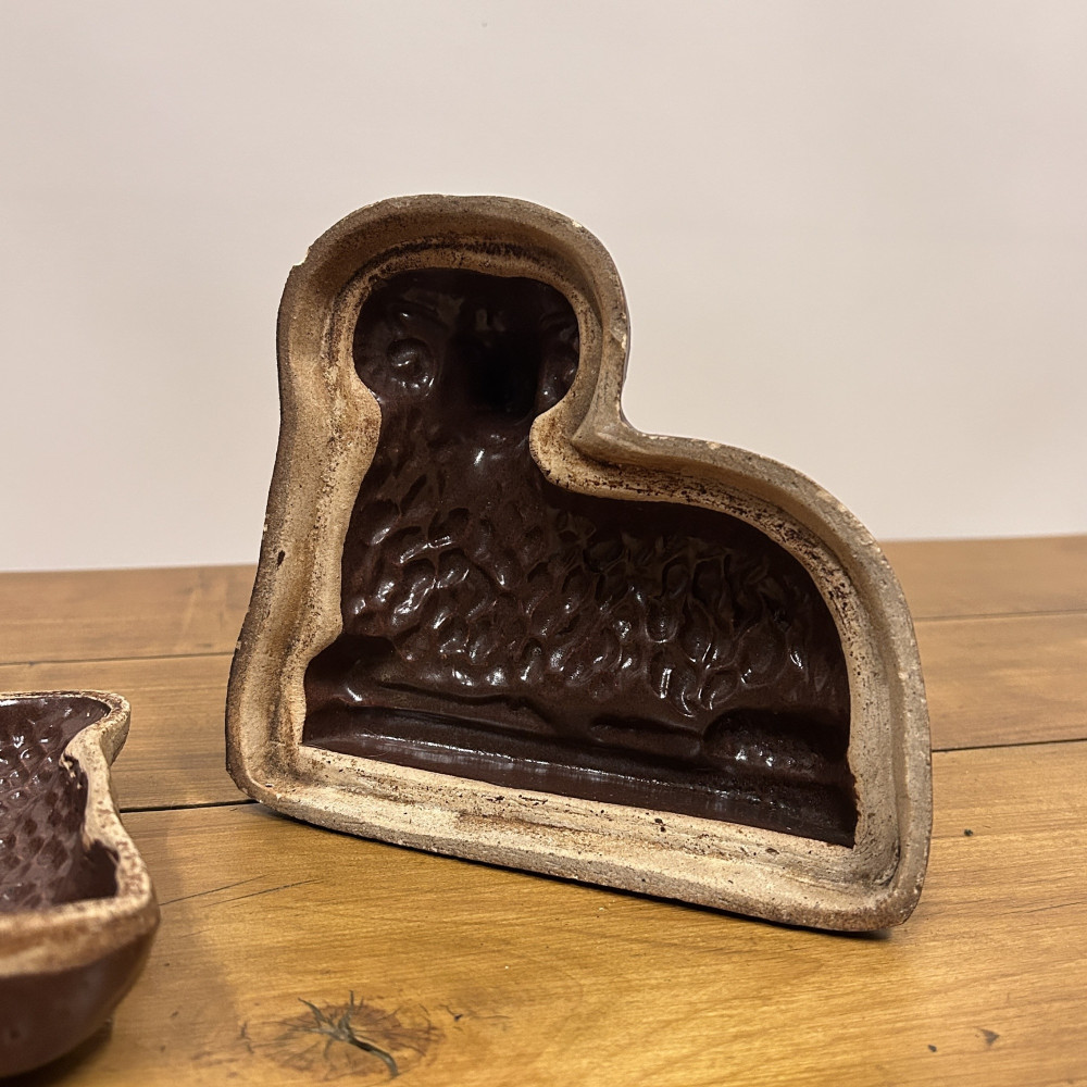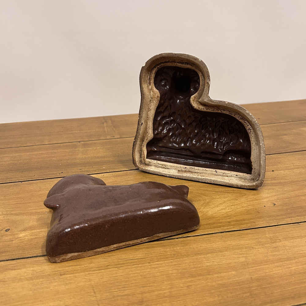 Krásná malá starožitná forma na pečení ve tvaru beránka z glazované kameniny. Vyrobena v první polovině 20. století tradičním způsobem, s typickými znaky lidové keramiky. Forma je menší velikosti – působí velmi jemně a půvabně, ideální jako dekorace do venkovské kuchyně nebo sběratelský doplněk. Povrch nese přirozenou patinu stáří, která podtrhuje její autentičnost a historické kouzlo.