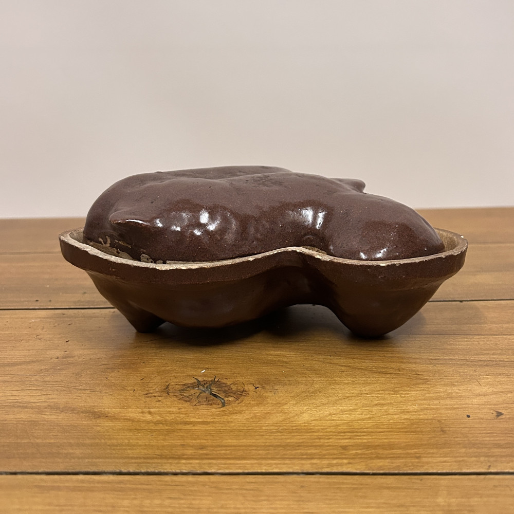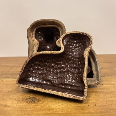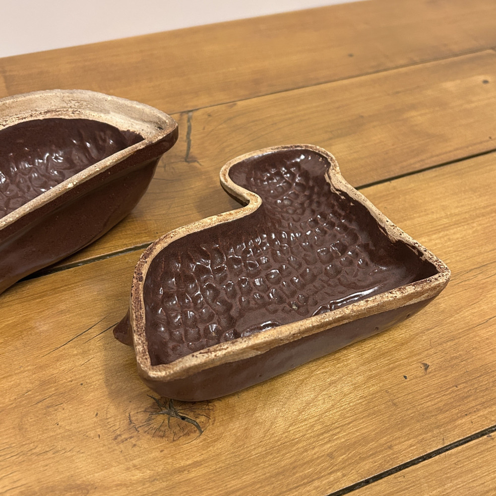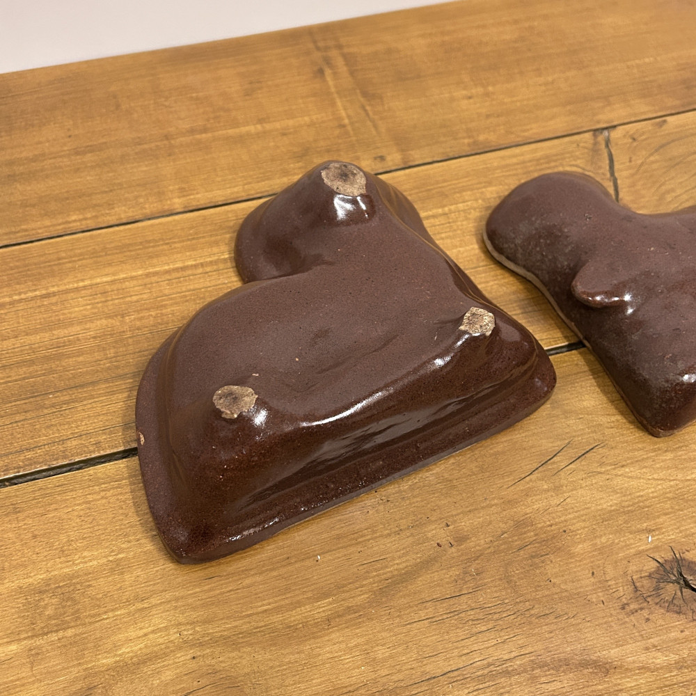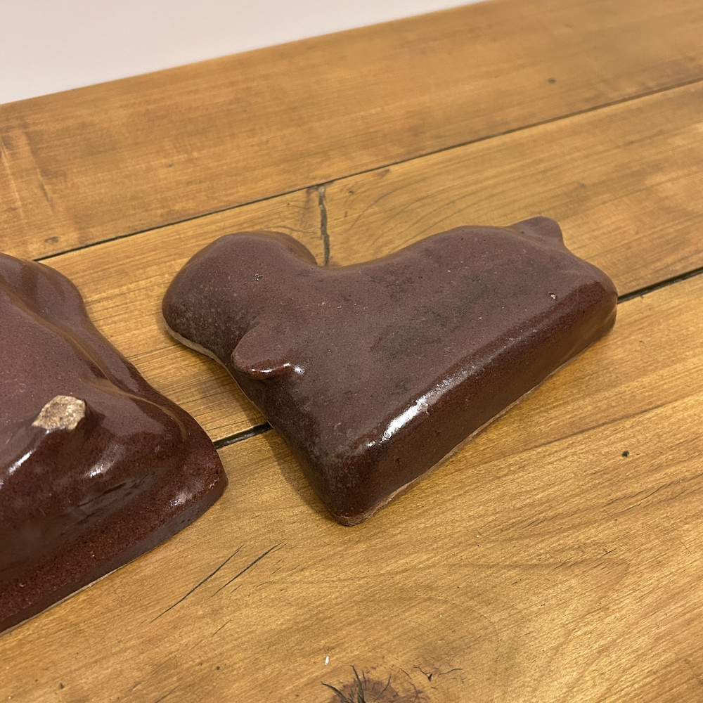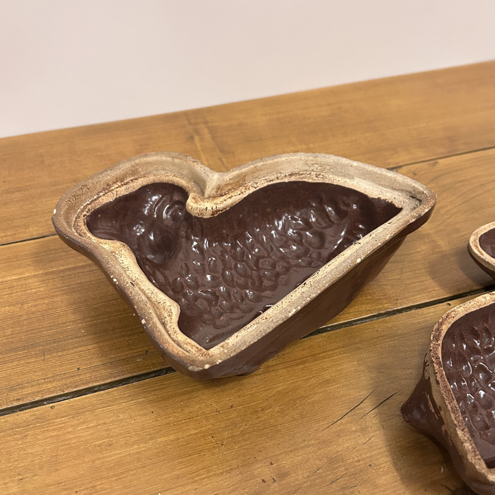 Krásná malá starožitná forma na pečení ve tvaru beránka z glazované kameniny. Vyrobena v první polovině 20. století tradičním způsobem, s typickými znaky lidové keramiky. Forma je menší velikosti – působí velmi jemně a půvabně, ideální jako dekorace do venkovské kuchyně nebo sběratelský doplněk. Povrch nese přirozenou patinu stáří, která podtrhuje její autentičnost a historické kouzlo.