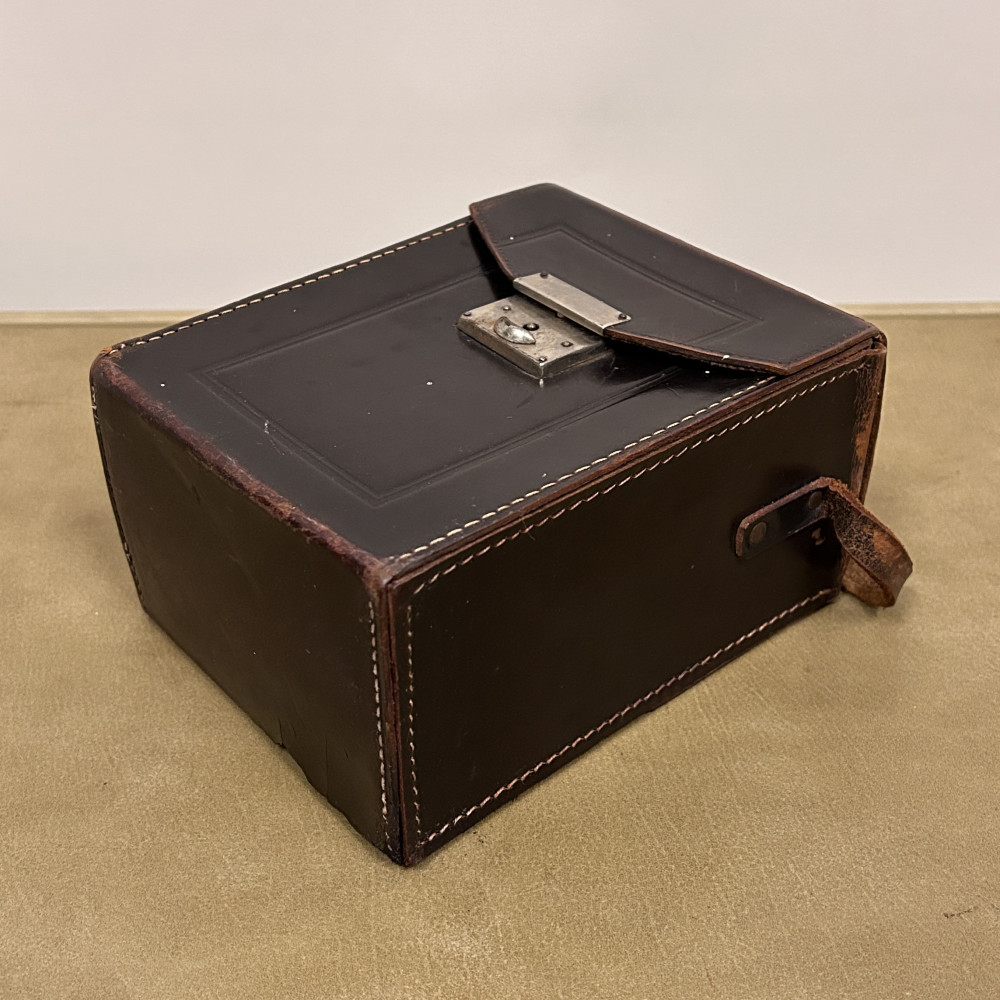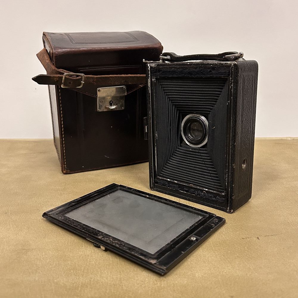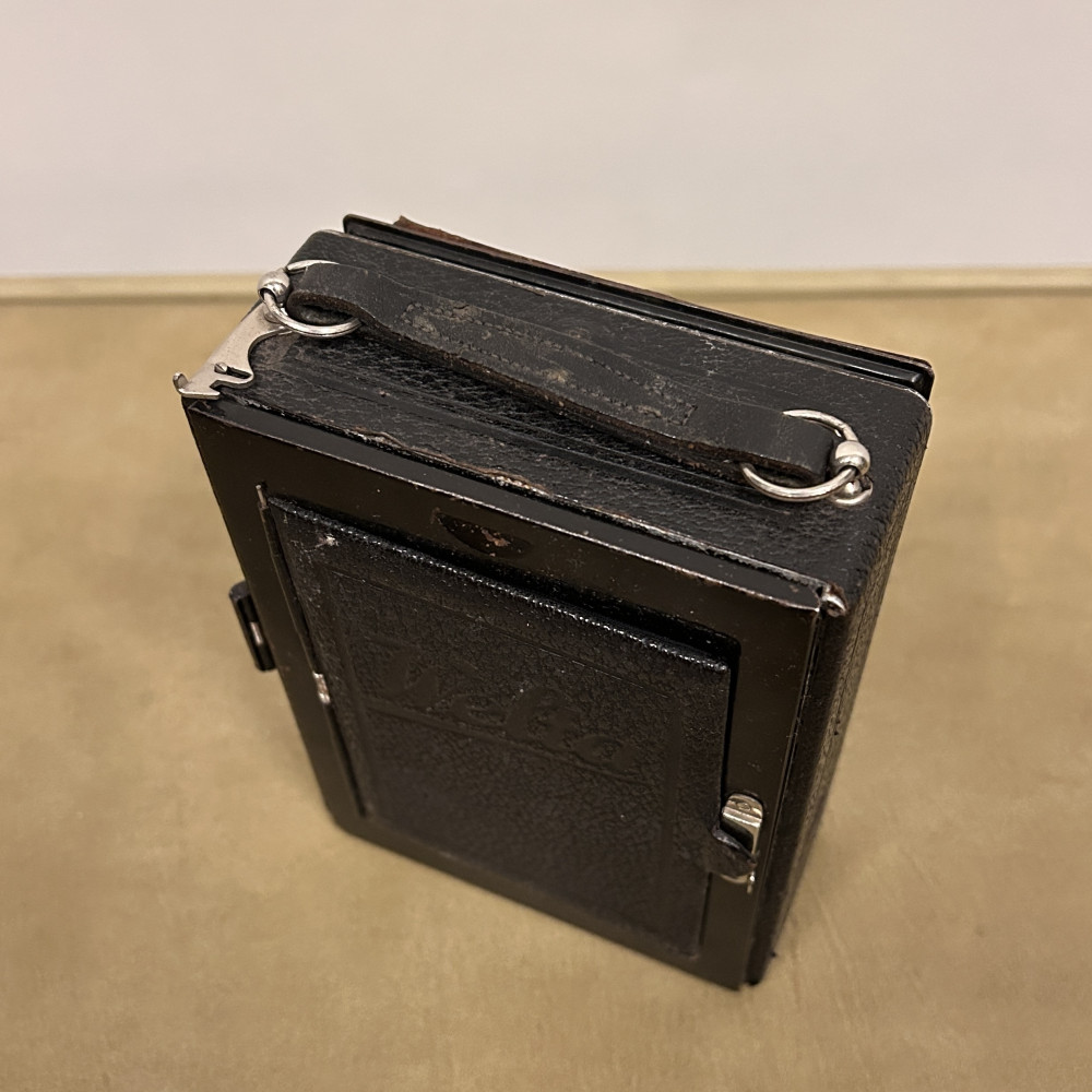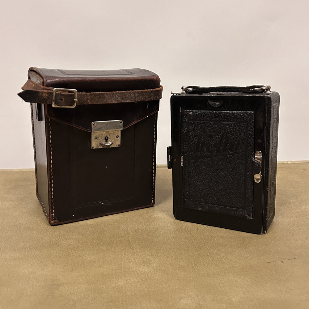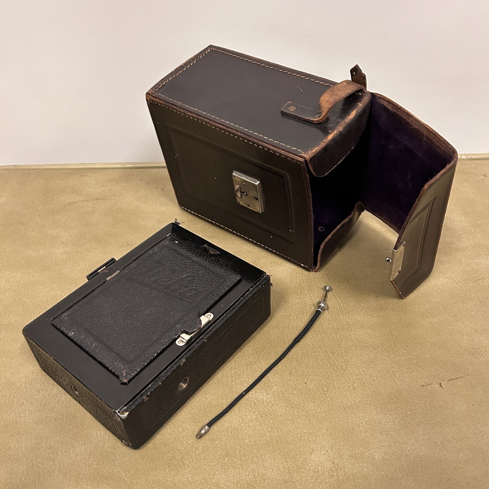 Historický měchový fotoaparát německé značky Welta Vario s koženým pouzdrem.