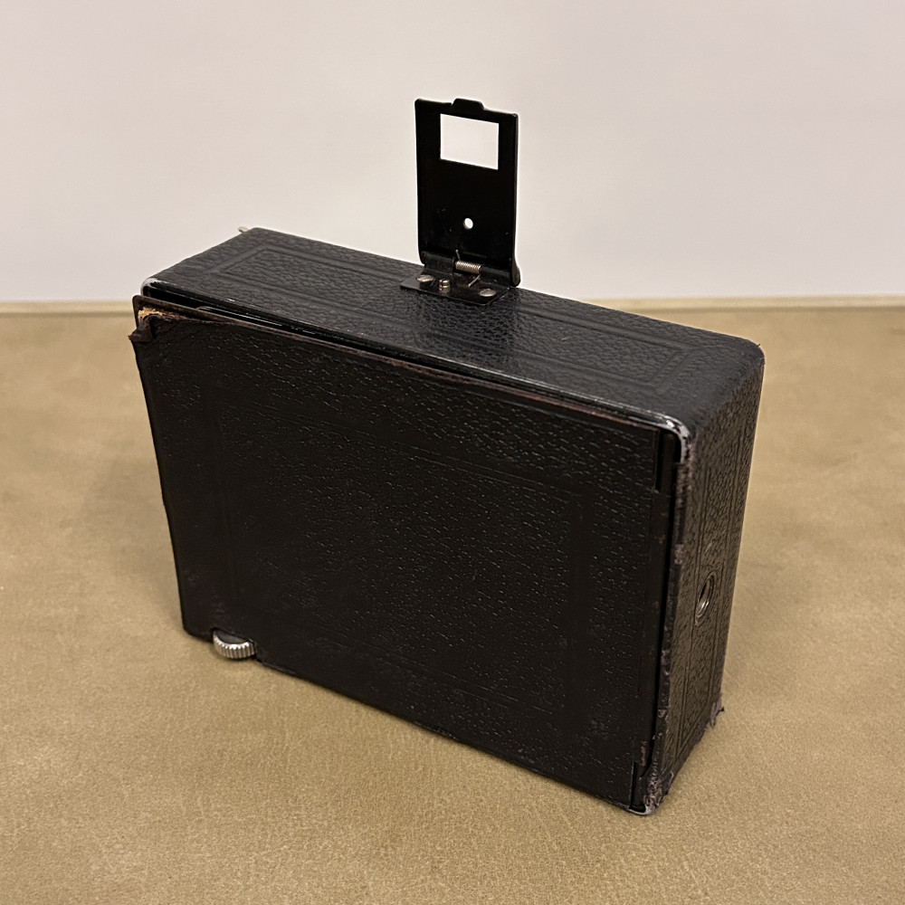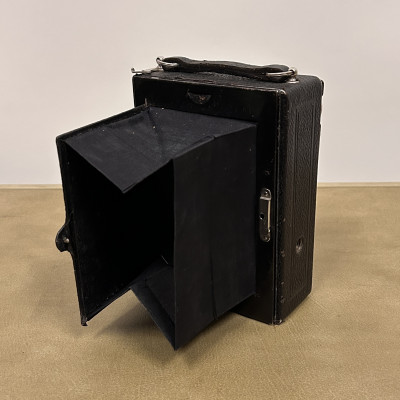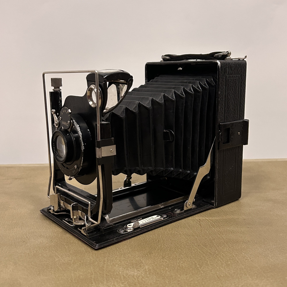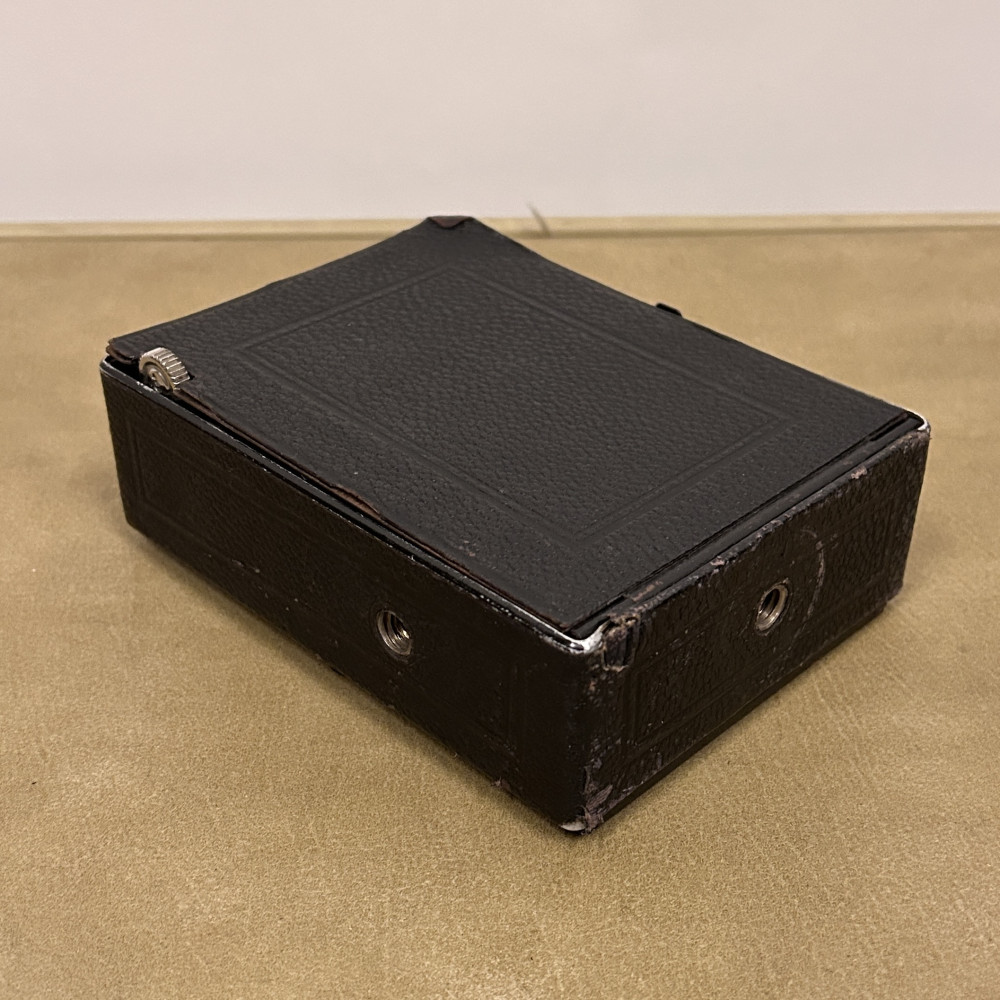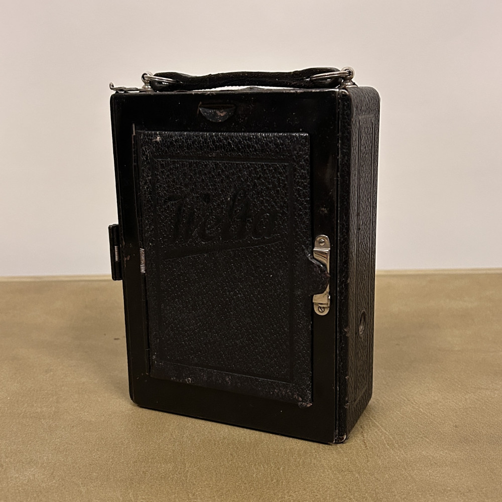 Historický měchový fotoaparát německé značky Welta Vario s koženým pouzdrem.