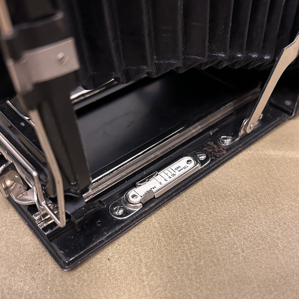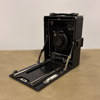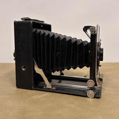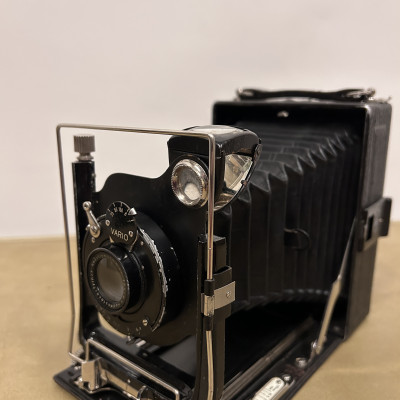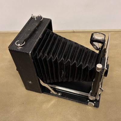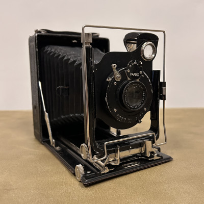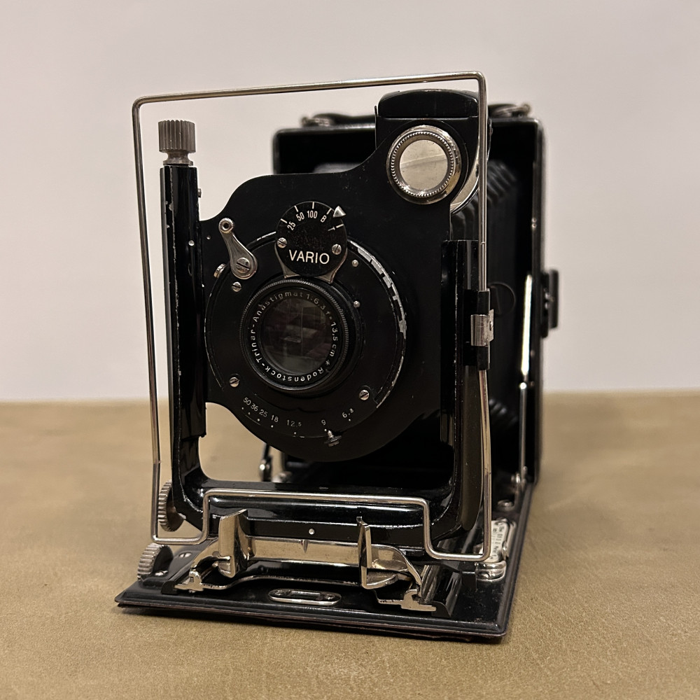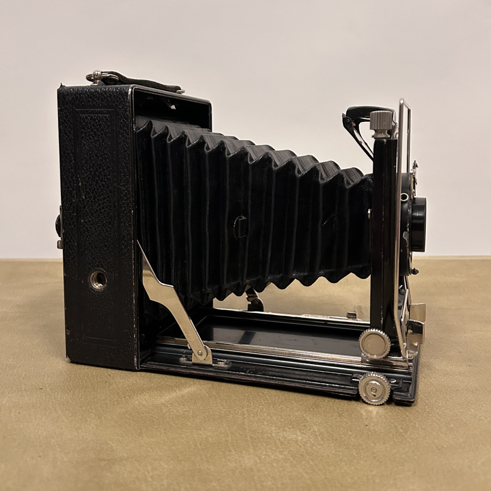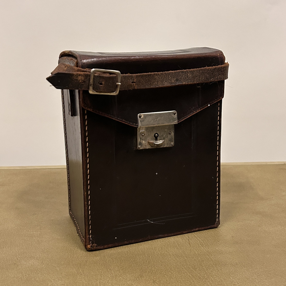 Historický měchový fotoaparát německé značky Welta Vario s koženým pouzdrem.