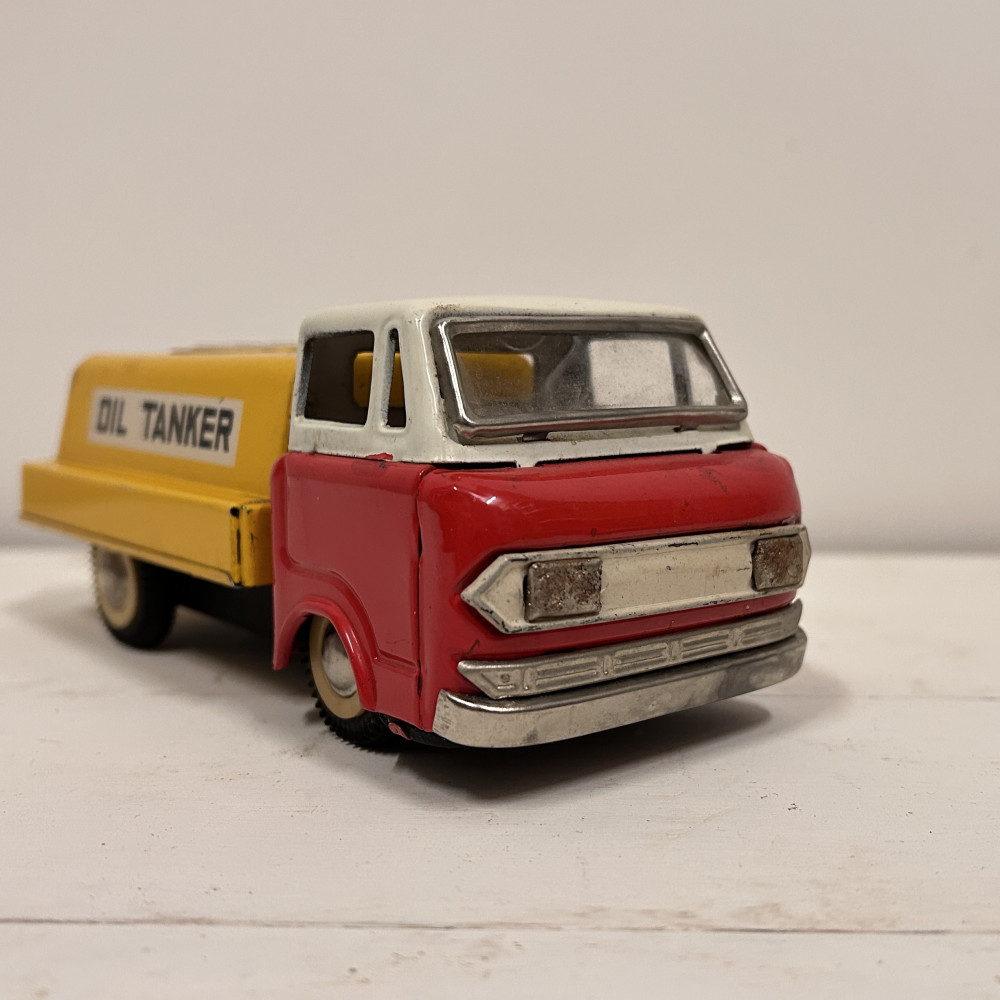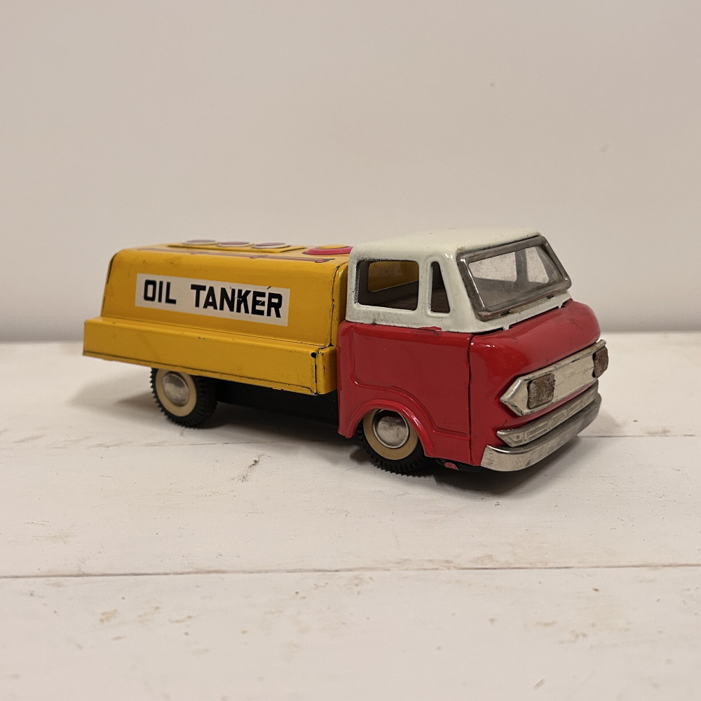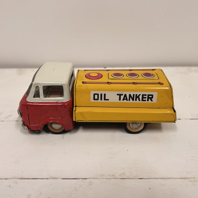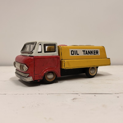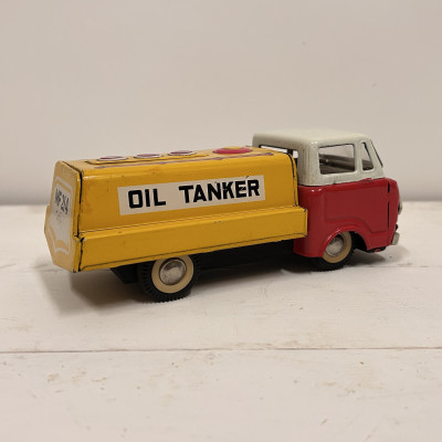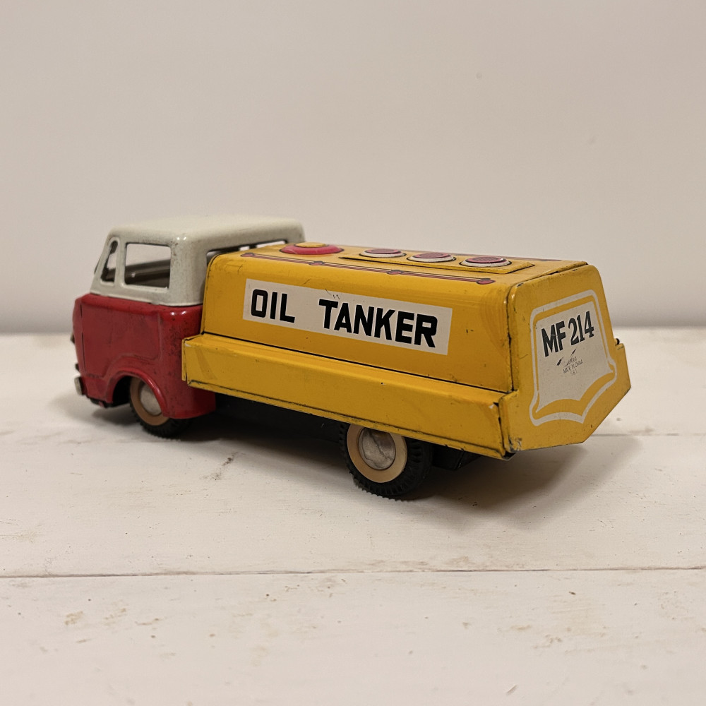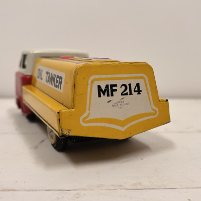 Plechová hračka na setrvačník, auto cisterna OIL TANKER MF 214