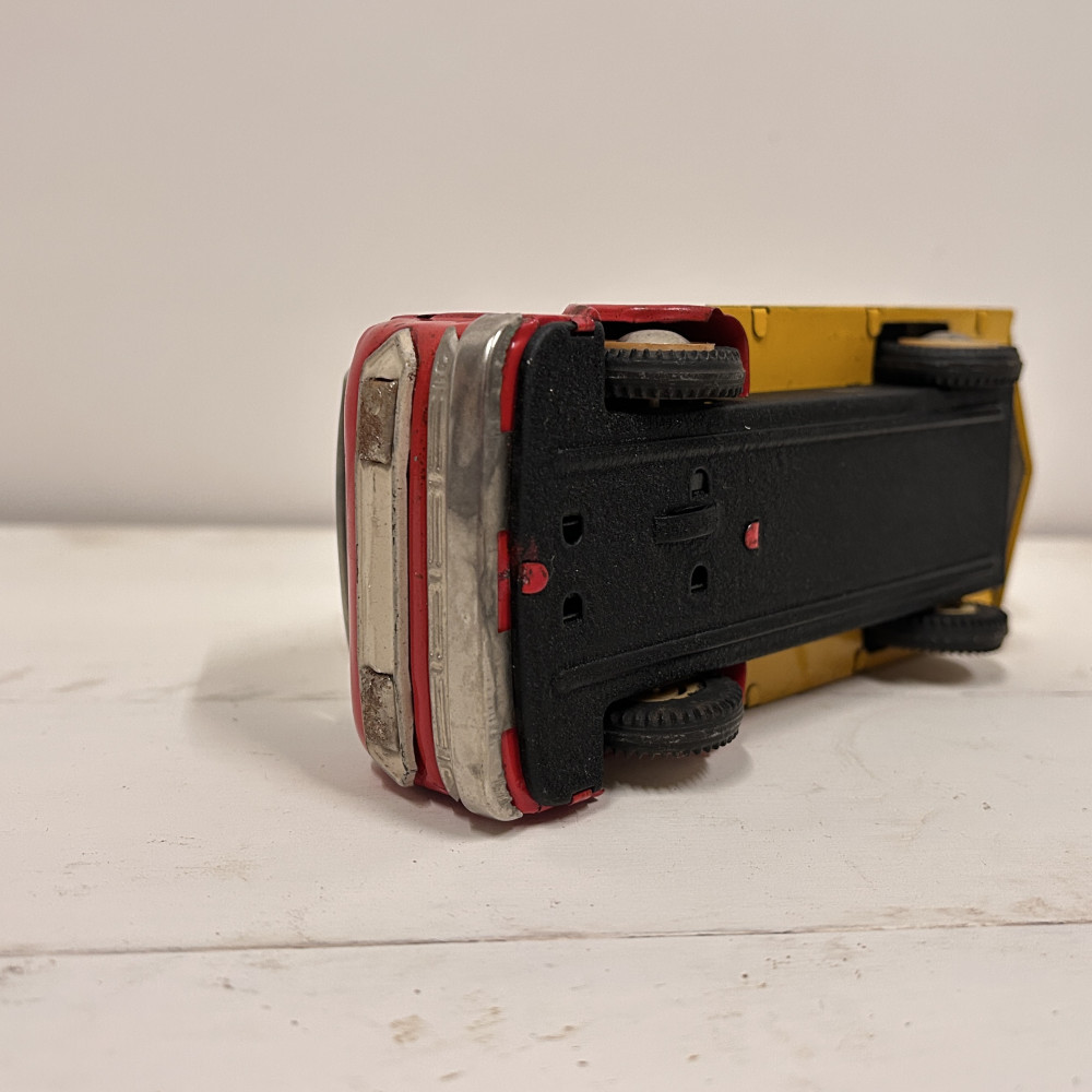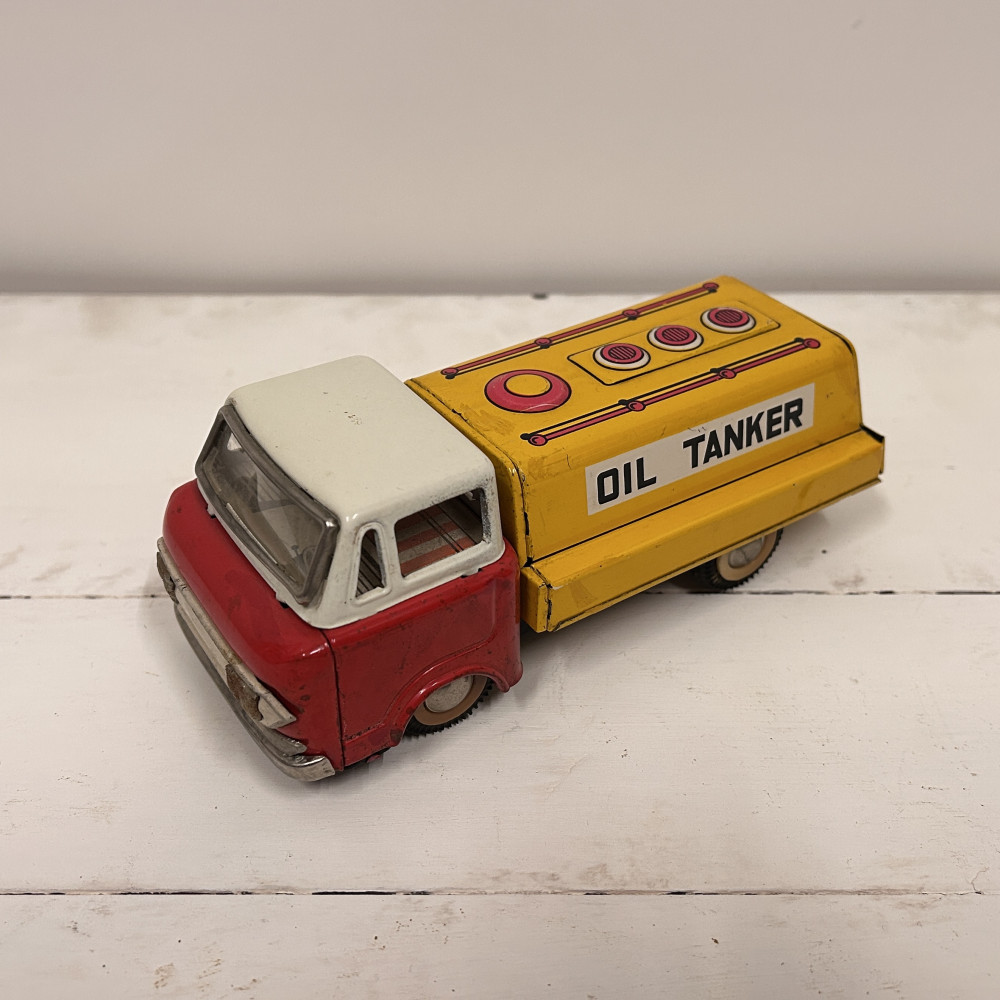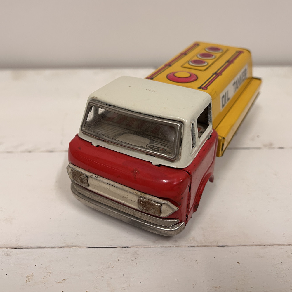Plechová hračka na setrvačník, auto cisterna OIL TANKER MF 214