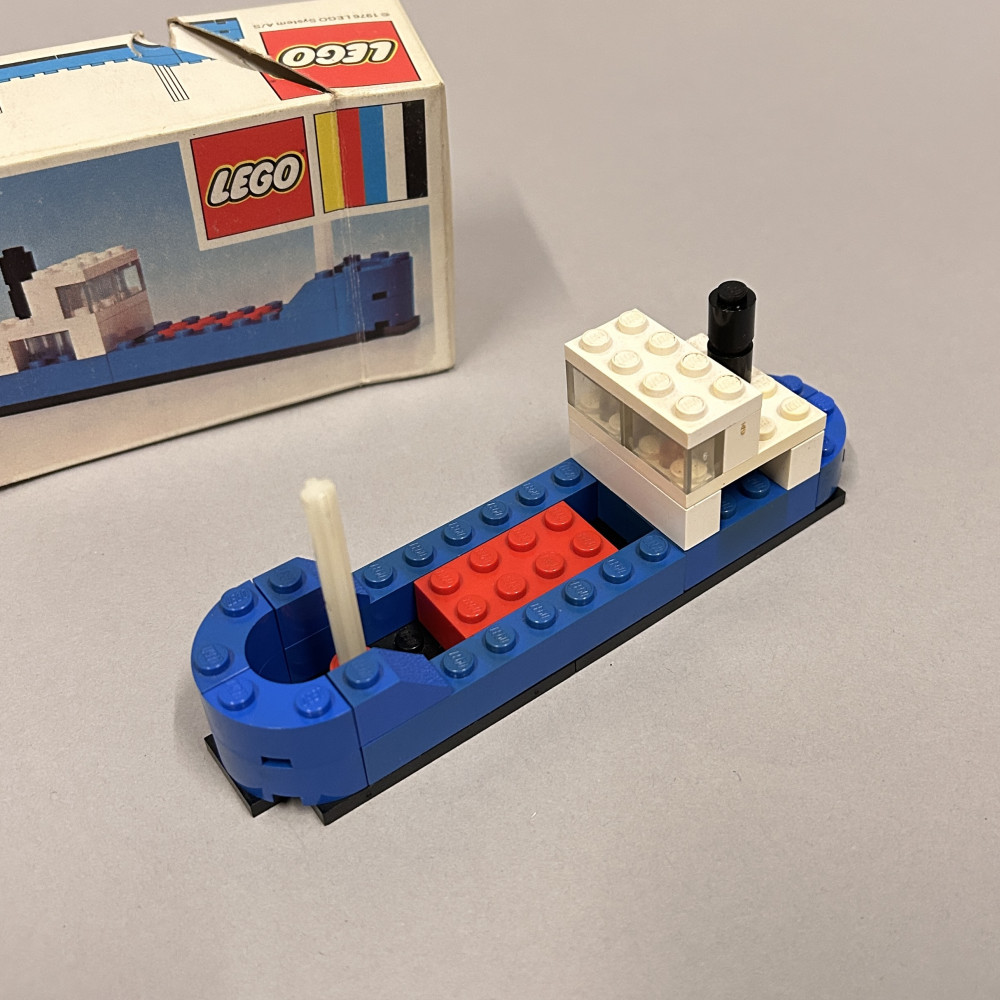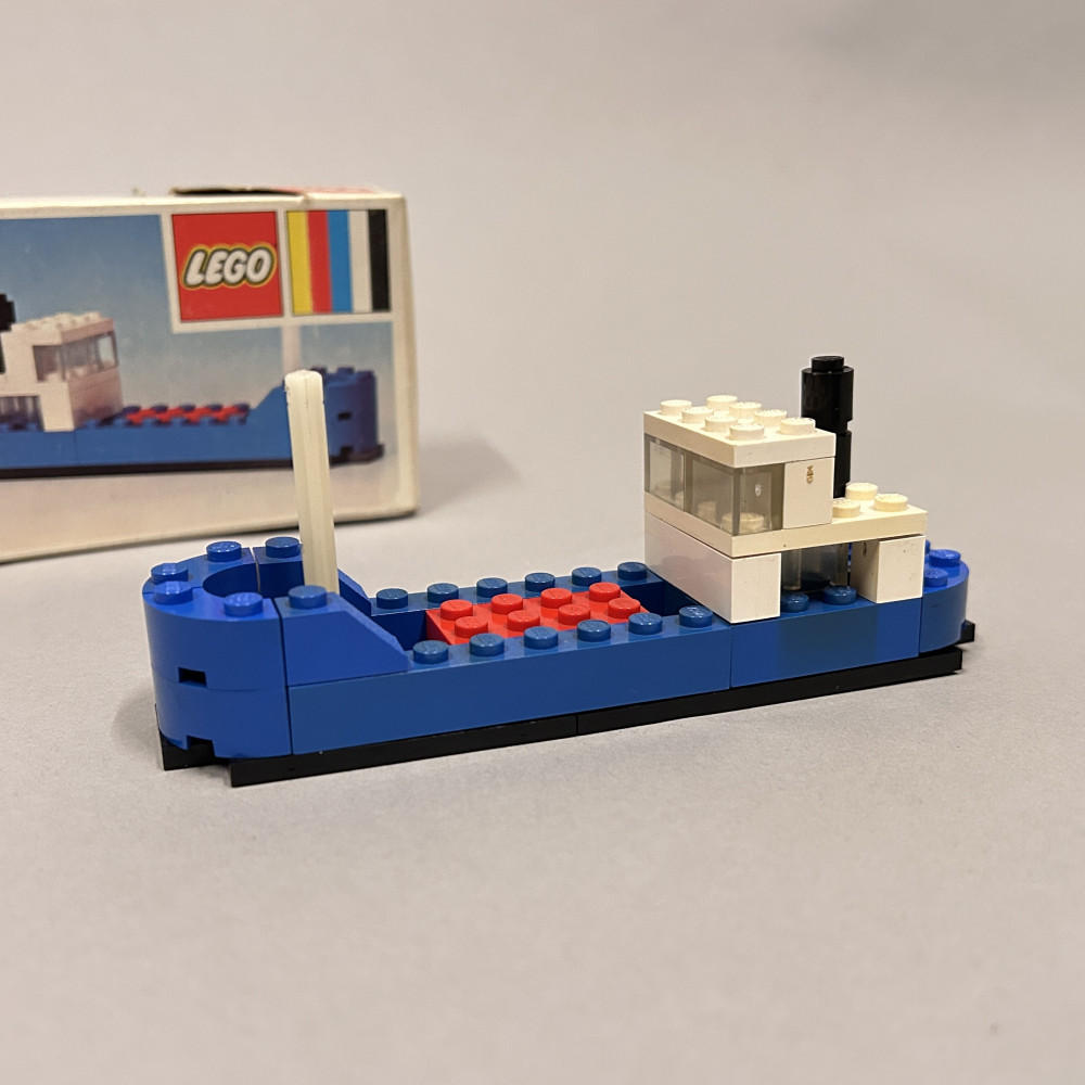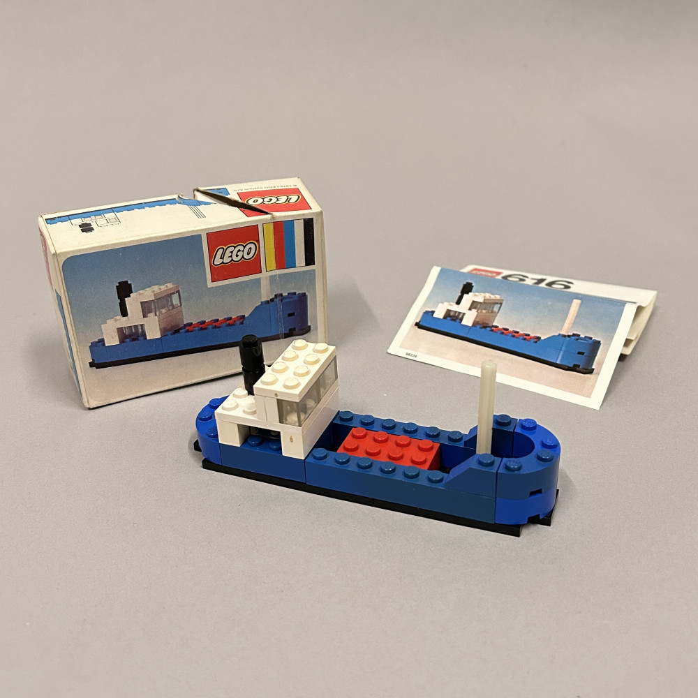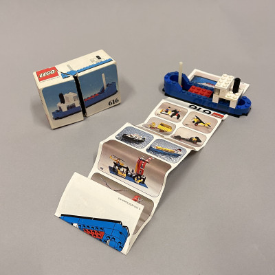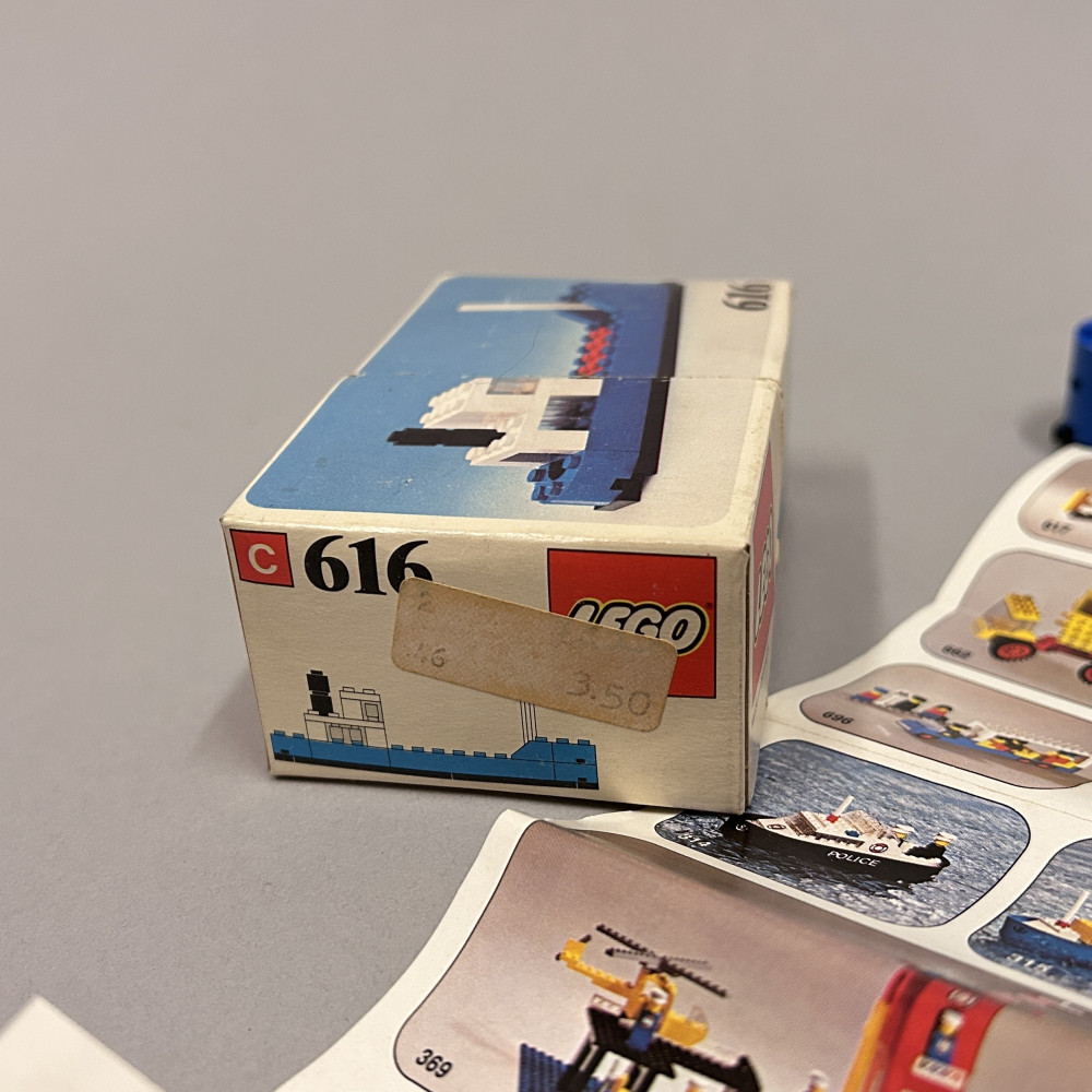 Starožitná stavebnici LEGO s názvem 616 Cargo Ship (Nákladní loď). Tato sada, která je součástí tématu LEGOLAND Harbor, byla vydána v roce 1976. V původní papírové krabičce s návodem.