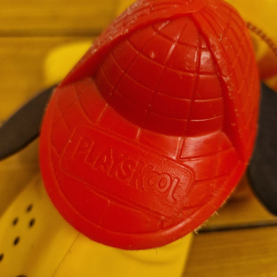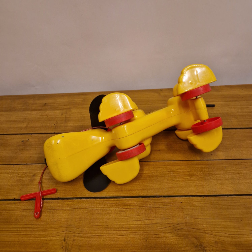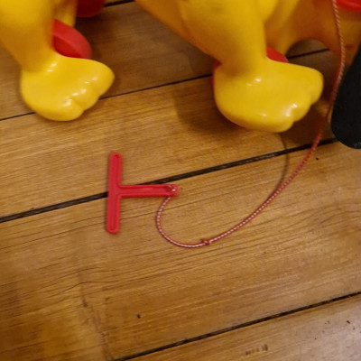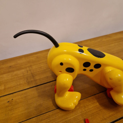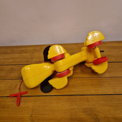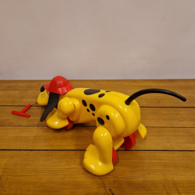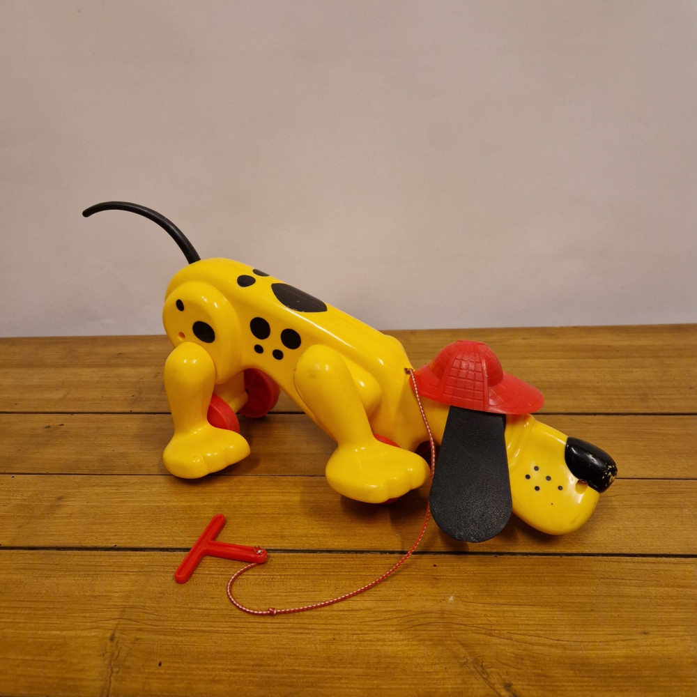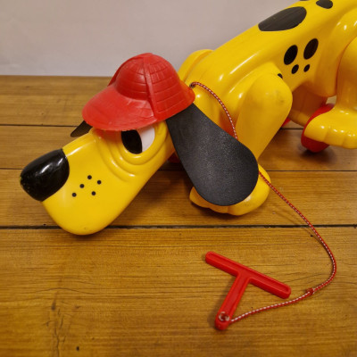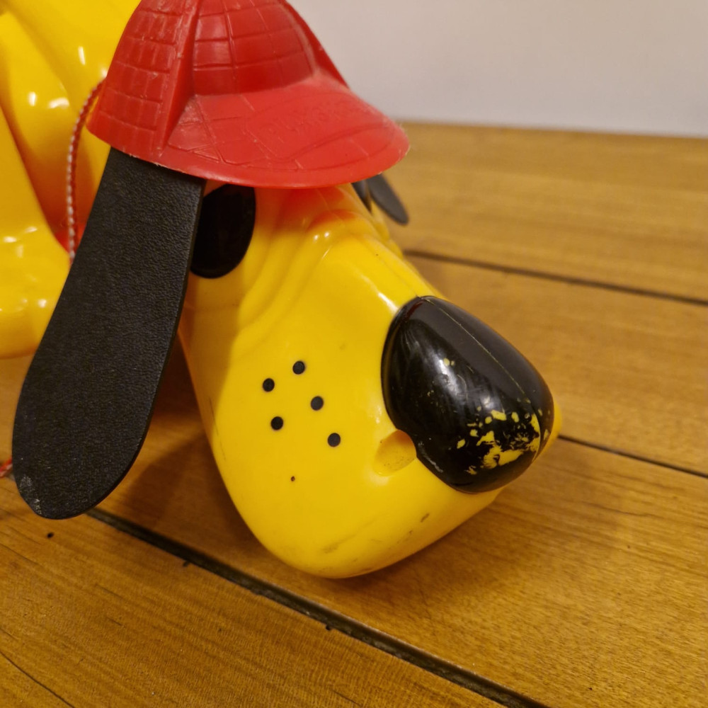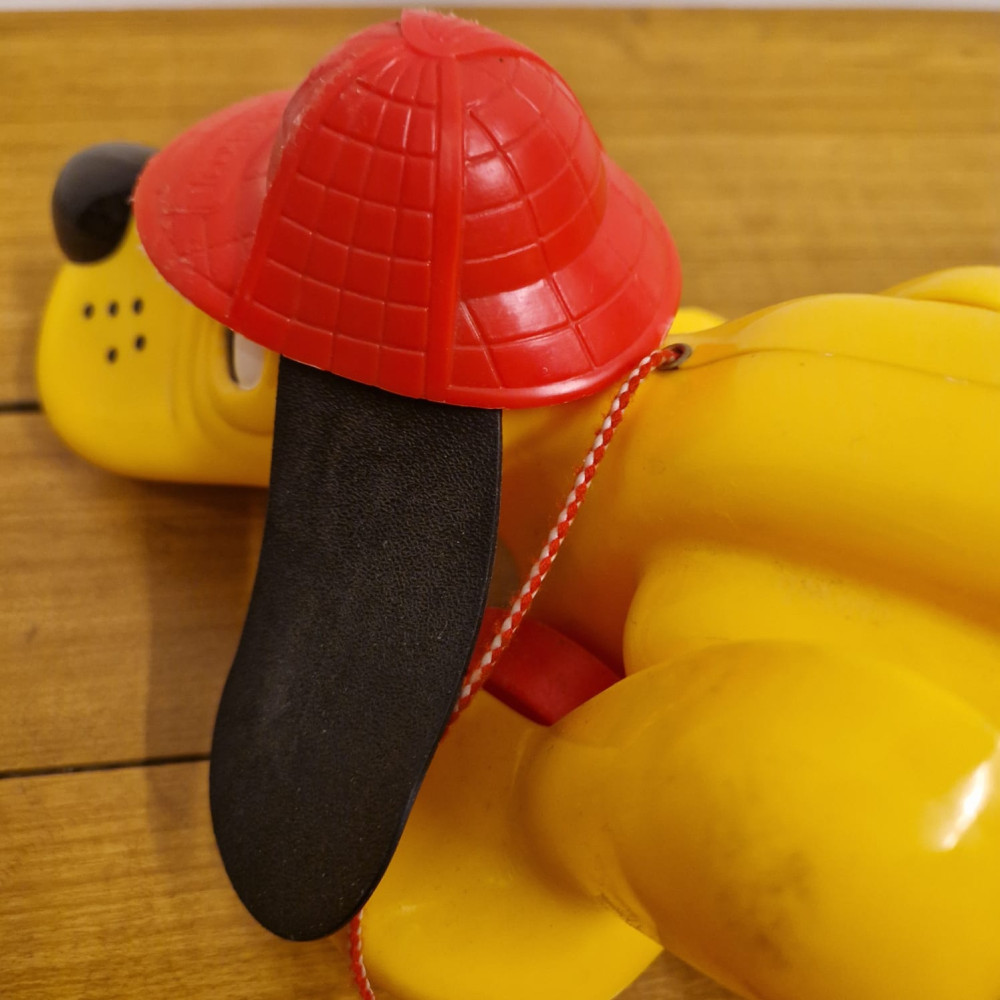Hračka Rufo (nebo také Digger the Dog), klasický tahací pes od značky Playskool. Tento ikonický žlutý pes s červeným kloboukem a černýma ušima se vyráběl v několika verzích už od 70. let.