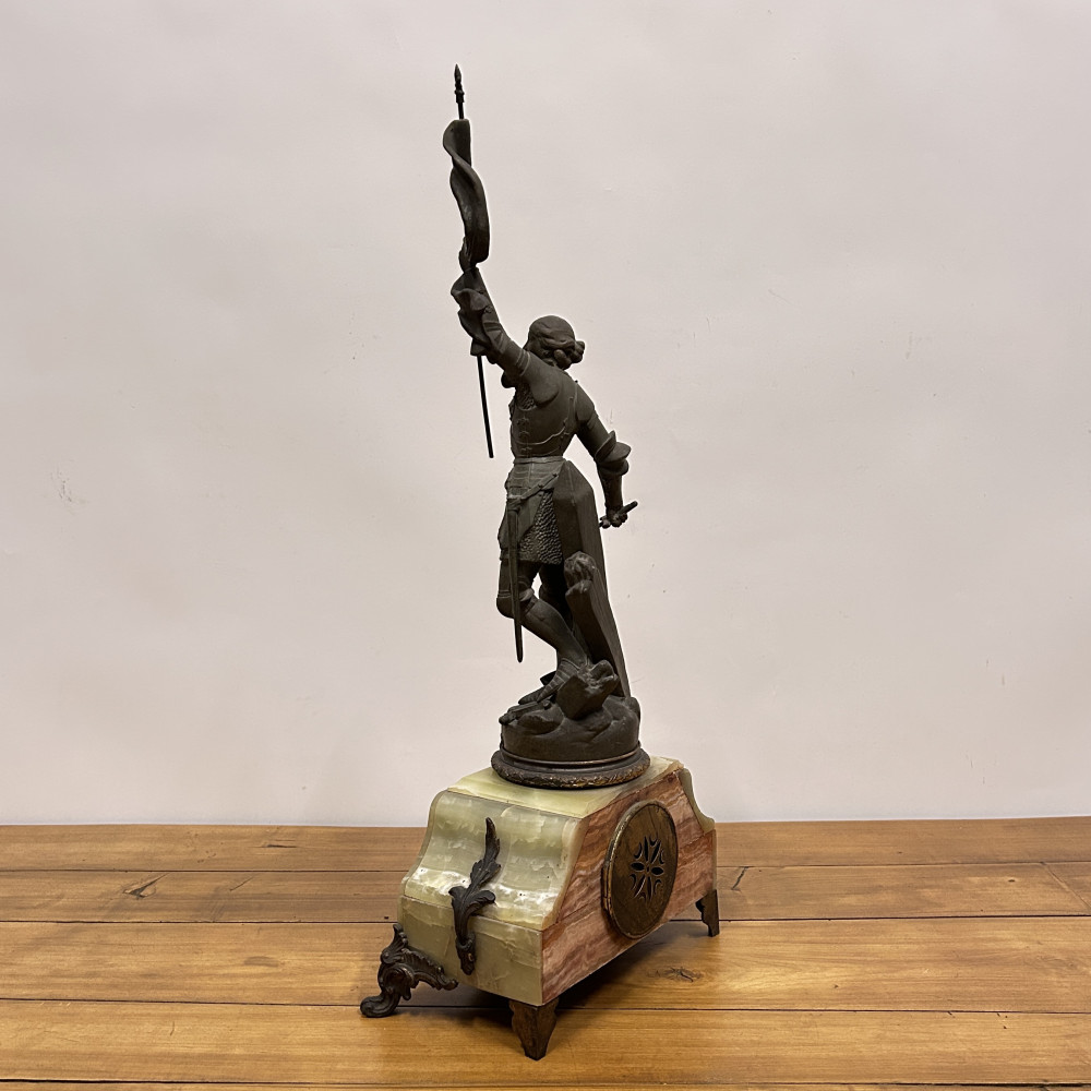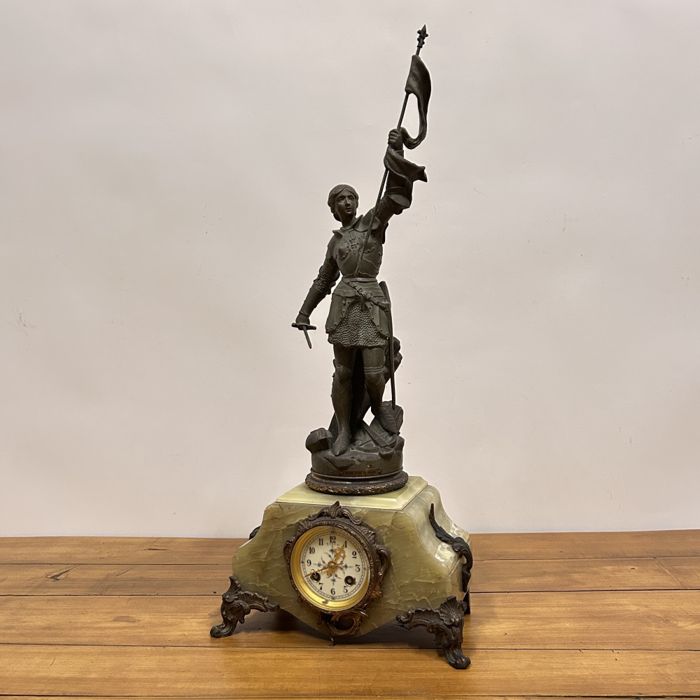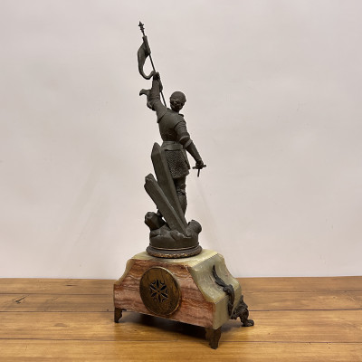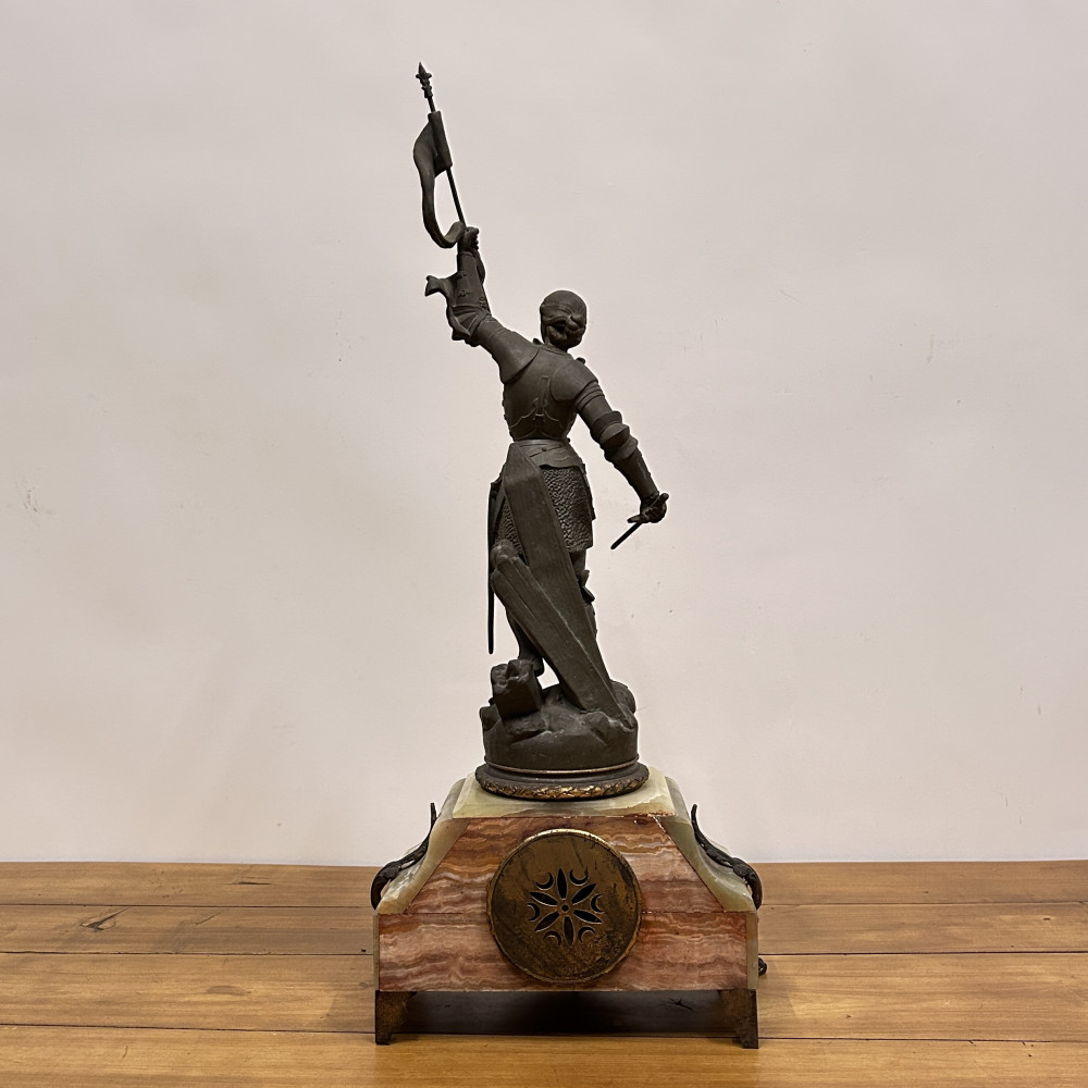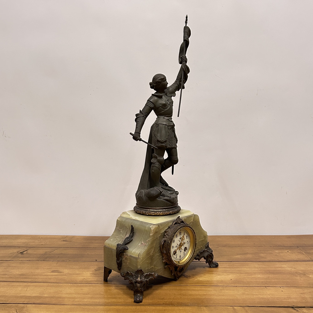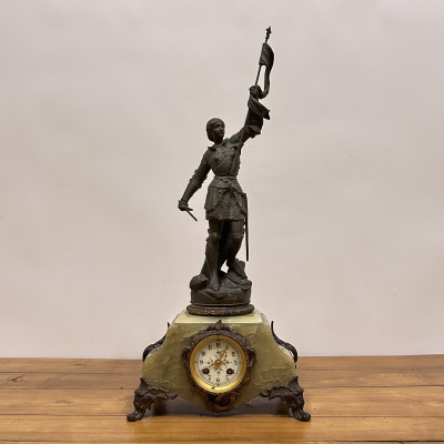 Figurální plastika zobrazuje Janu z Arku ve zbroji, s mečem v jedné ruce a praporcem v druhé. Tato socha je často připisována francouzskému sochaři Josephu Berthozovi a označuje se názvem Jeanne d'Arc au Combat (Jana z Arku v boji). Hodiny jsou usazeny v obdélníkové základně, typicky vyrobené ze zeleného mramoru s ozdobnými bronzovými doplňky a nožkami.