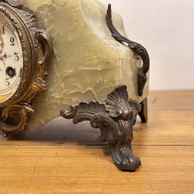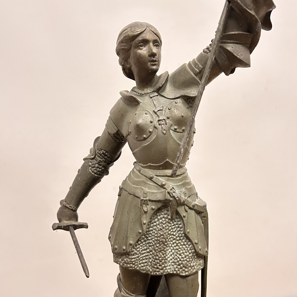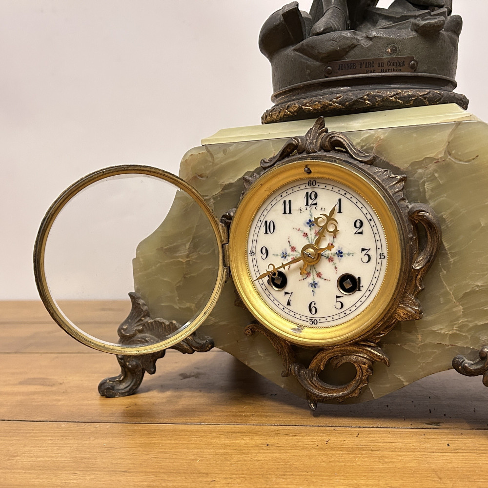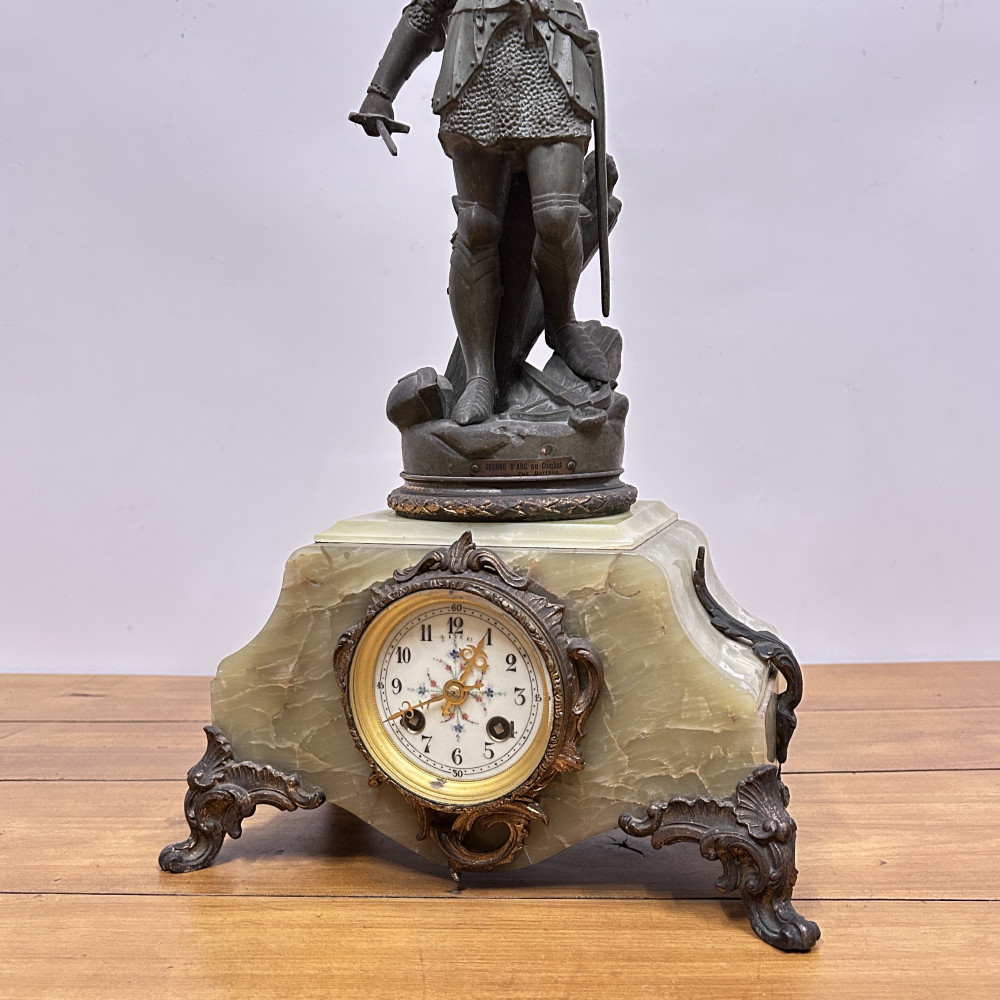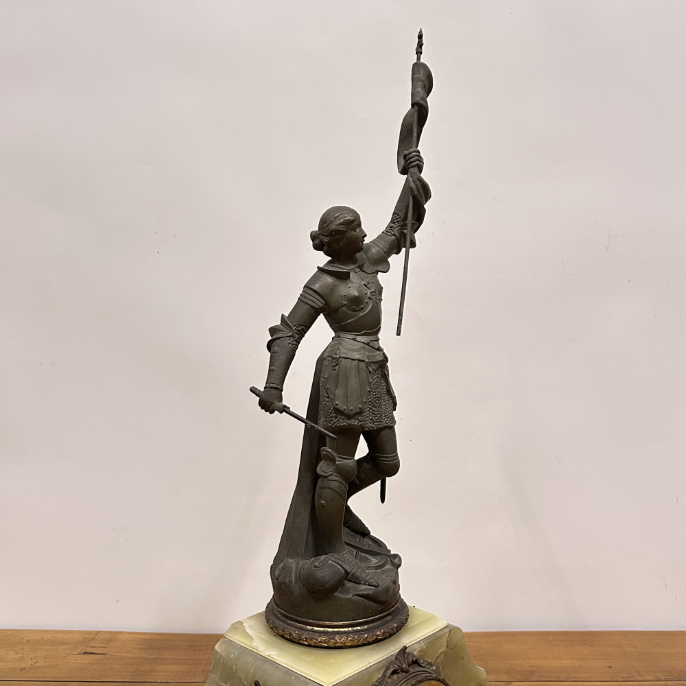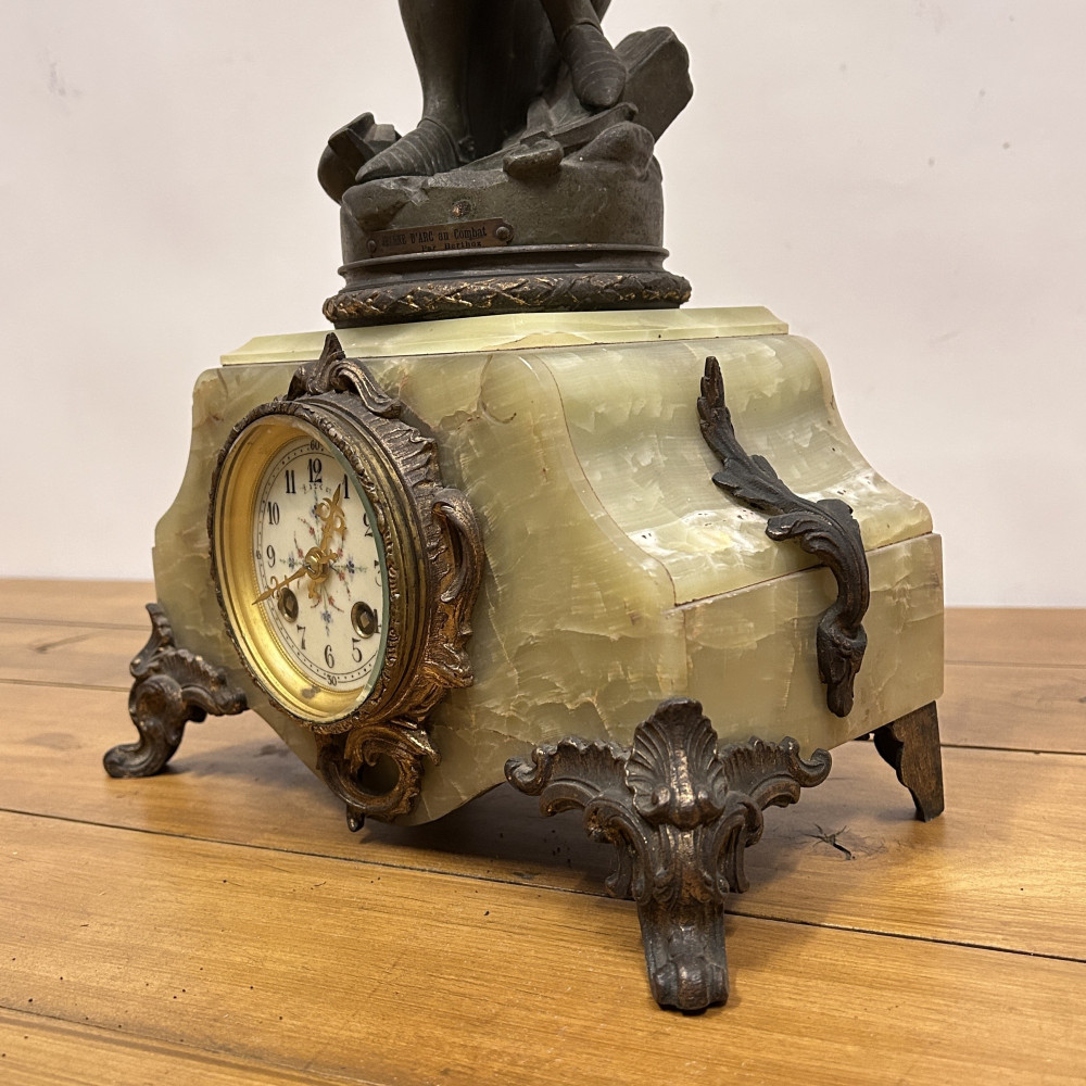 Figurální plastika zobrazuje Janu z Arku ve zbroji, s mečem v jedné ruce a praporcem v druhé. Tato socha je často připisována francouzskému sochaři Josephu Berthozovi a označuje se názvem Jeanne d'Arc au Combat (Jana z Arku v boji). Hodiny jsou usazeny v obdélníkové základně, typicky vyrobené ze zeleného mramoru s ozdobnými bronzovými doplňky a nožkami.