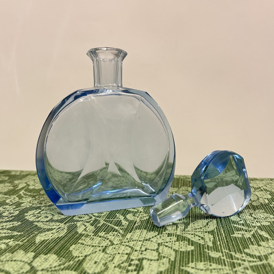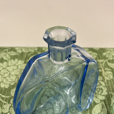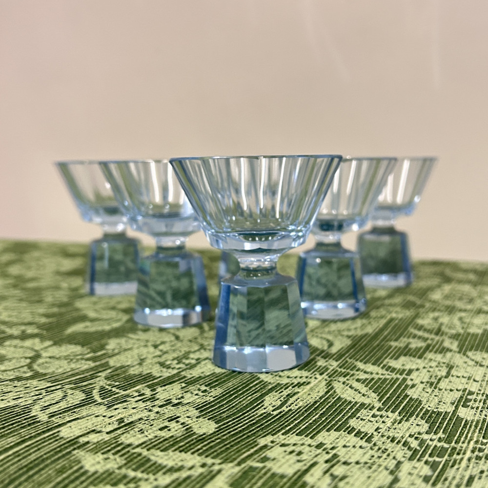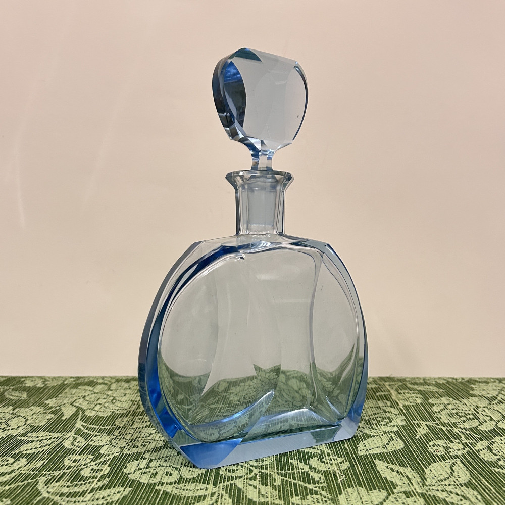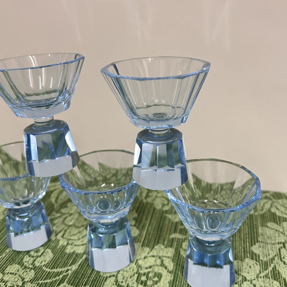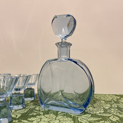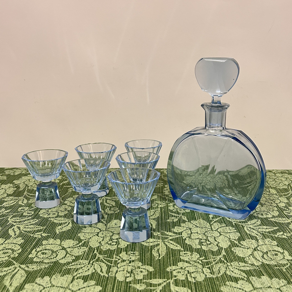 Likérová souprava ve stylu Art Deco, tato sada pochází pravděpodobně ze 30. let 20. století a je vyrobena z blankytně modrého fazetově broušeného skla. Sada se skládá z karafy s broušenou zátkou a šesti frťánků na nízké patce.