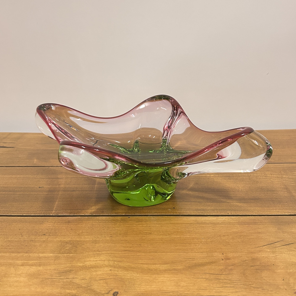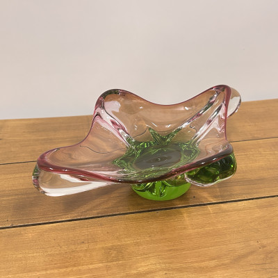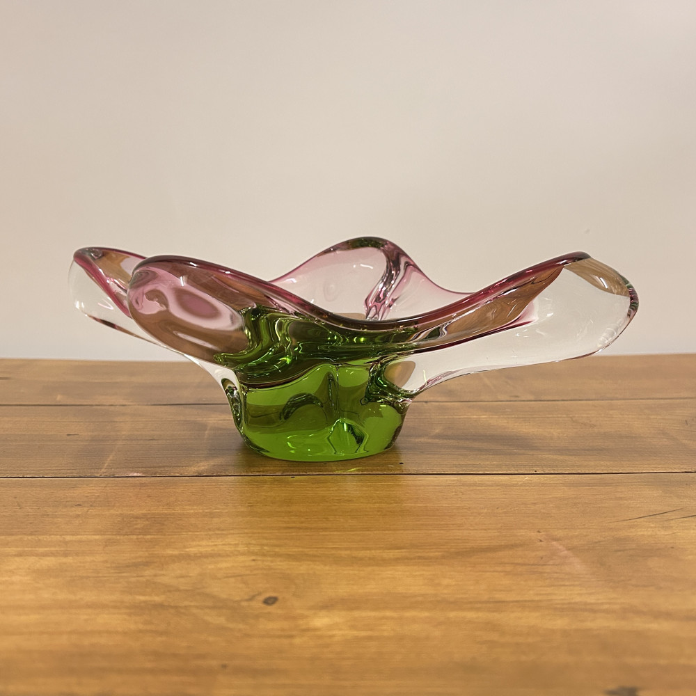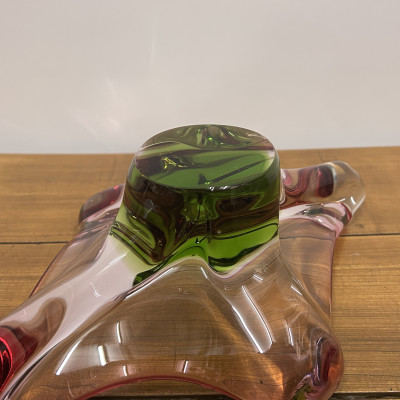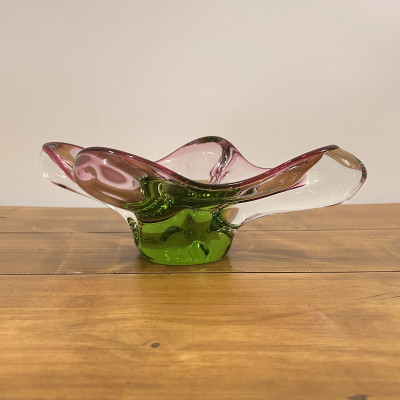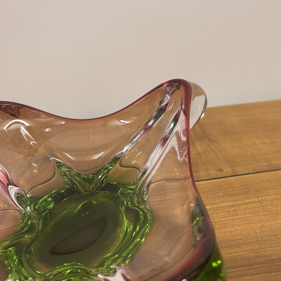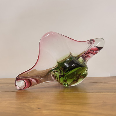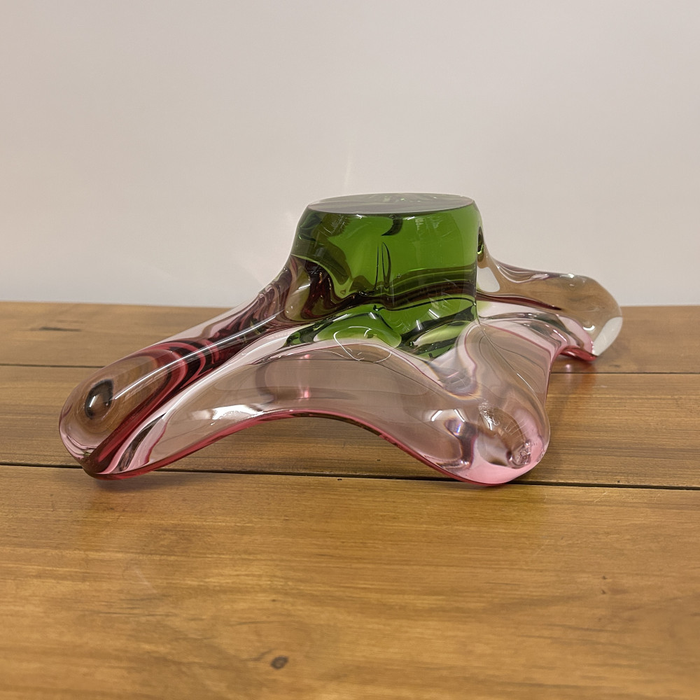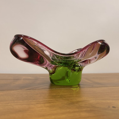 Miska z hutního skla Chřibská, 70. léta Elegantní miska z dílny sklárny Chřibská, navržená sklářem Josefem Hospodkou v 70. letech. Ručně tvarované hutní sklo v kombinaci růžové a zelené barvy vytváří jedinečný plastický efekt, typický pro tvorbu této slavné sklárny. Originální dekorativní kus, který potěší milovníky českého designu i sběratele uměleckého skla.
