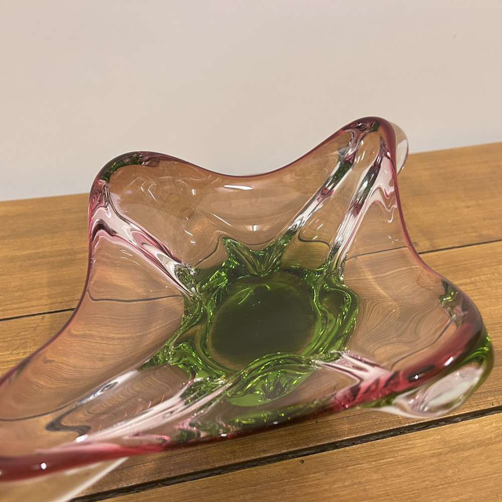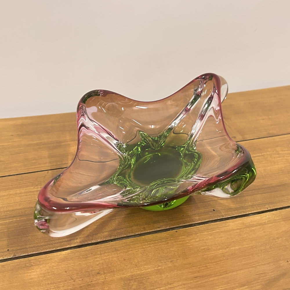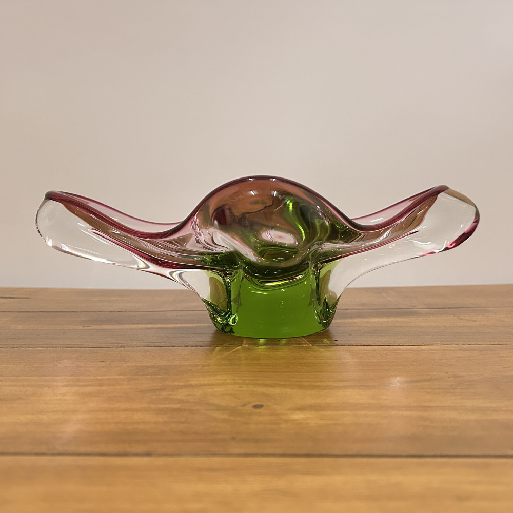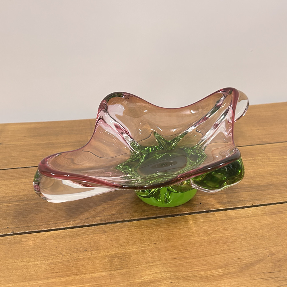 Miska z hutního skla Chřibská, 70. léta Elegantní miska z dílny sklárny Chřibská, navržená sklářem Josefem Hospodkou v 70. letech. Ručně tvarované hutní sklo v kombinaci růžové a zelené barvy vytváří jedinečný plastický efekt, typický pro tvorbu této slavné sklárny. Originální dekorativní kus, který potěší milovníky českého designu i sběratele uměleckého skla.