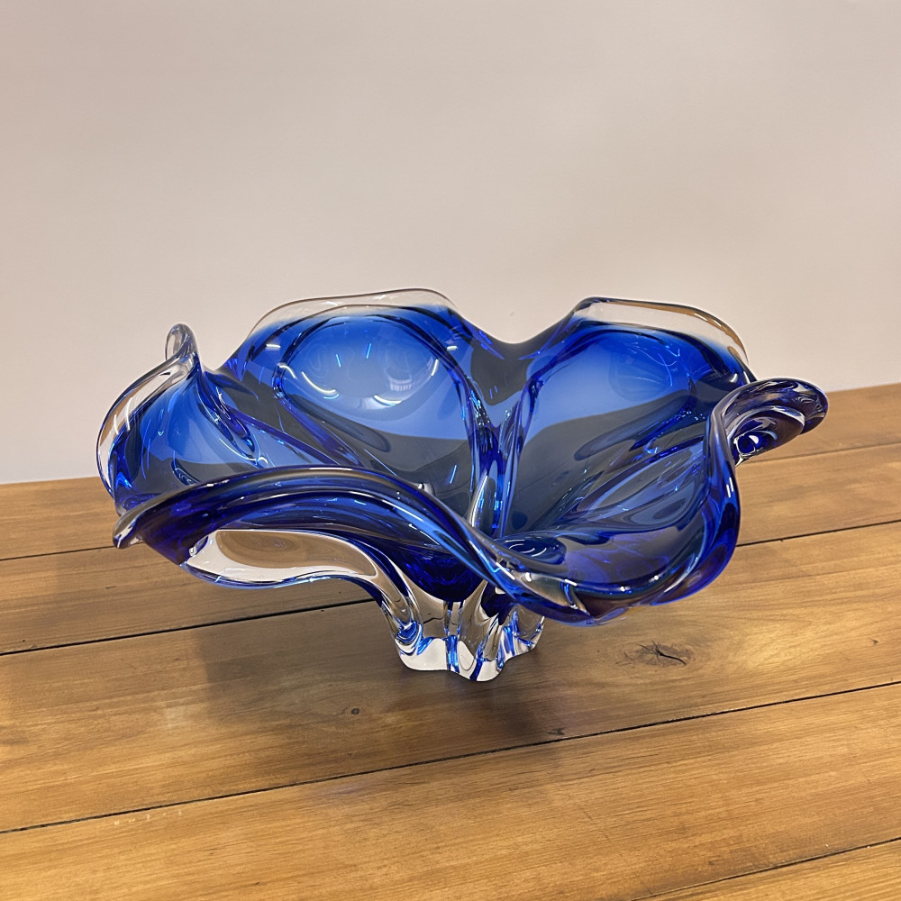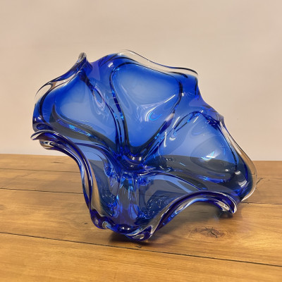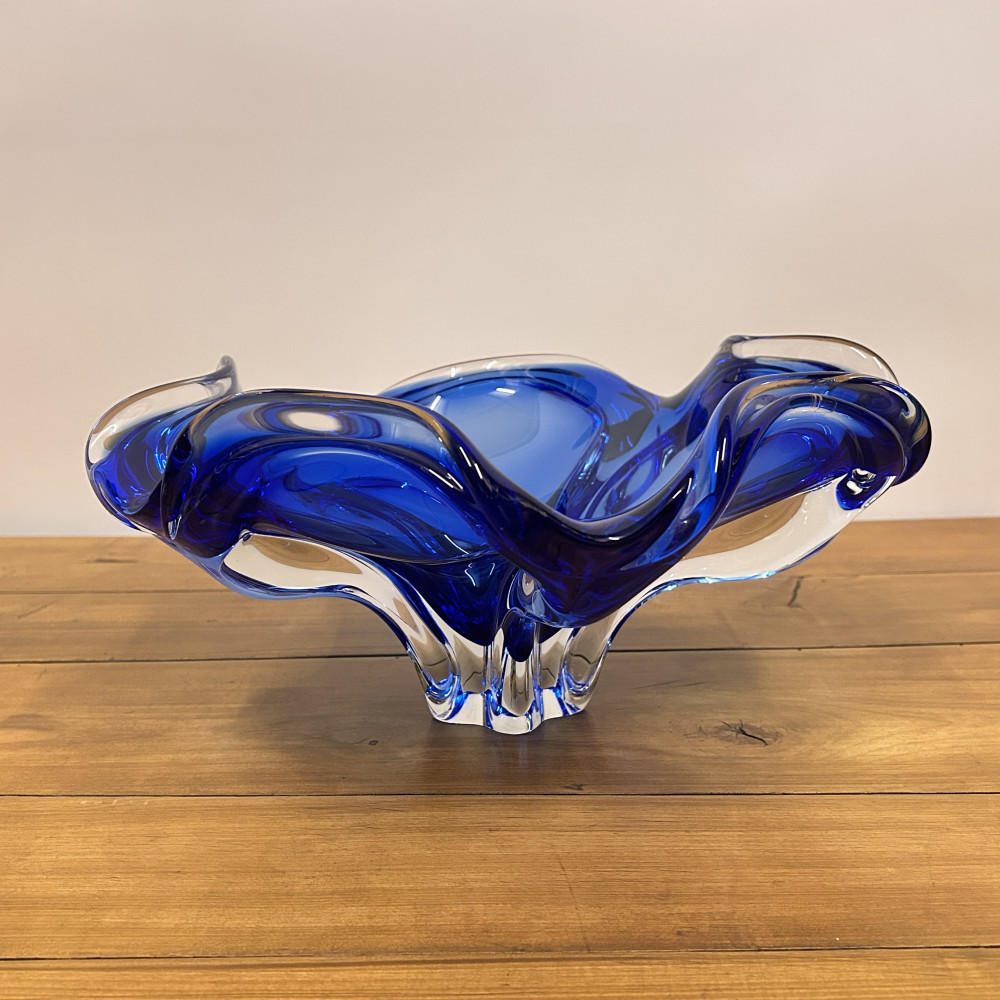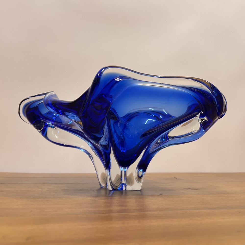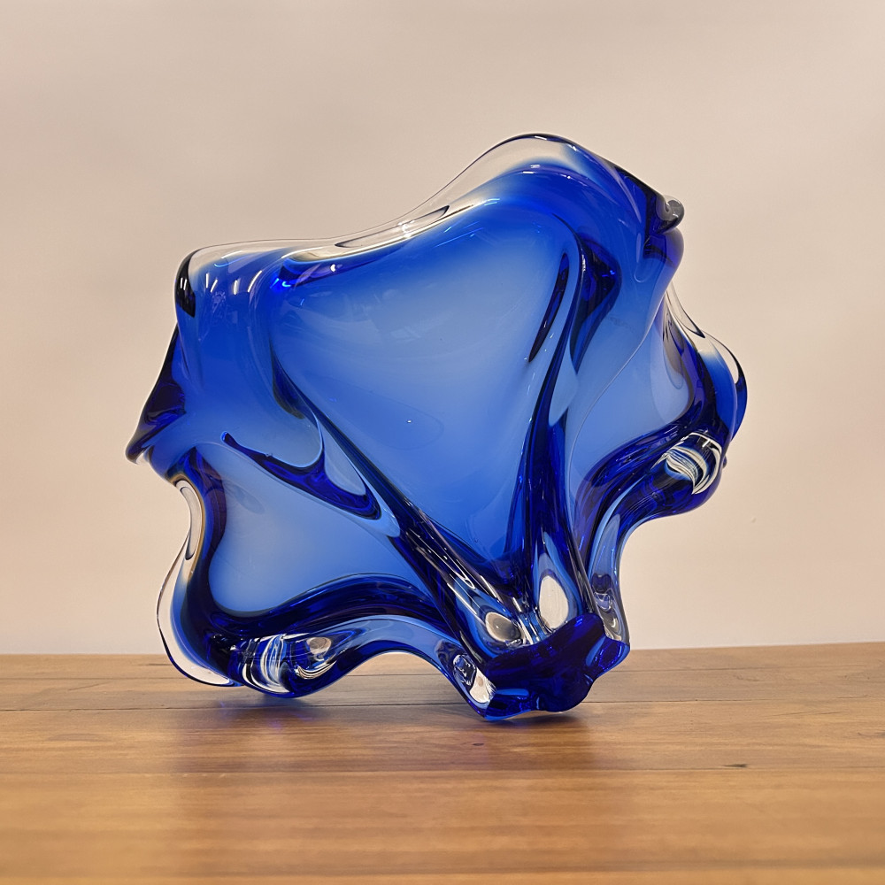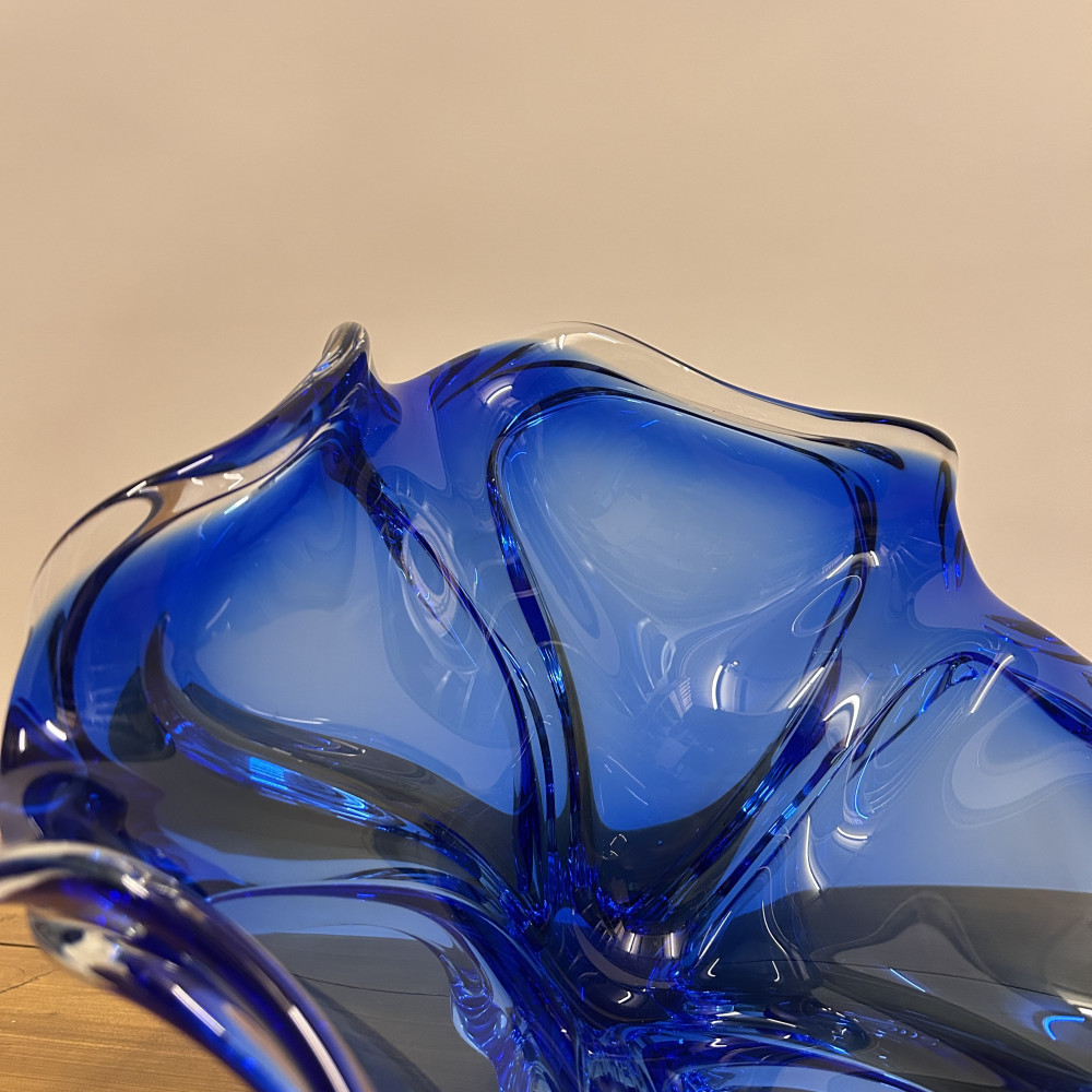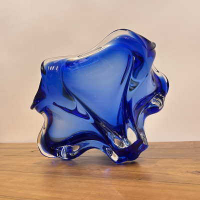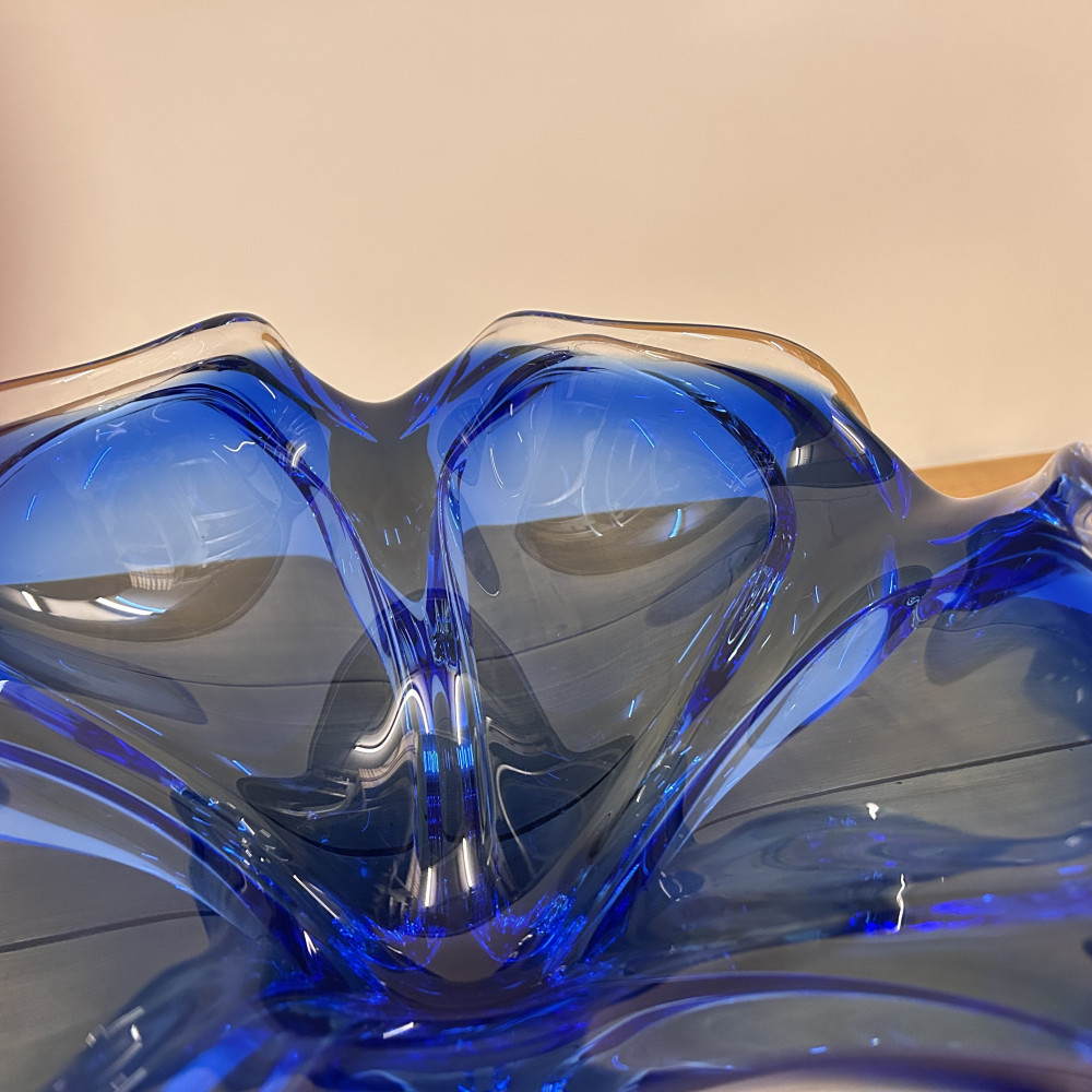 Dekorativní mísa z hutního skla v krásném odstínu modré barvy. Originální tvar s jemně zvlněnými okraji působí moderně a elegantně. Vhodná jako výrazný dekorační prvek, miska na ovoce nebo designový doplněk do obývacího pokoje, jídelny či kanceláře.