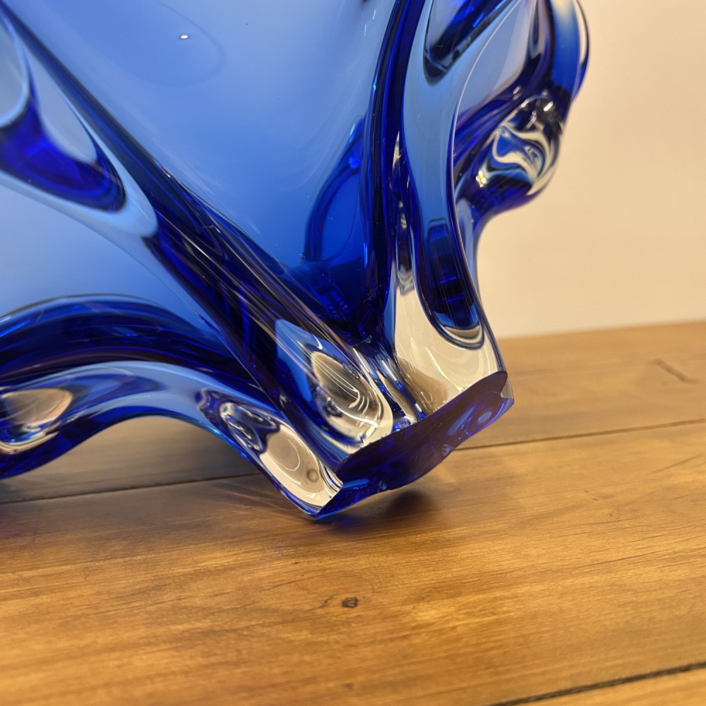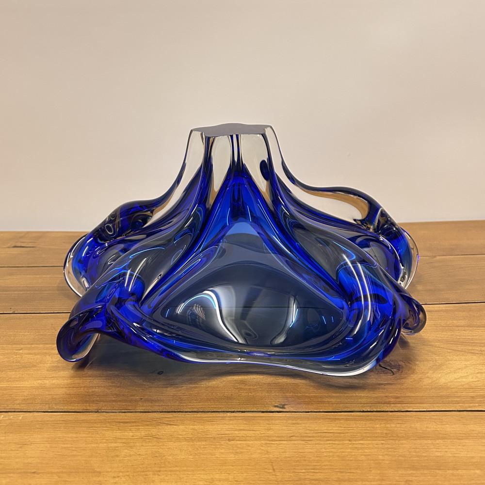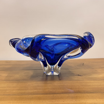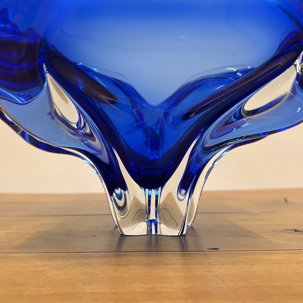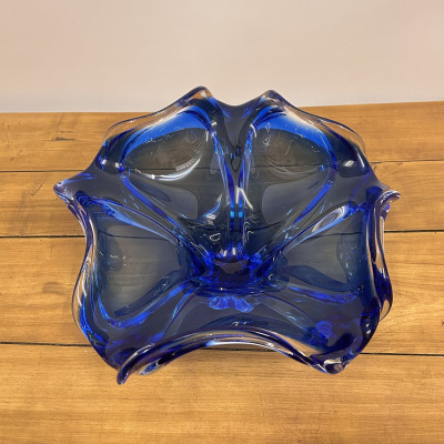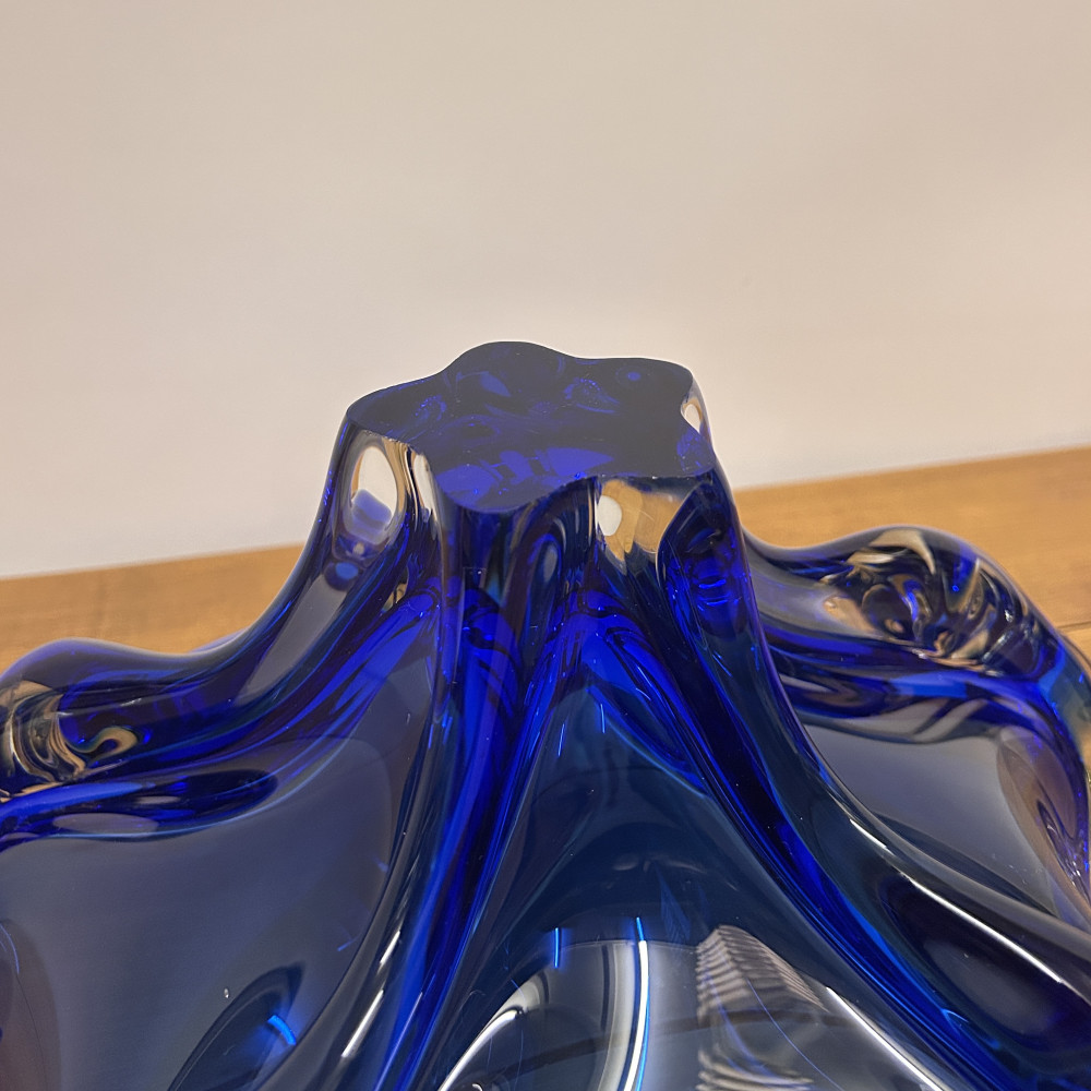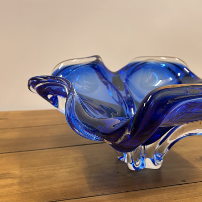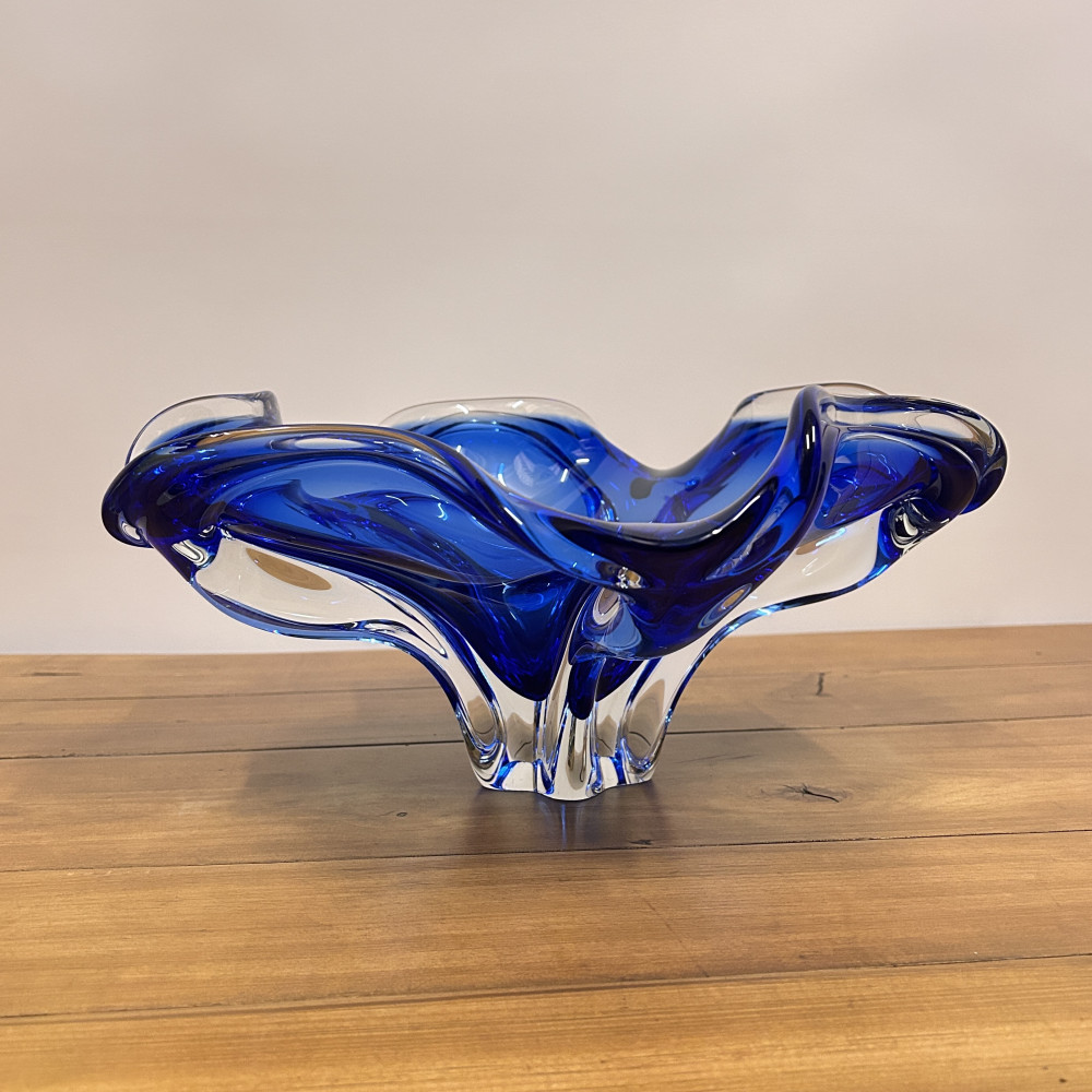 Dekorativní mísa z hutního skla v krásném odstínu modré barvy. Originální tvar s jemně zvlněnými okraji působí moderně a elegantně. Vhodná jako výrazný dekorační prvek, miska na ovoce nebo designový doplněk do obývacího pokoje, jídelny či kanceláře.