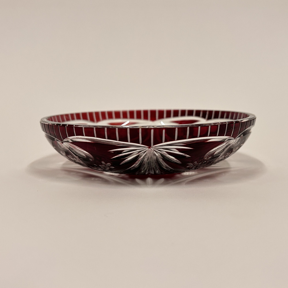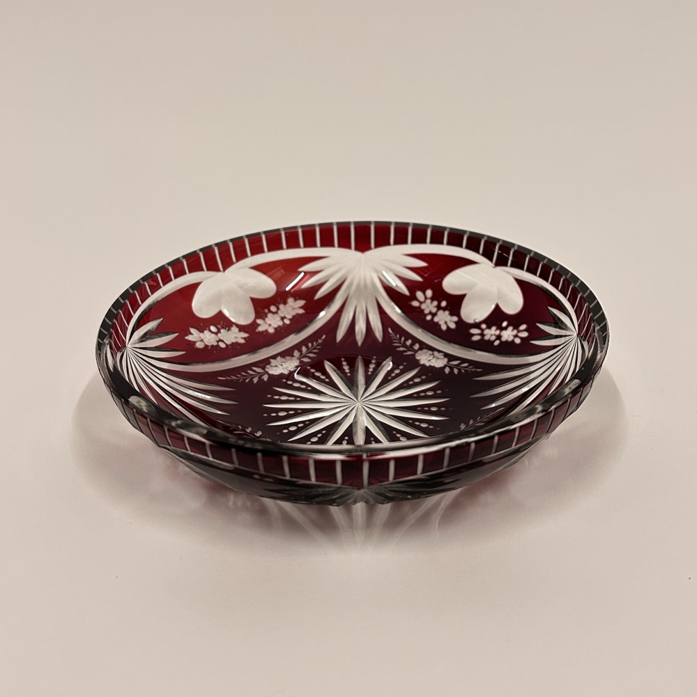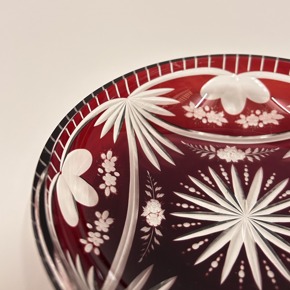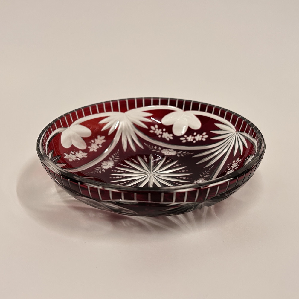 Menší servírovací mistička z čirého skla a rubínovou lazurou. Bohatě zdobena květinovým vzorem po celém obvodu.
