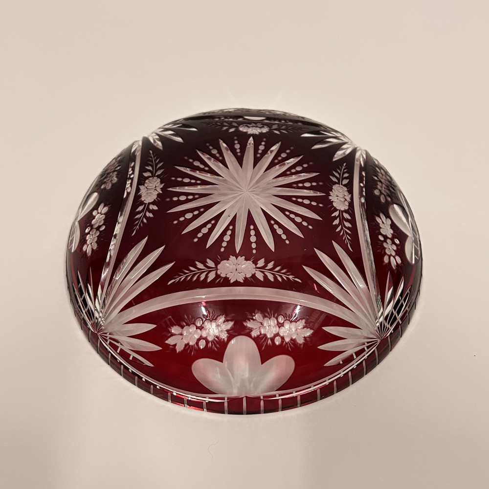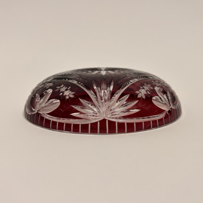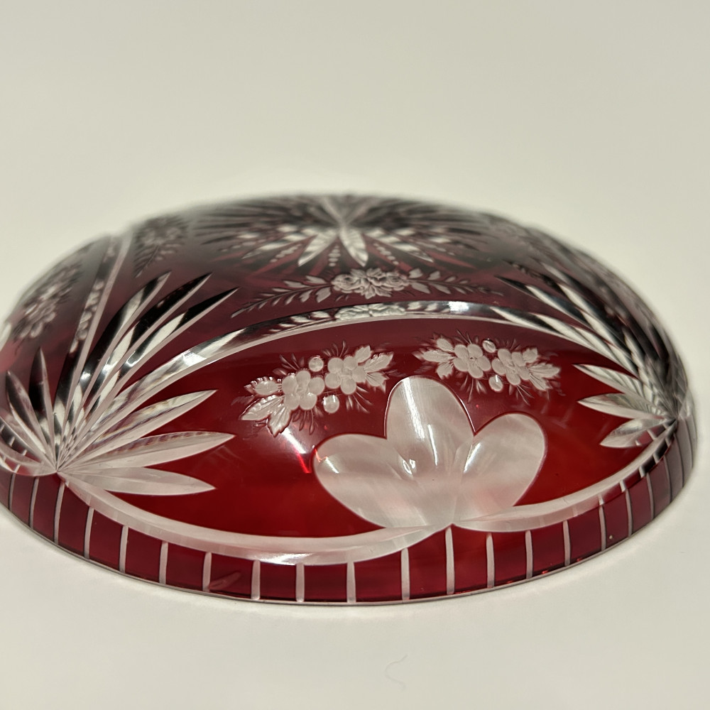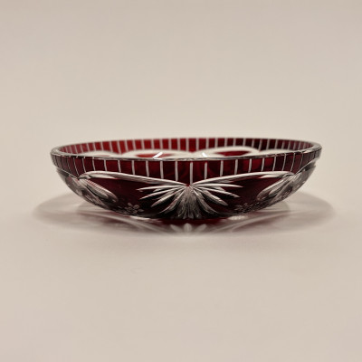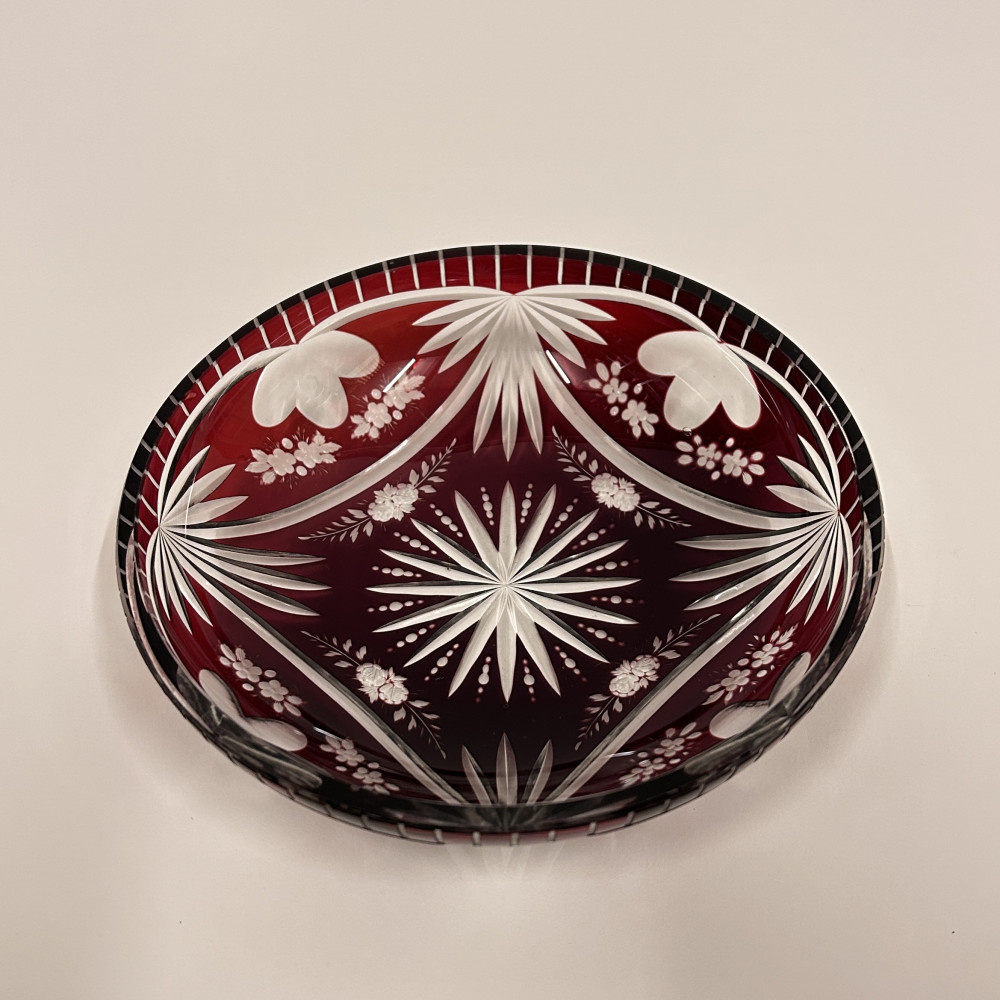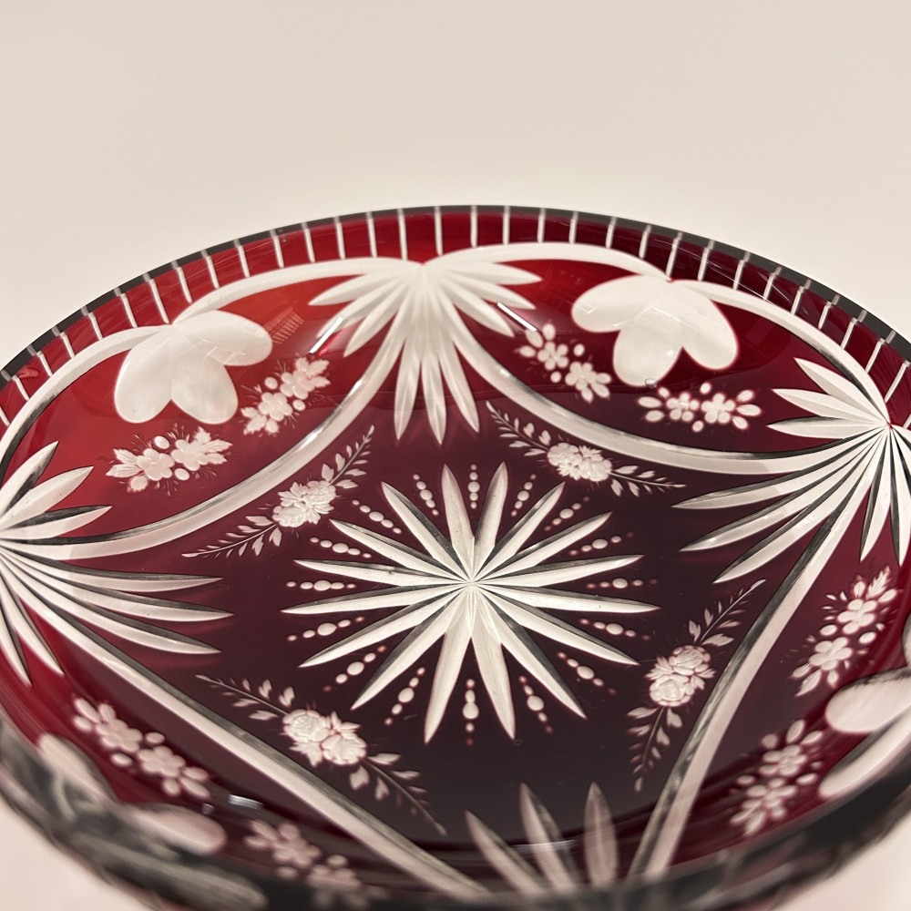 Menší servírovací mistička z čirého skla a rubínovou lazurou. Bohatě zdobena květinovým vzorem po celém obvodu.