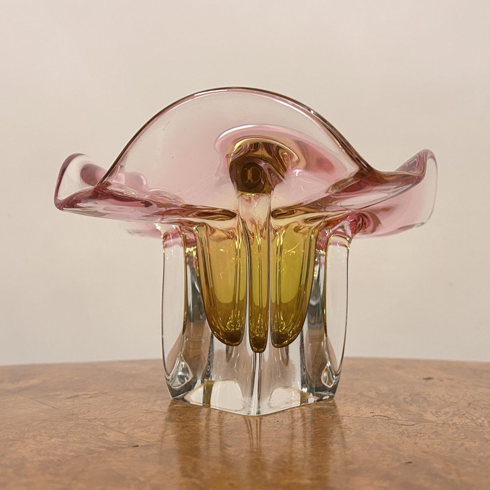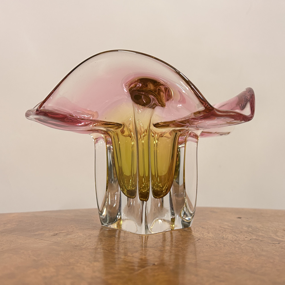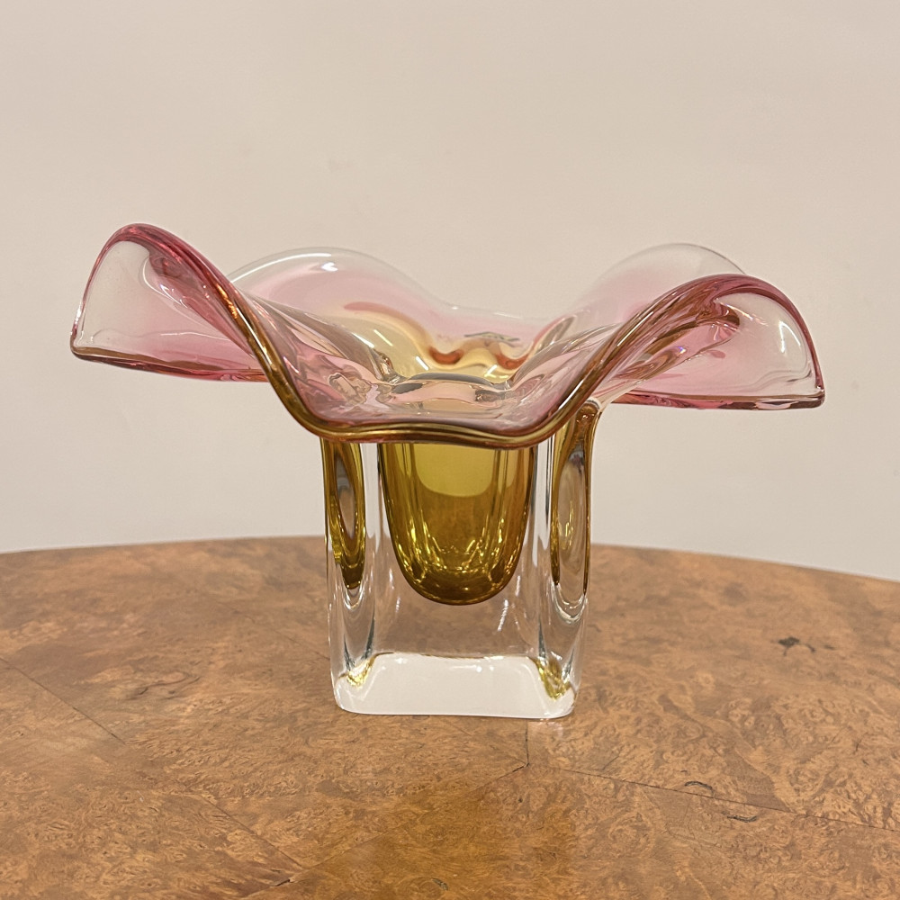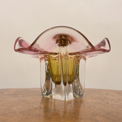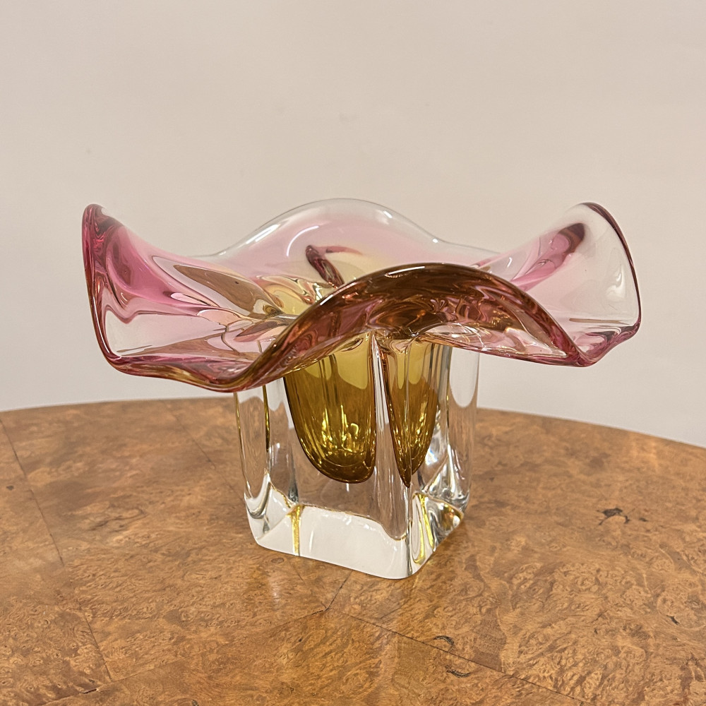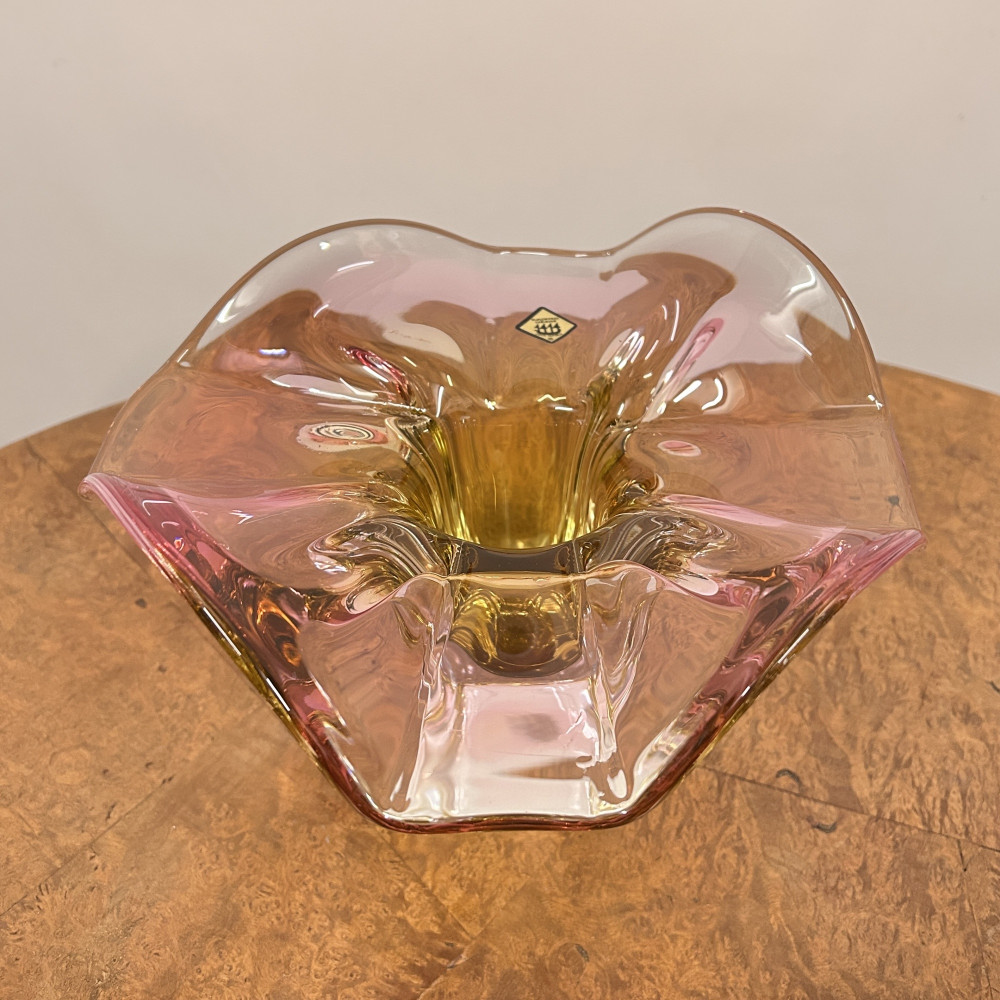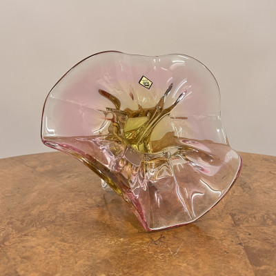 miska ve tvaru košíku z hutního skla, zeleno-brusinkově červený nádech