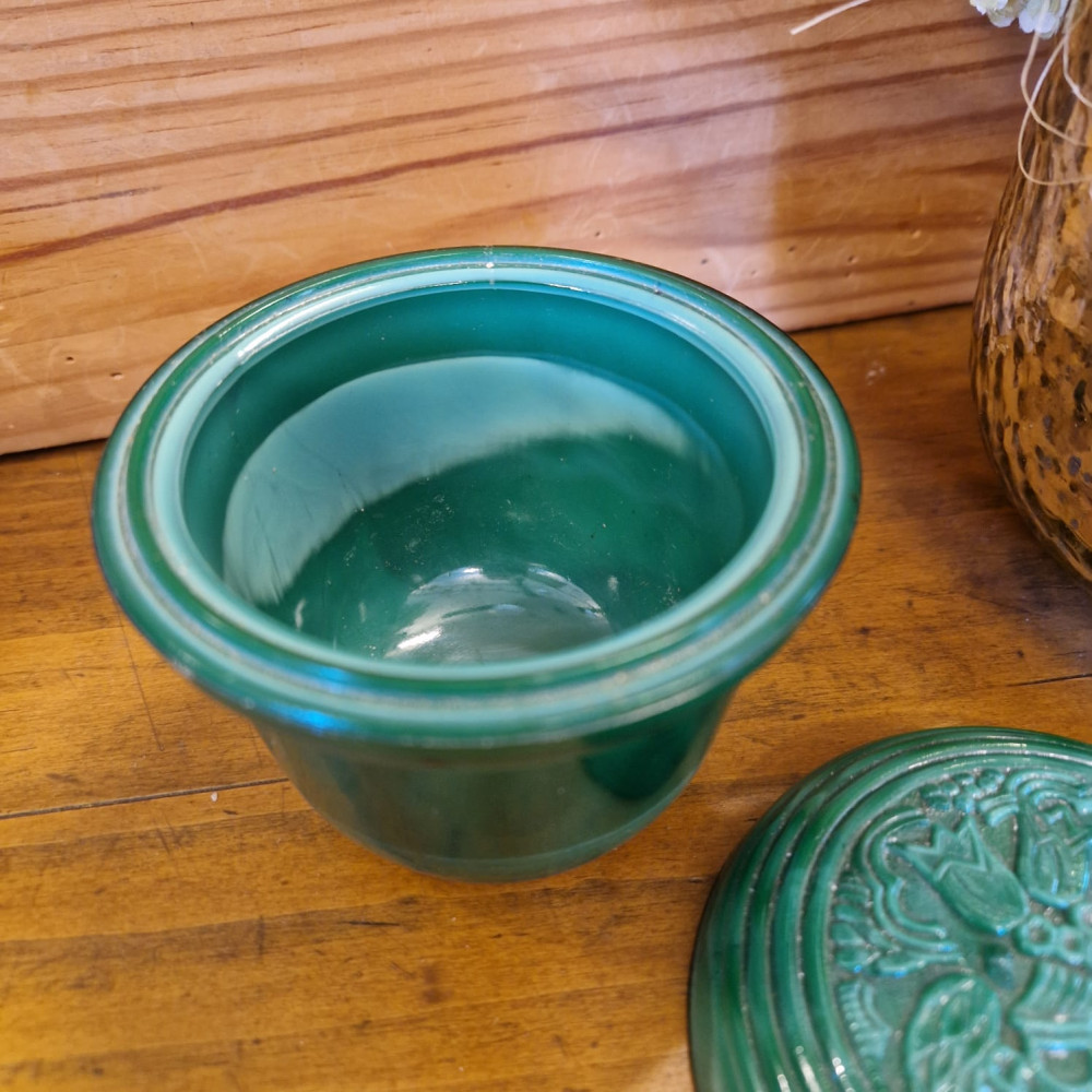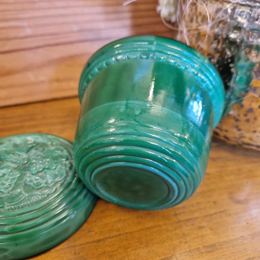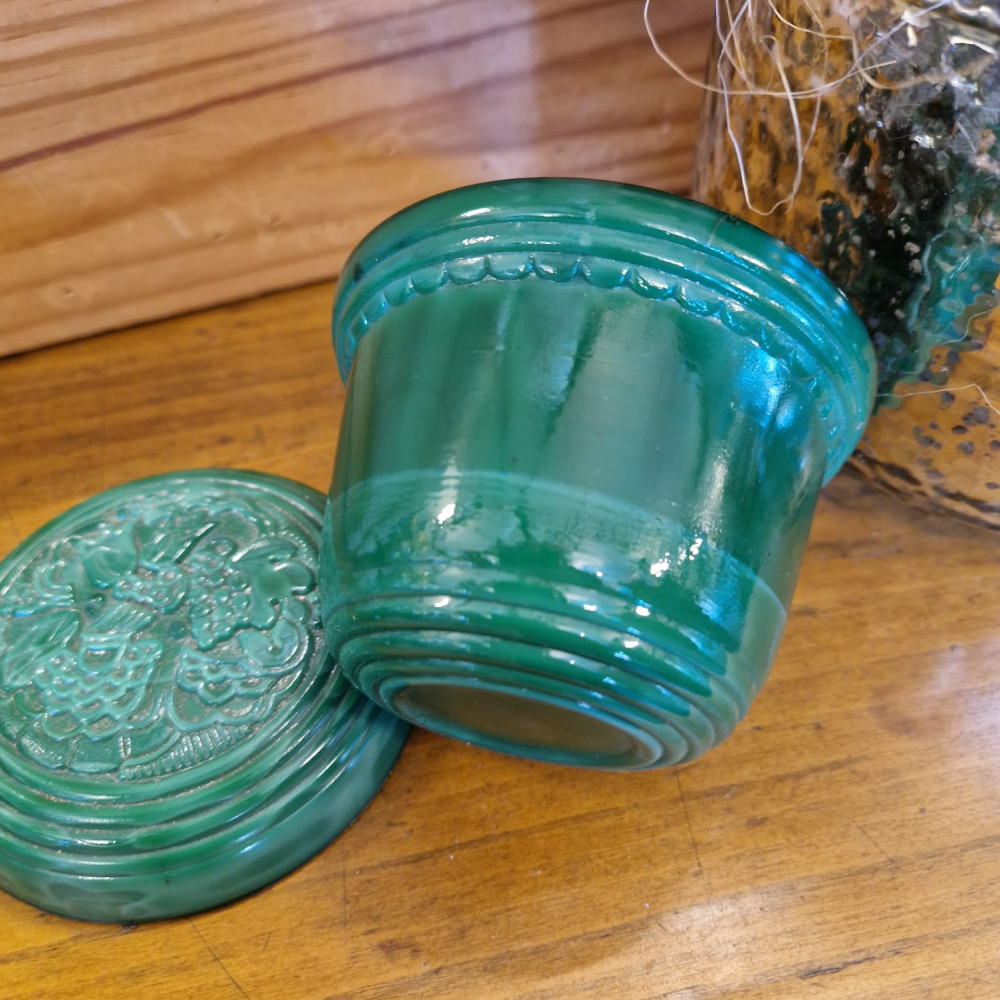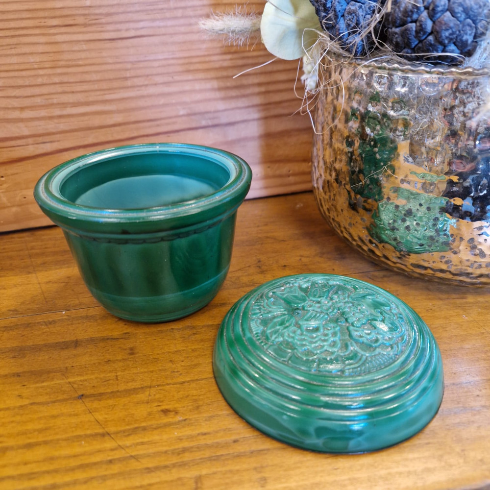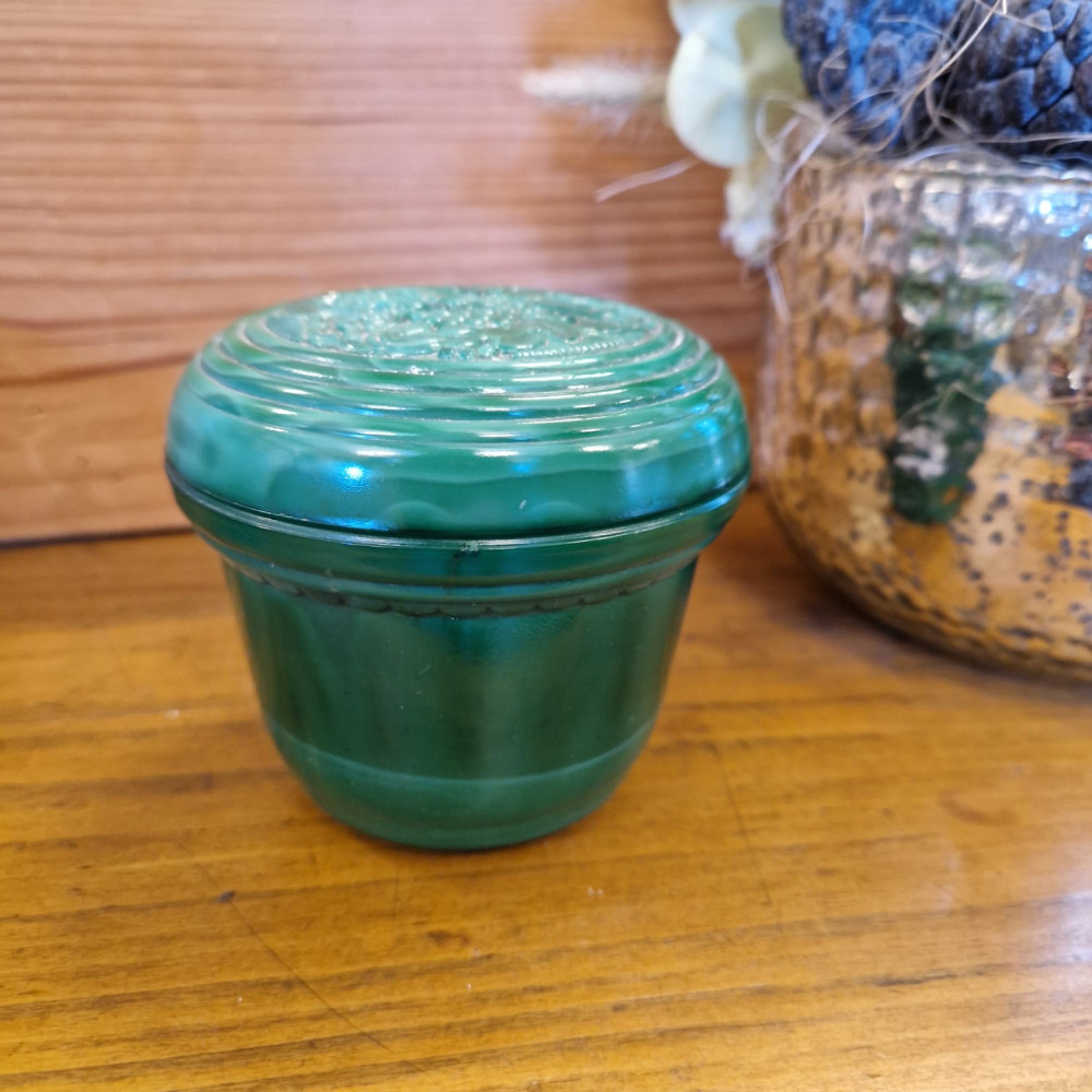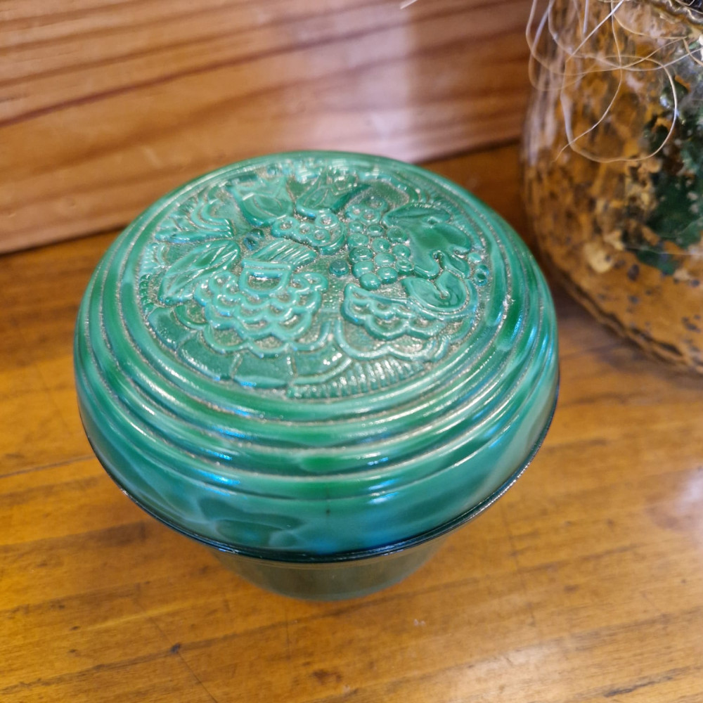 Starožitná dóza ze zeleného malachitového skla, známého také jako jade sklo. Tento typ skla byl vyráběn od 30. let 20. století, zejména v Jablonci nad Nisou. Dóza má květinový vzor, často označovaný jako "slunečnice".