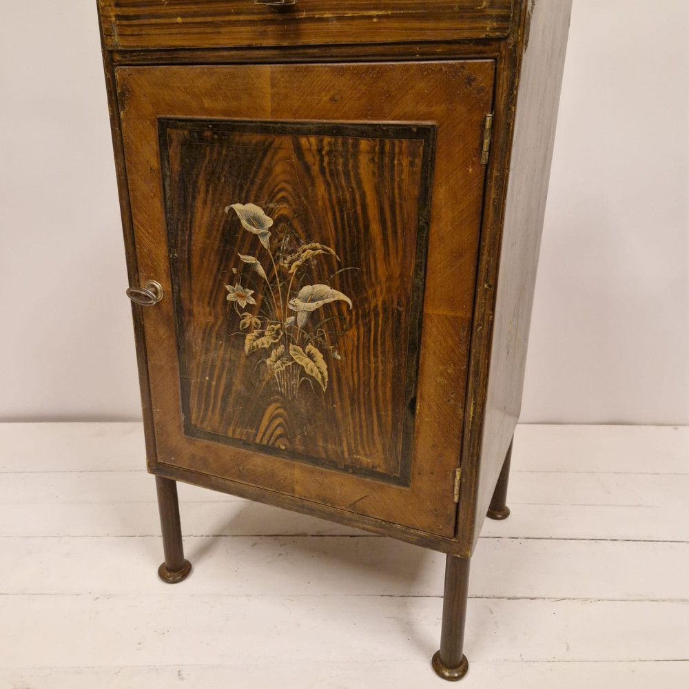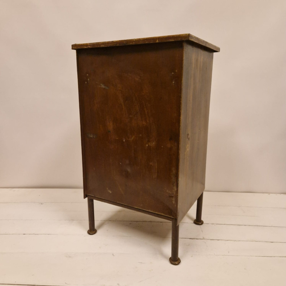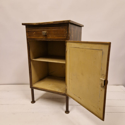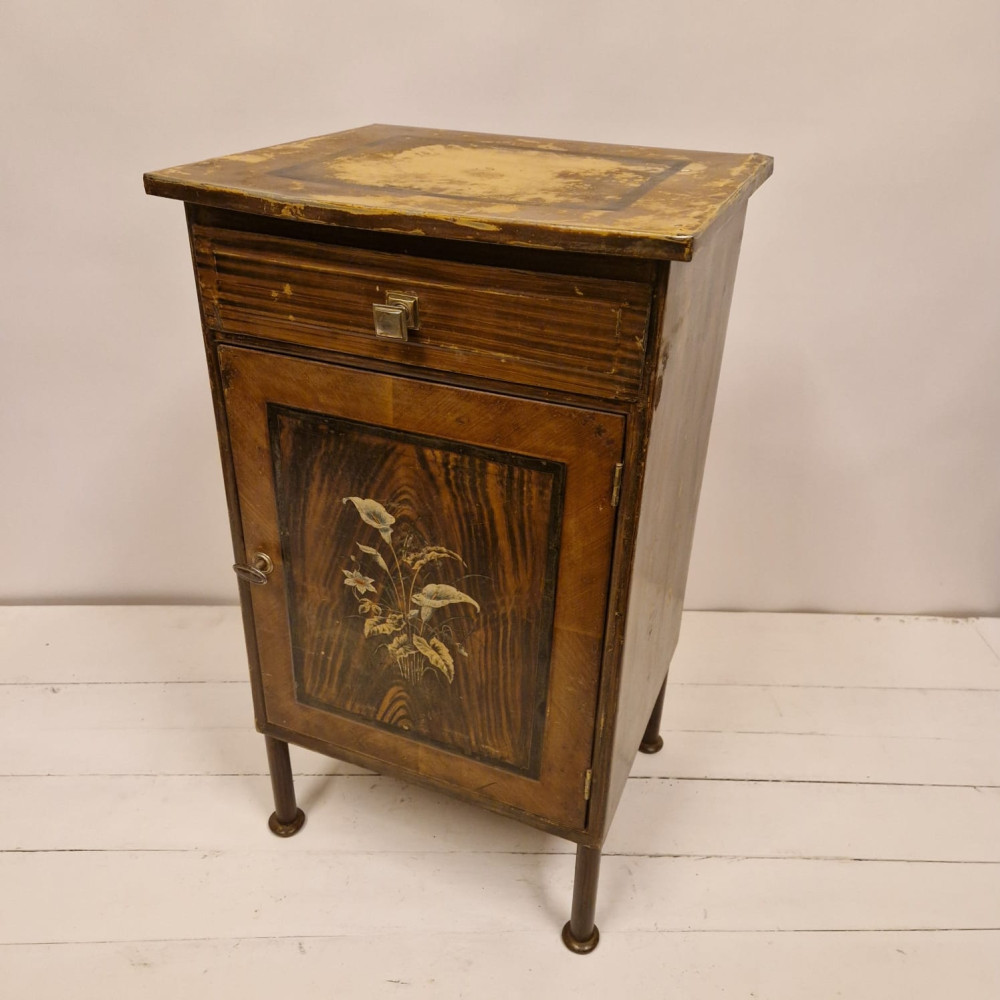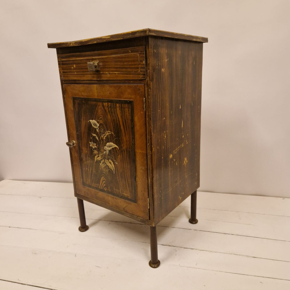 Plechový noční stolek s praktickým šuplíkem, dvířka jsou zdobena jemným květinovým dekorem.