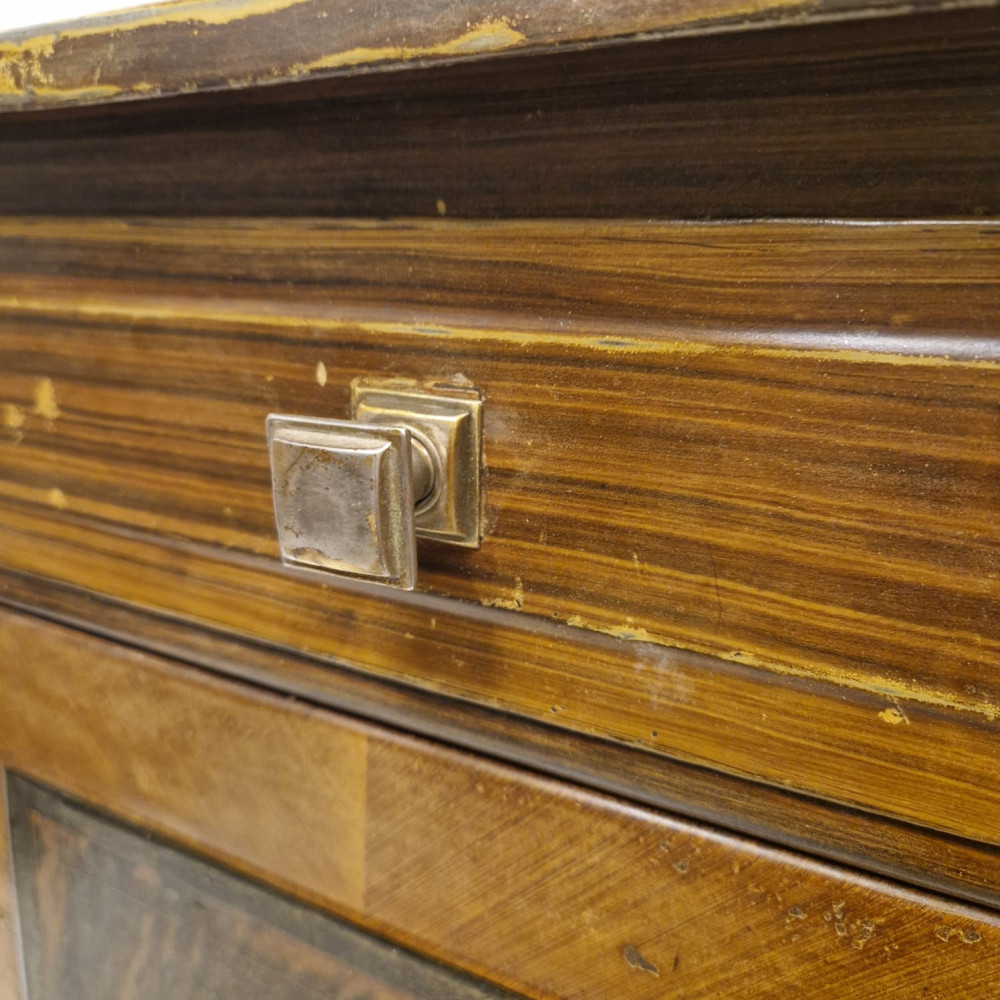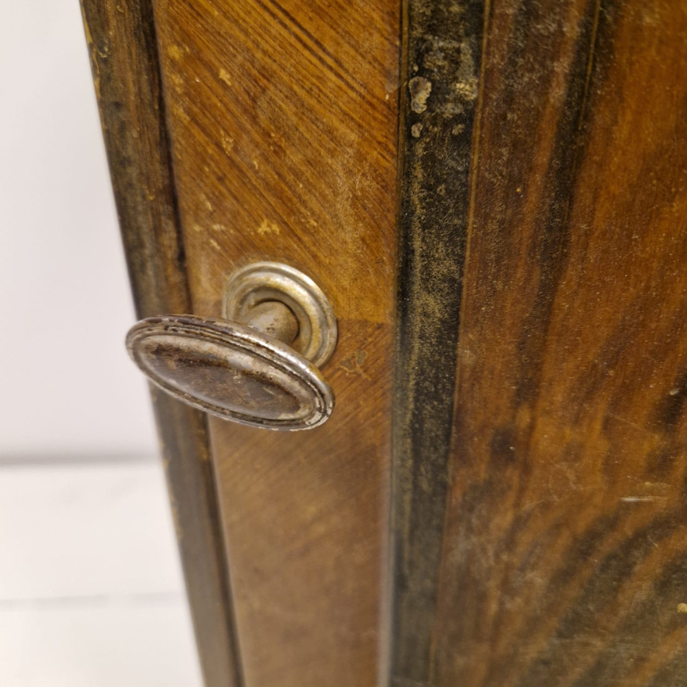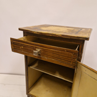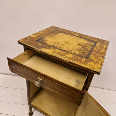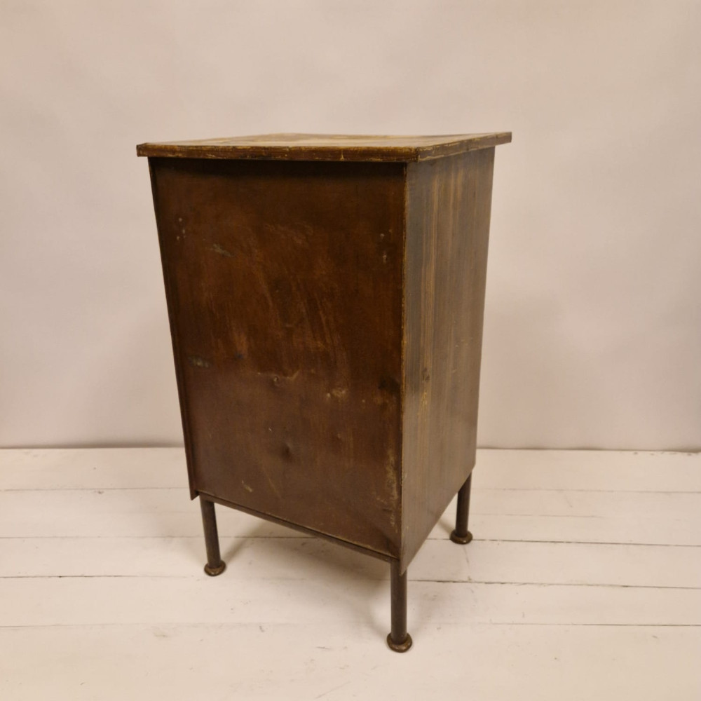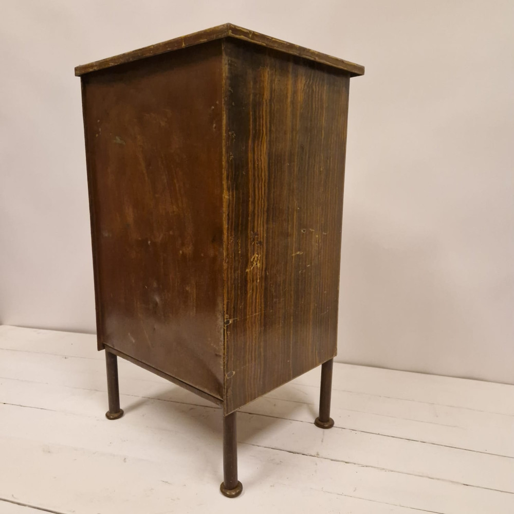 Plechový noční stolek s praktickým šuplíkem, dvířka jsou zdobena jemným květinovým dekorem.