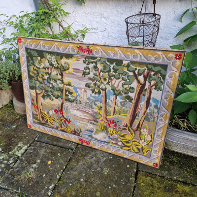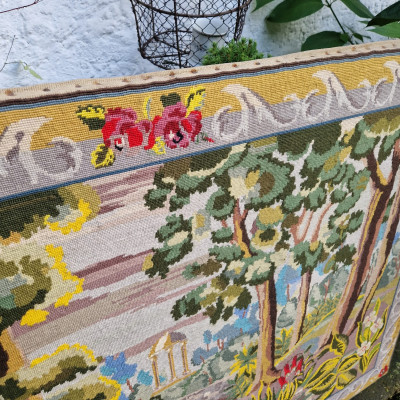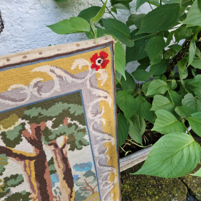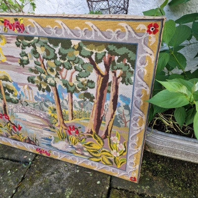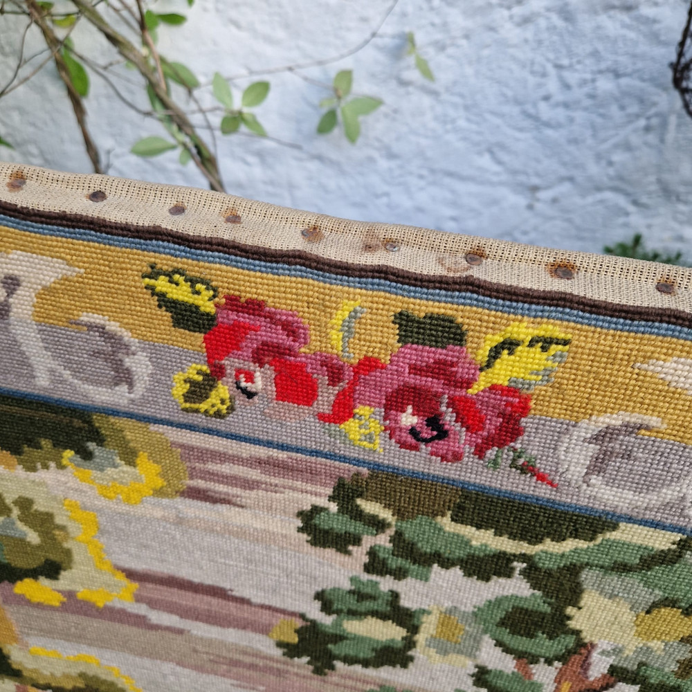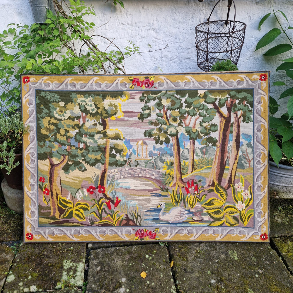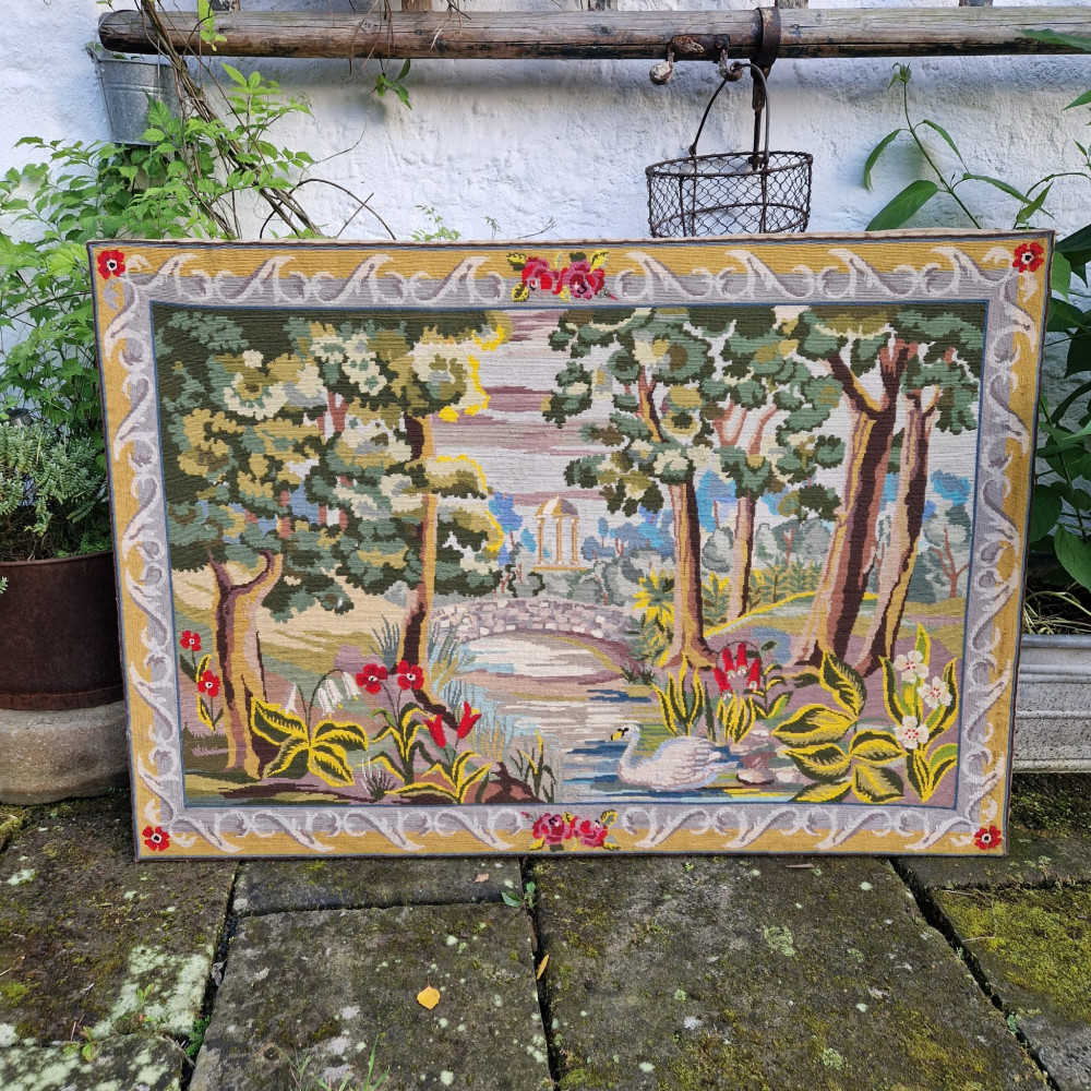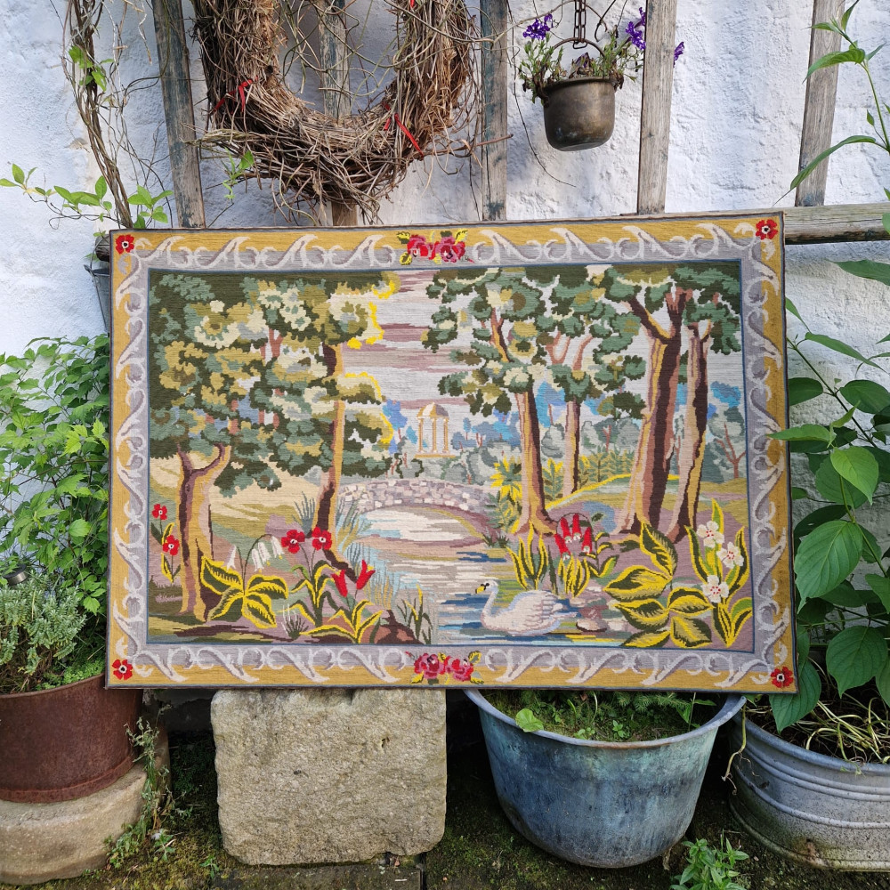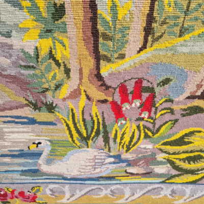 Krásná ručně vyšívaná tapiserie s jemně laděným romantickým motivem. Scéna zobrazuje malebný lesní park s kamenným můstkem, potůčkem a bílou labutí na vodní hladině. Okolní květiny v sytých barvách a vzdálené antické sloupoví dodávají obrazu nádech elegance a klidu.