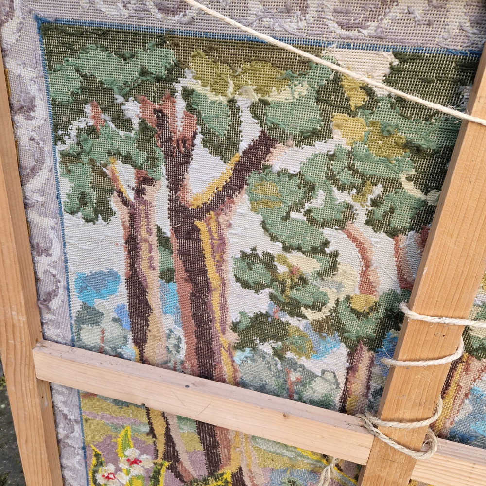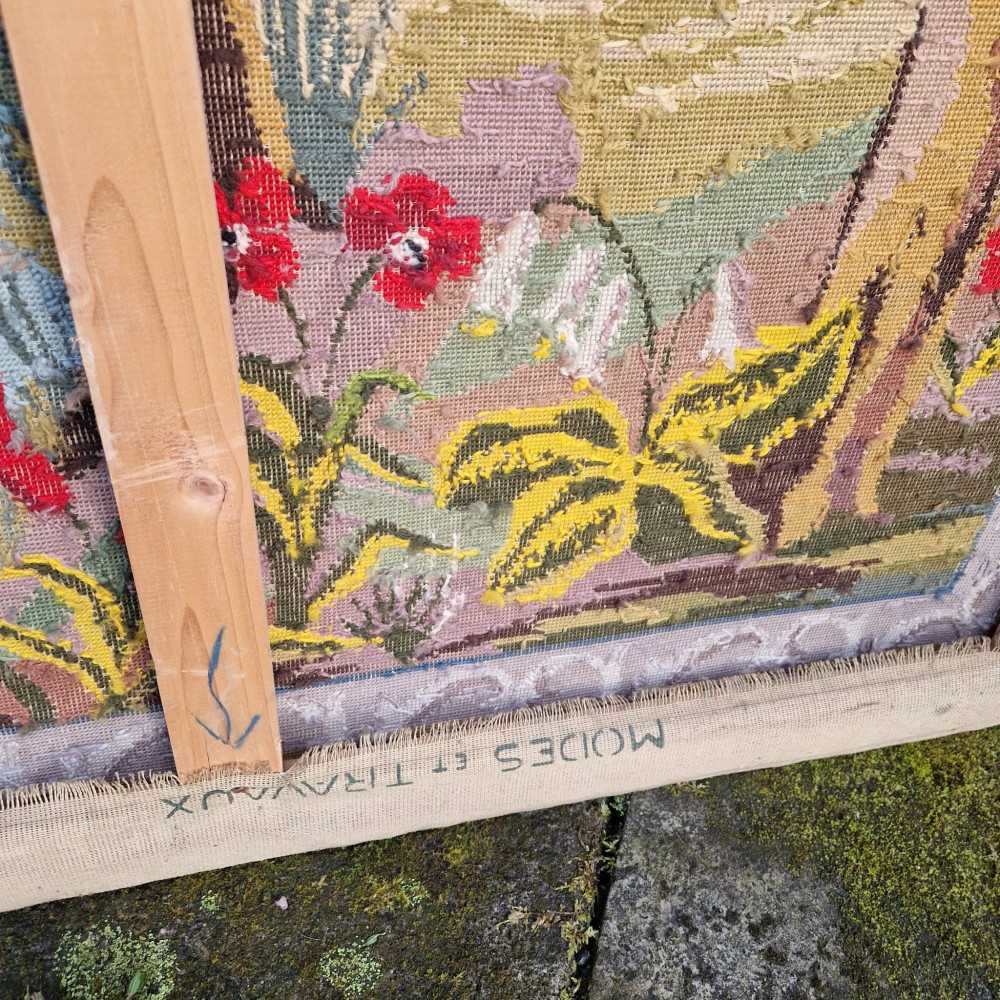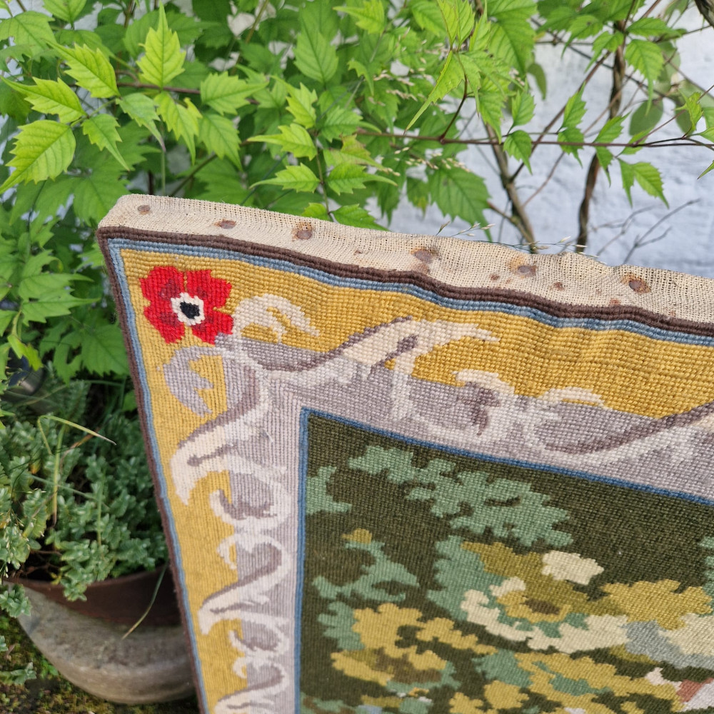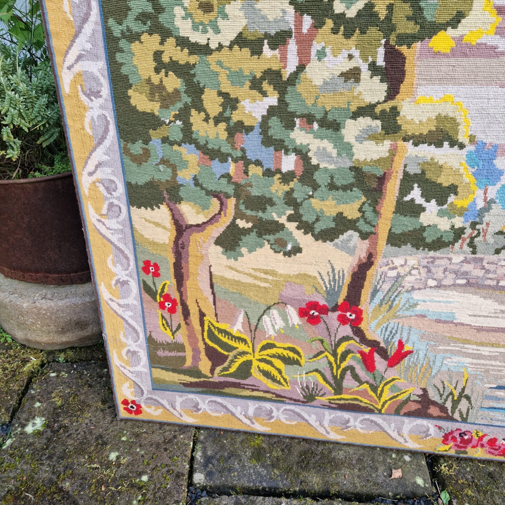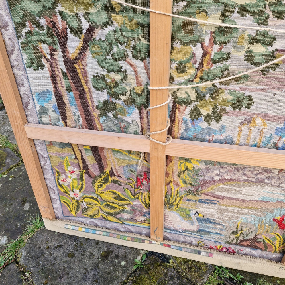 Krásná ručně vyšívaná tapiserie s jemně laděným romantickým motivem. Scéna zobrazuje malebný lesní park s kamenným můstkem, potůčkem a bílou labutí na vodní hladině. Okolní květiny v sytých barvách a vzdálené antické sloupoví dodávají obrazu nádech elegance a klidu.