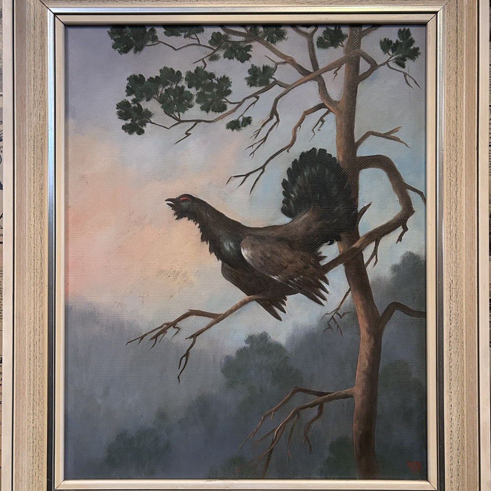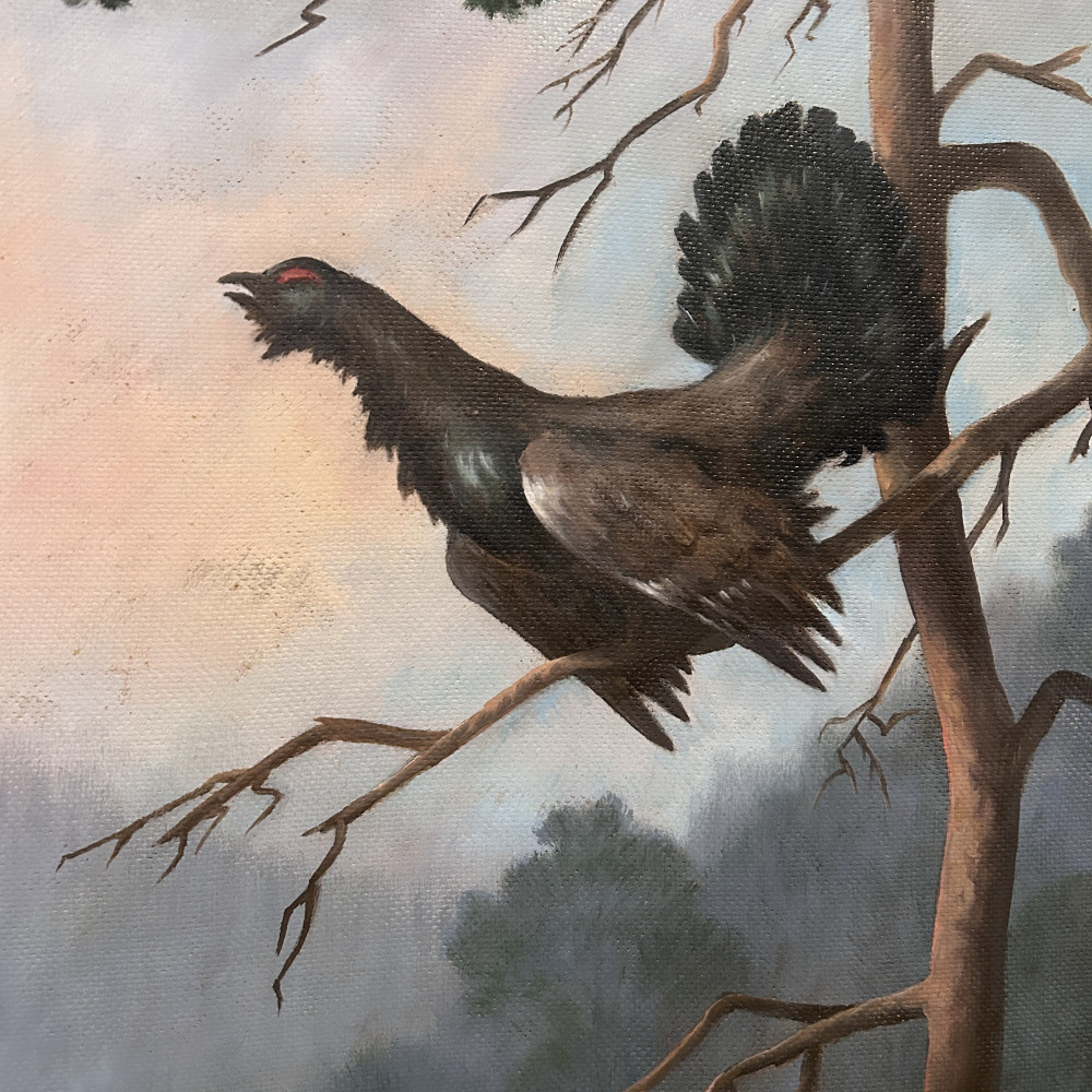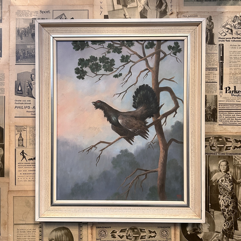Olejomalba na desce, která zobrazuje tetřeva na stromě. Obraz je signován, ačkoli podpis není jasně čitelný.