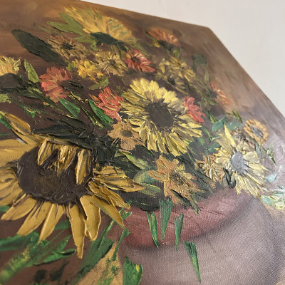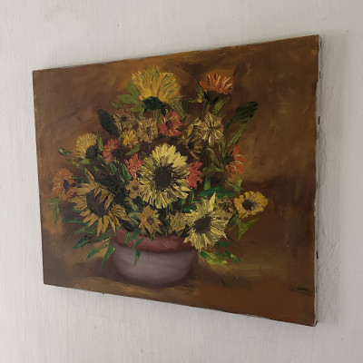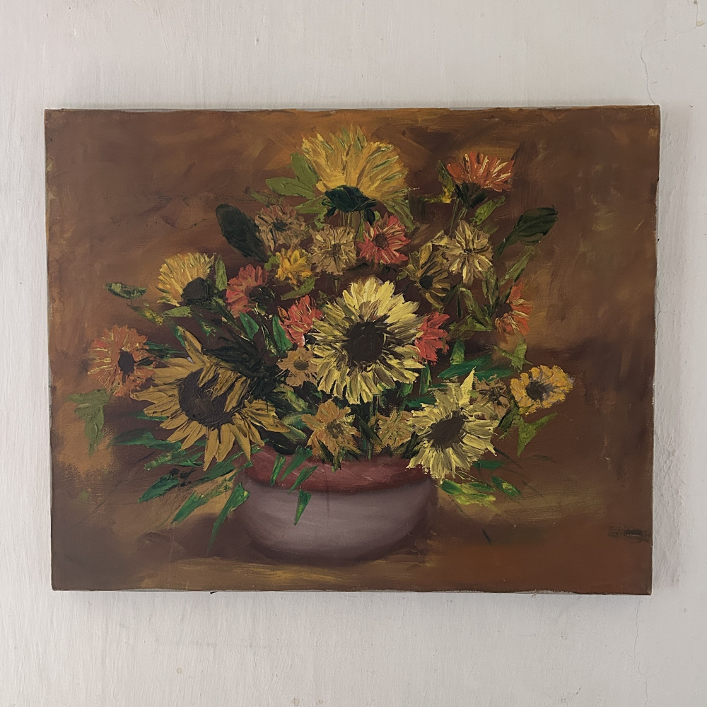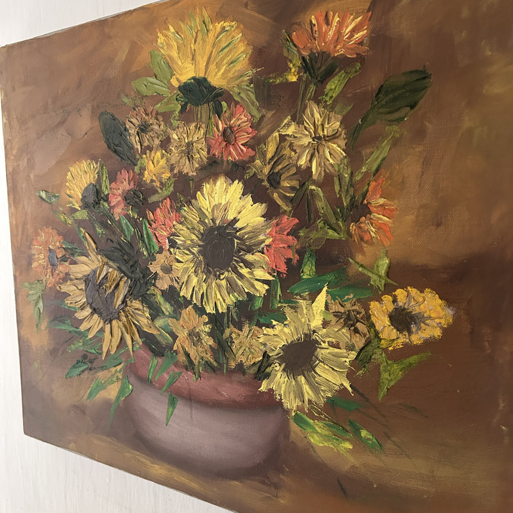 Obraz zachycuje bohatou kytici žlutých a oranžových slunečnic v nízké hnědé váze na tmavě hnědém pozadí.