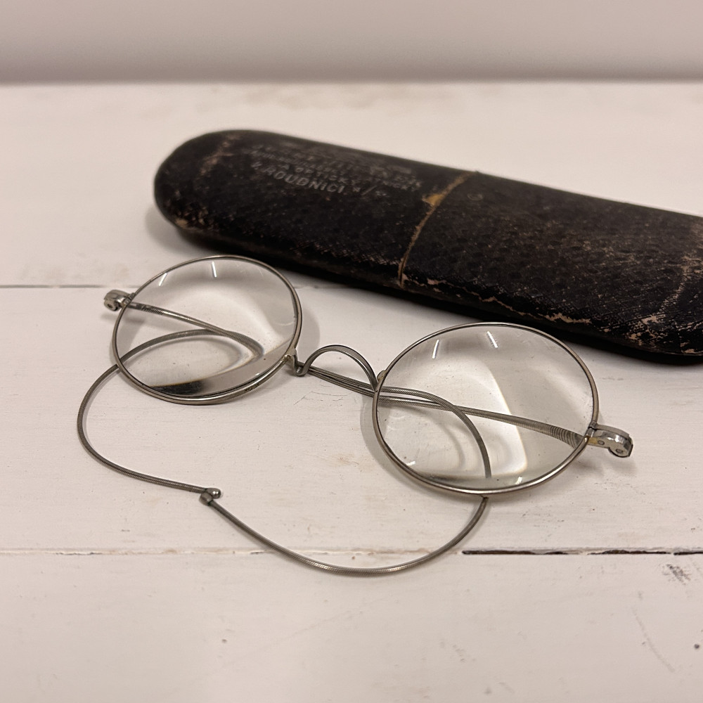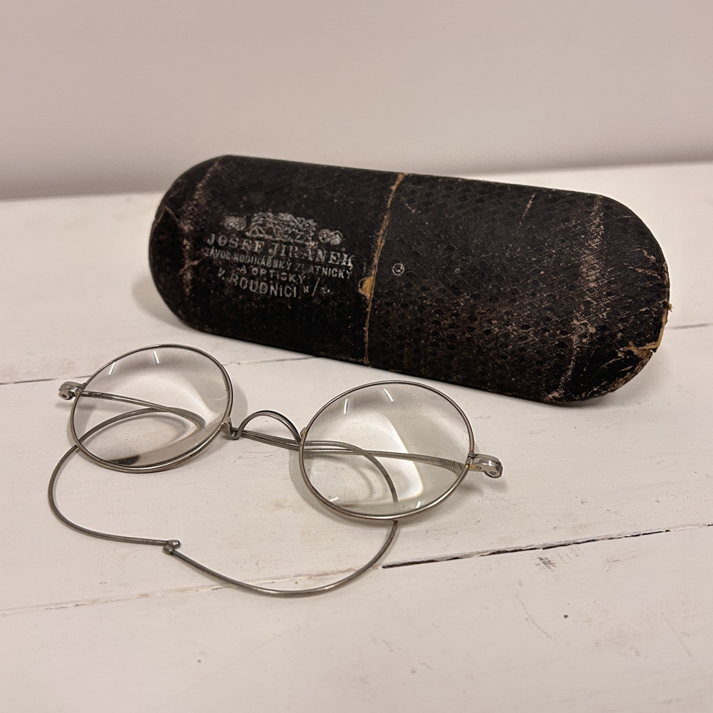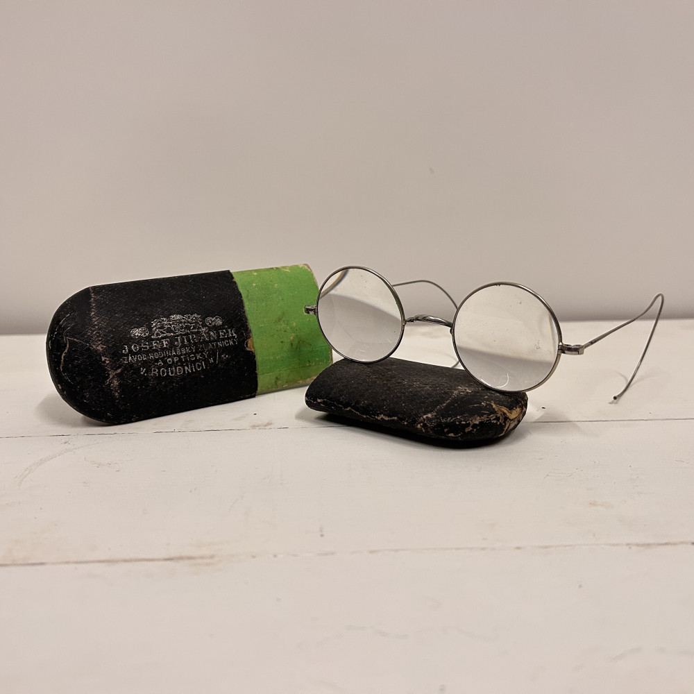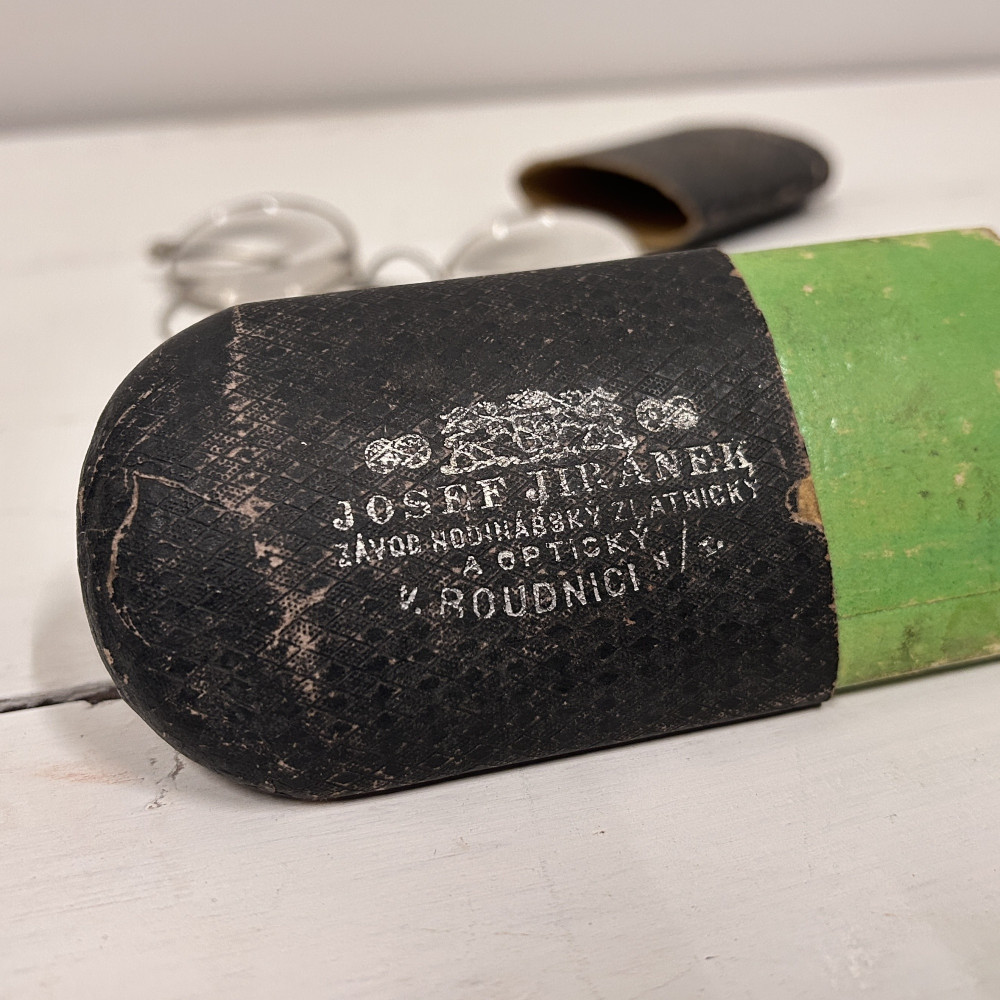 Lenonky - starožitné dioptrické brýle s pouzdrem Josef Jiránek, Závod hodinářský zlatnický a optický v Roudnici nad Label