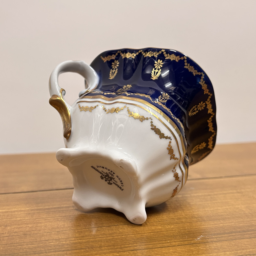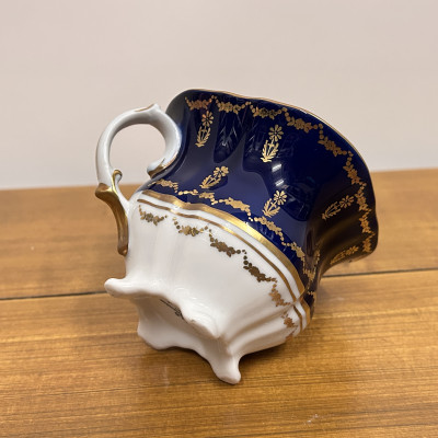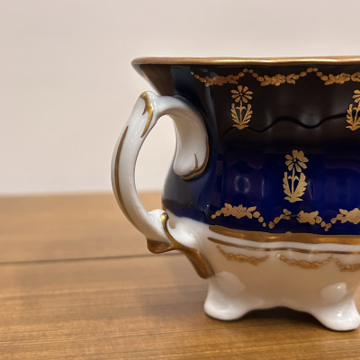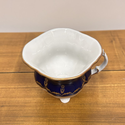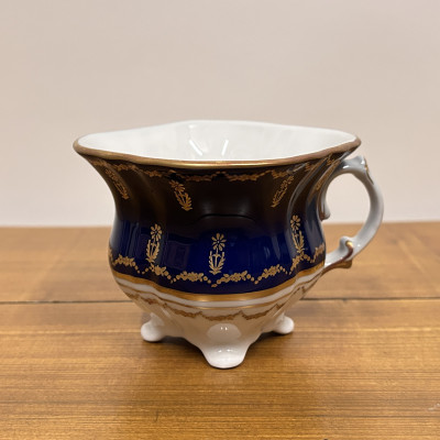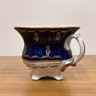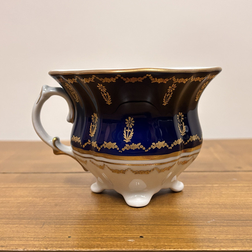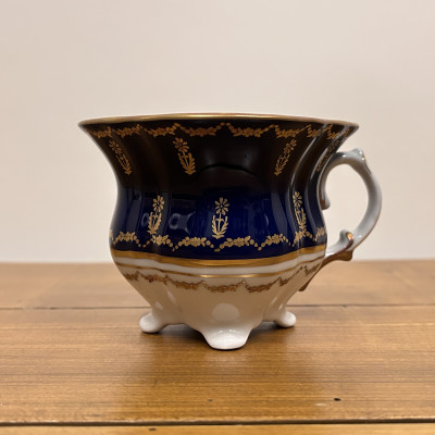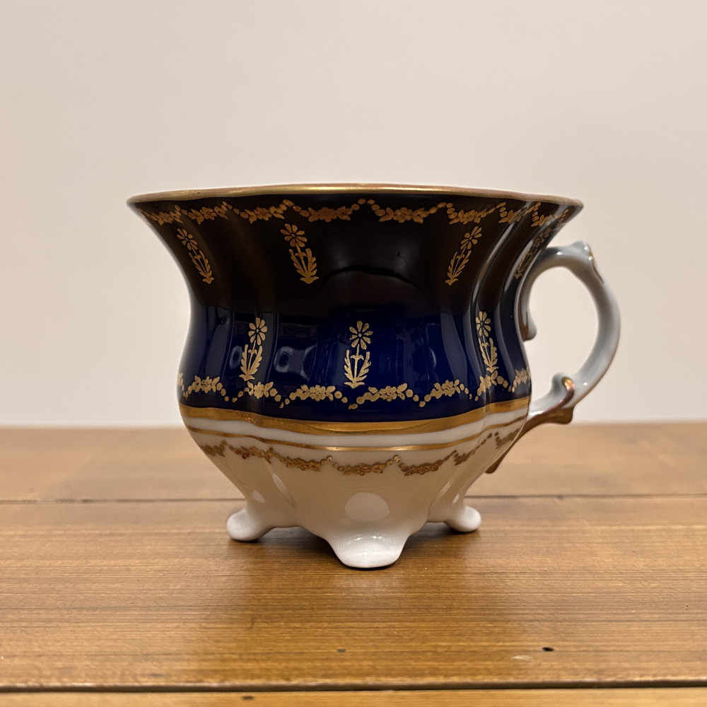 Porcelánový šálek na nožičkách s elegantním ouškem a bohatou dekorací. Šálek je zdoben kombinací hluboké kobaltově modré barvy, černých a jemného zlacení s květinovým motivem. Vnitřní část je bílá s jemným leskem, což podtrhuje noblesní charakter celého kusu.