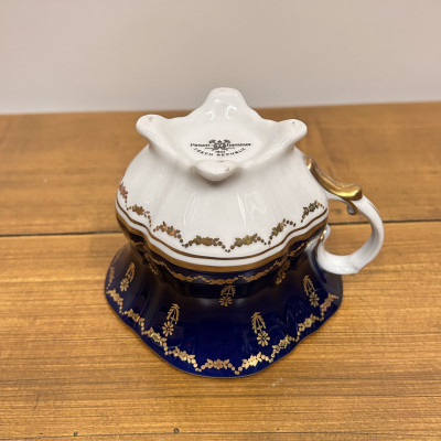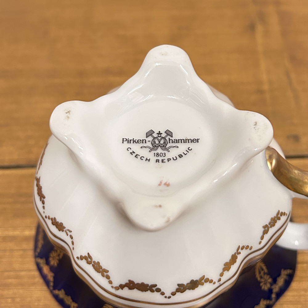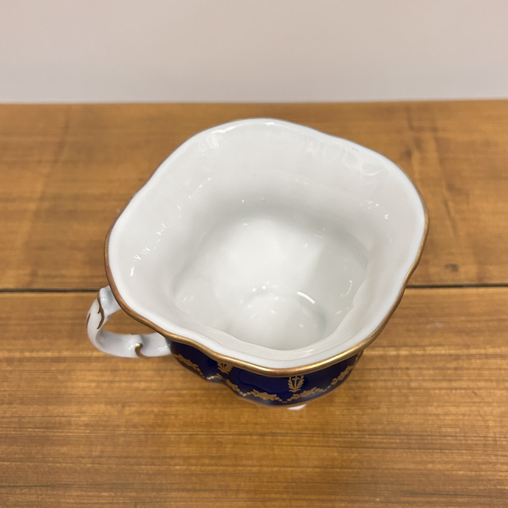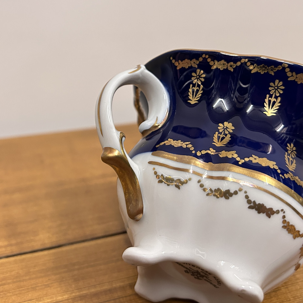 Porcelánový šálek na nožičkách s elegantním ouškem a bohatou dekorací. Šálek je zdoben kombinací hluboké kobaltově modré barvy, černých a jemného zlacení s květinovým motivem. Vnitřní část je bílá s jemným leskem, což podtrhuje noblesní charakter celého kusu.