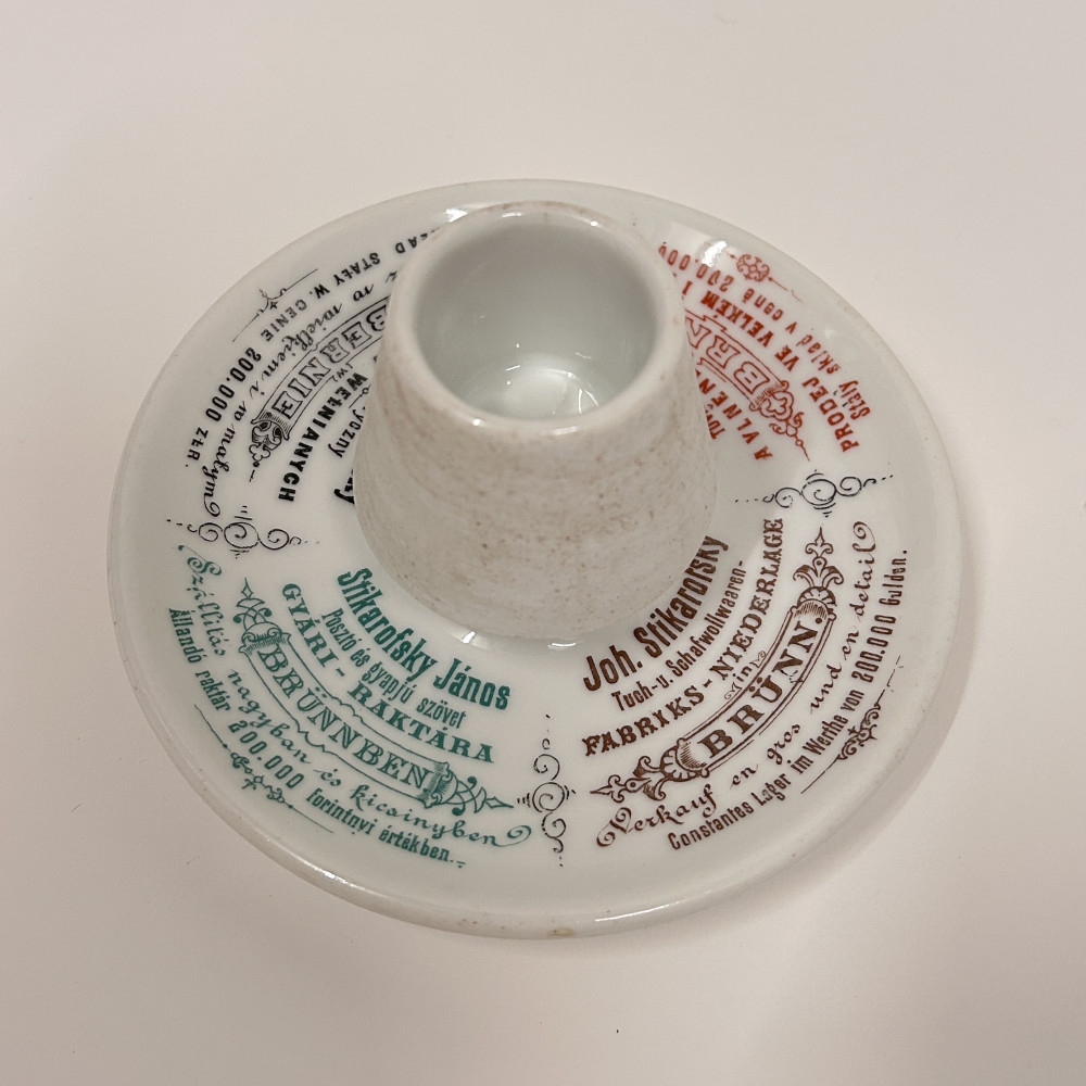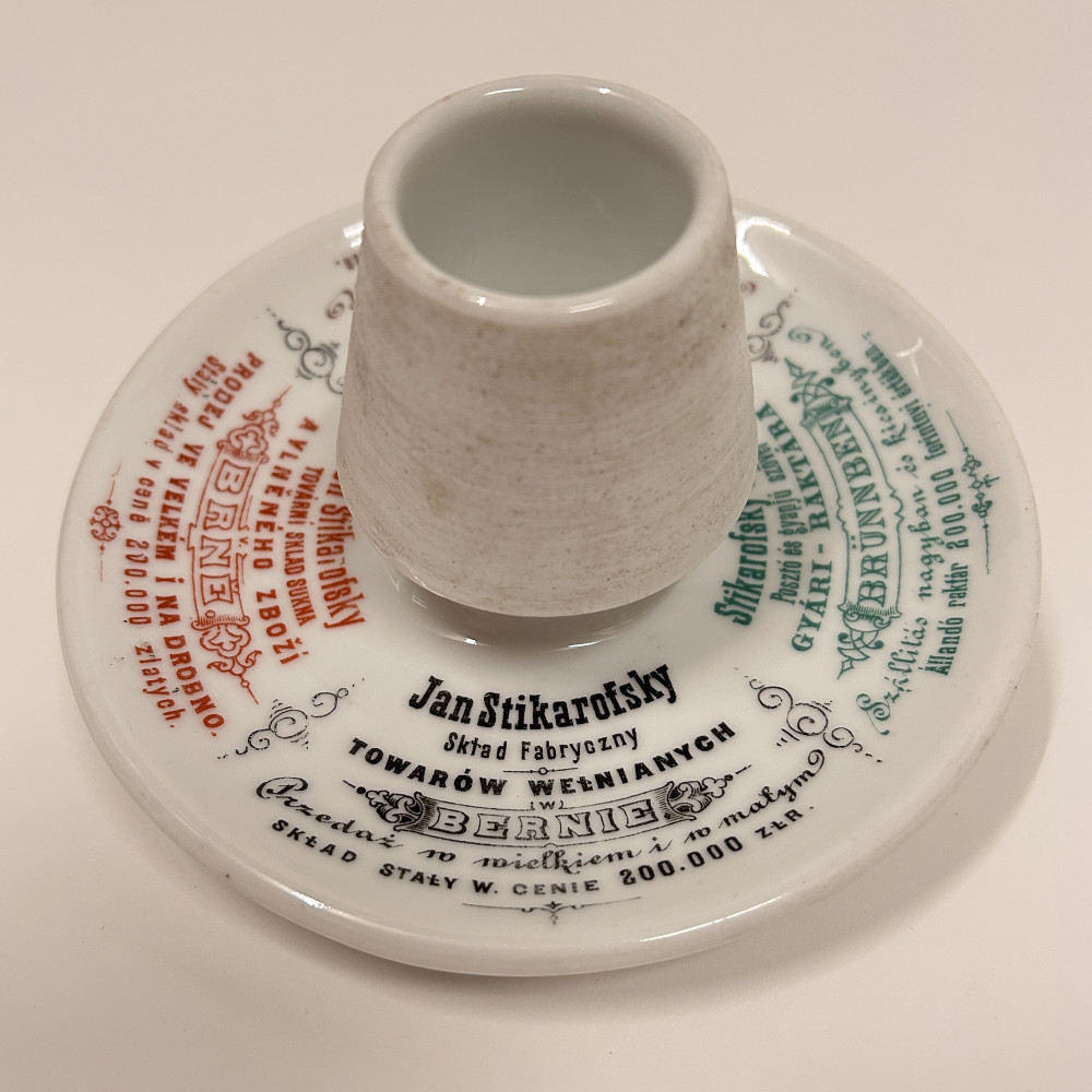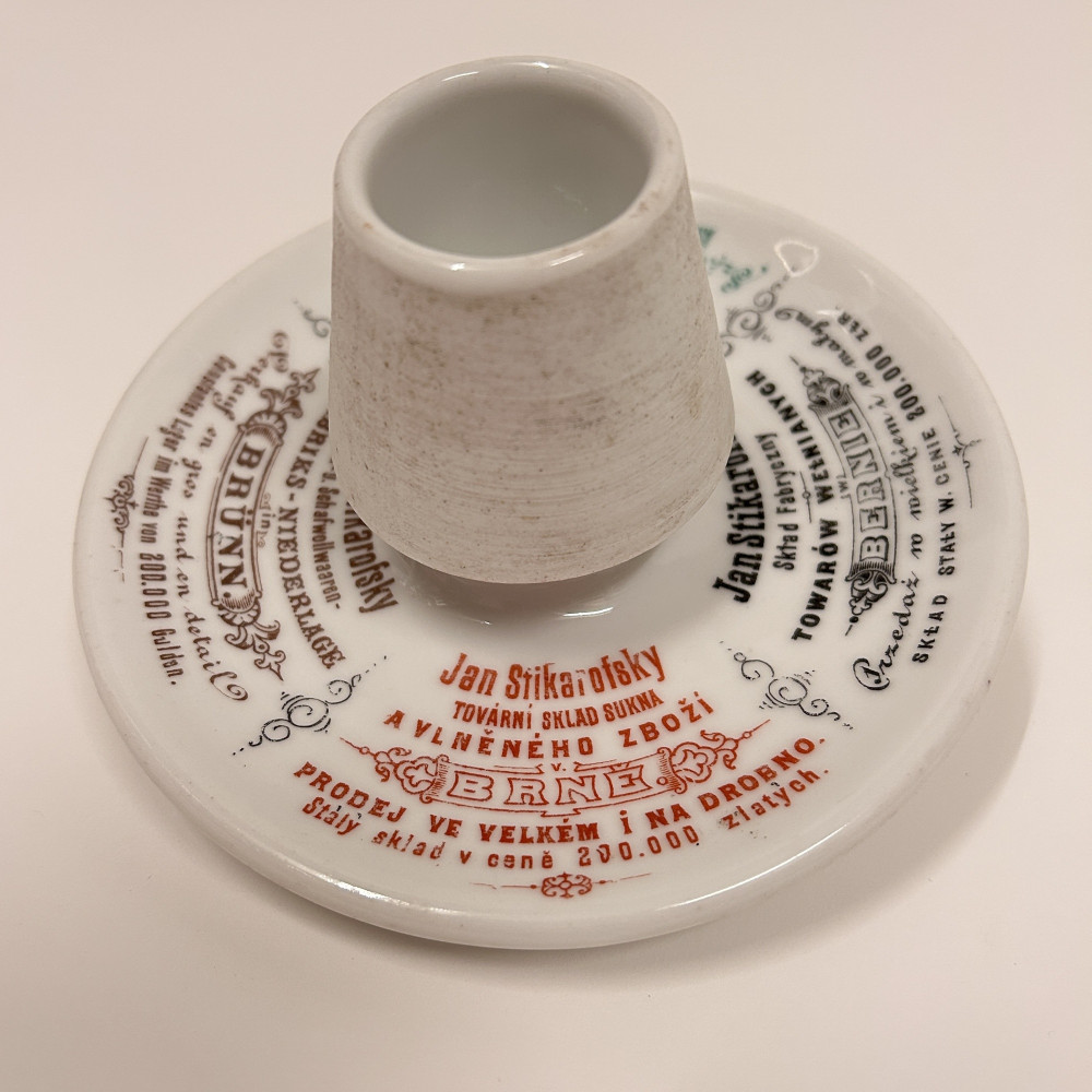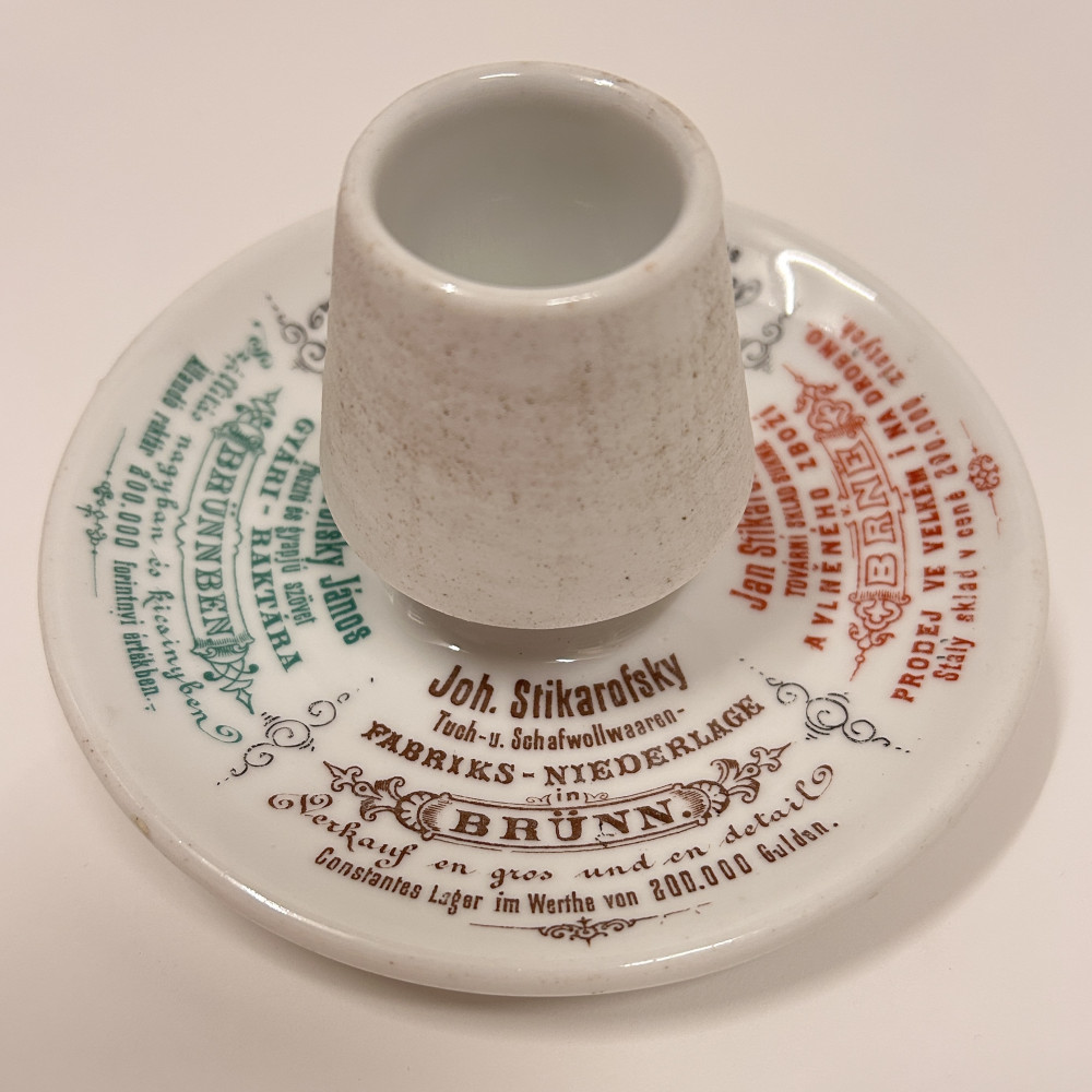 Starožitný porcelánový držák na zápalky, který má na podstavci text v několika jazycích. Text odkazuje na obchodníka s vlnou v Brně a na prodej zboží ve velkém i v maloobchodě.