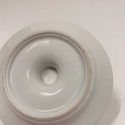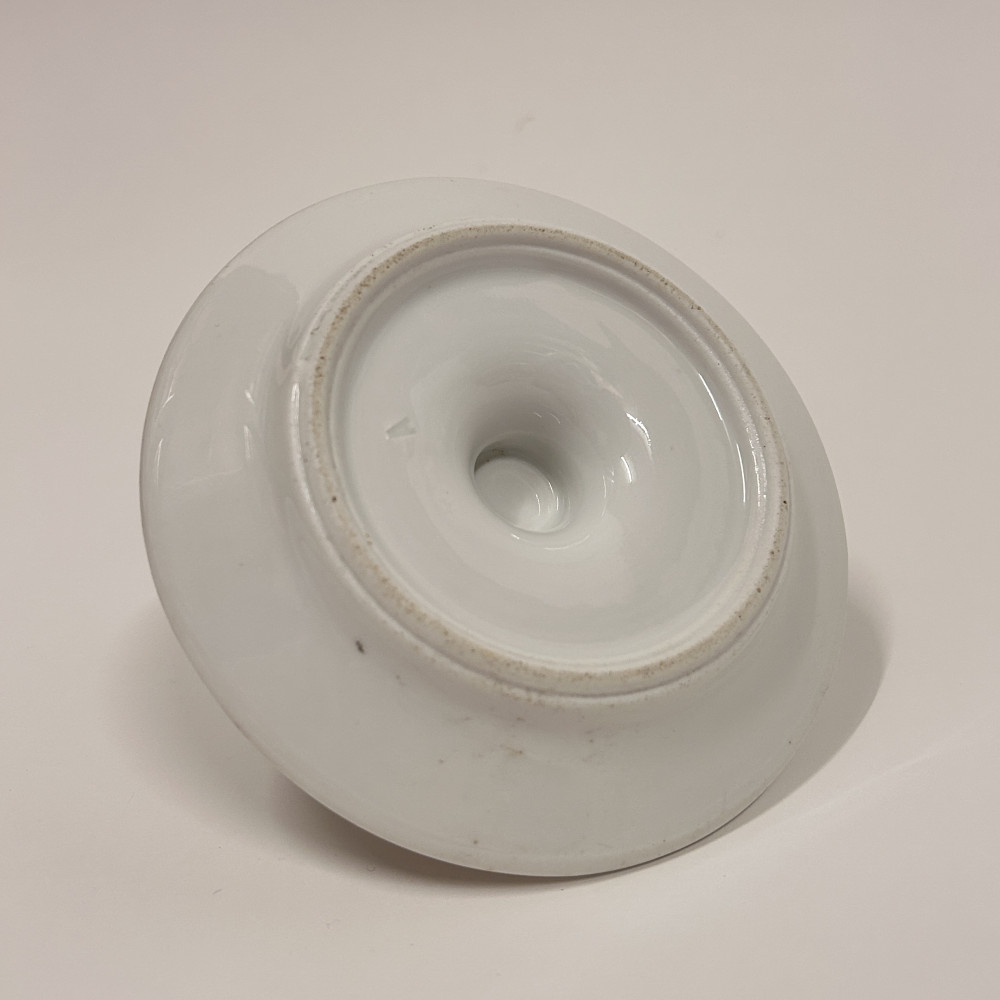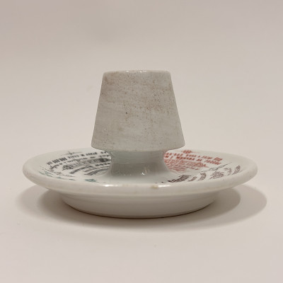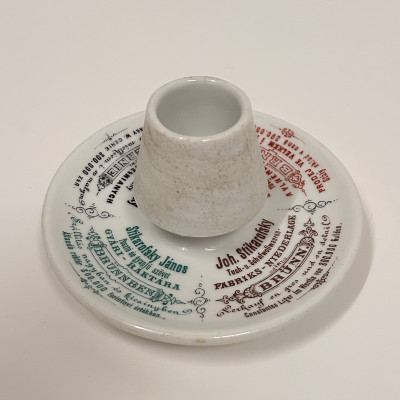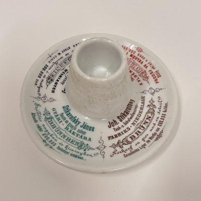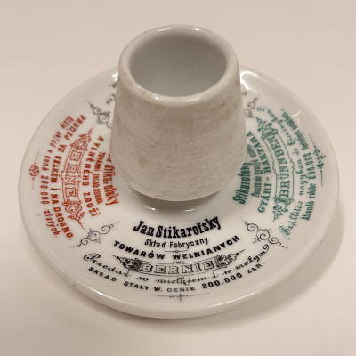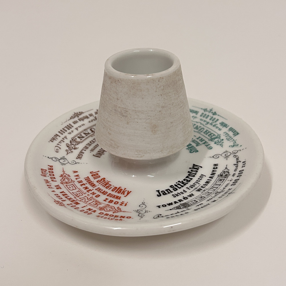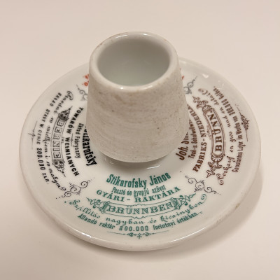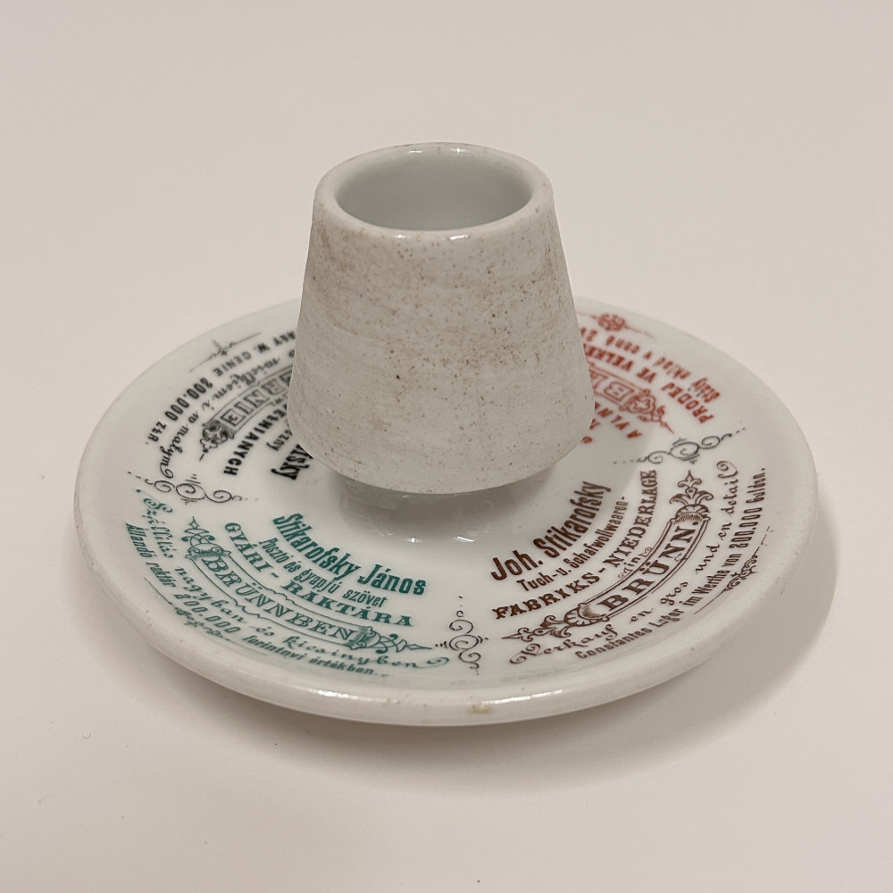 Starožitný porcelánový držák na zápalky, který má na podstavci text v několika jazycích. Text odkazuje na obchodníka s vlnou v Brně a na prodej zboží ve velkém i v maloobchodě.