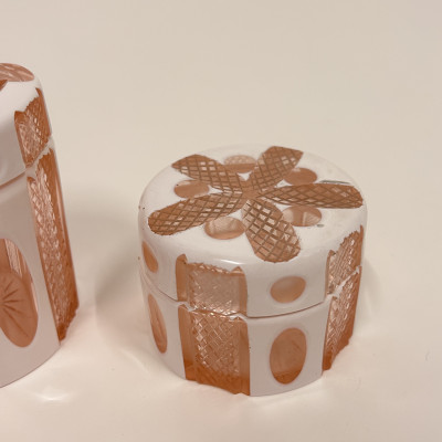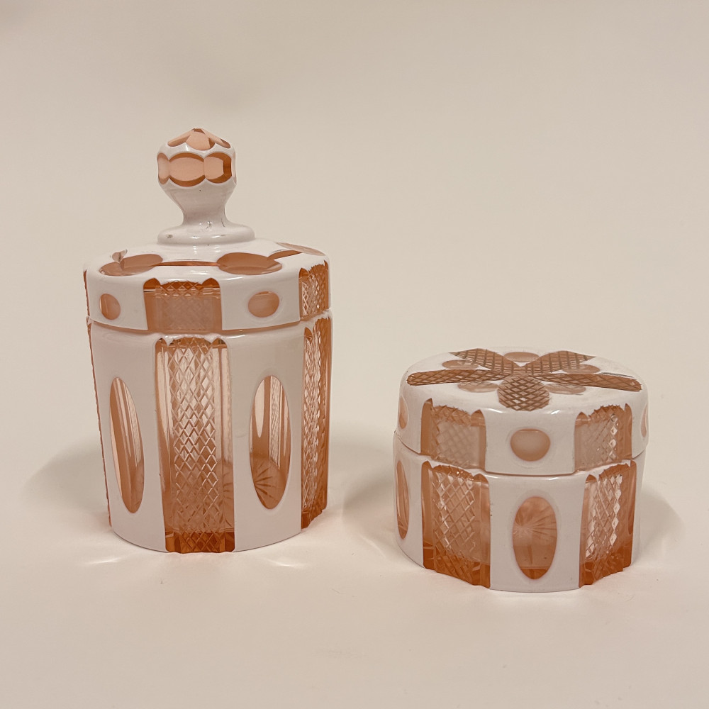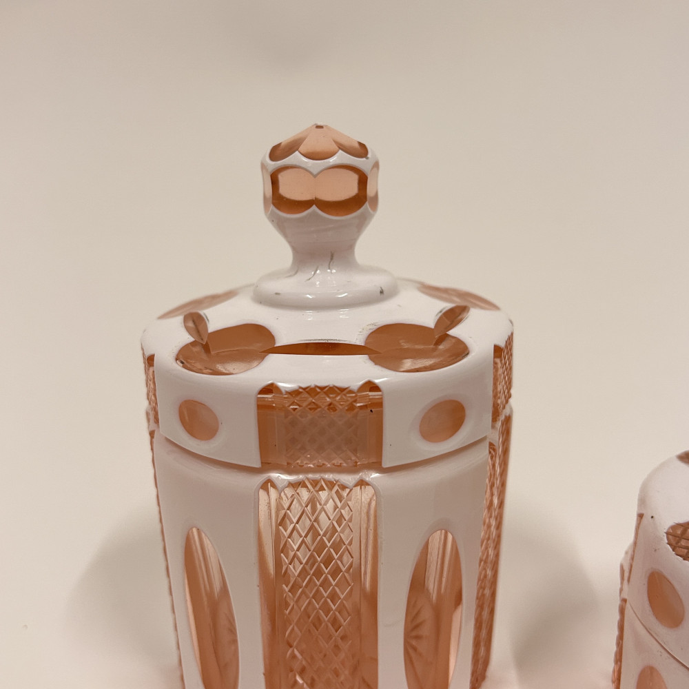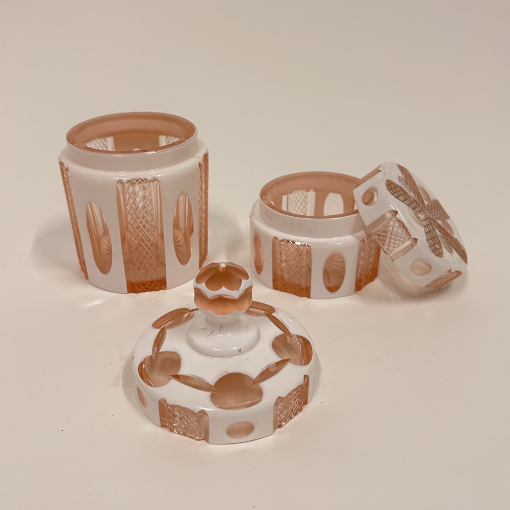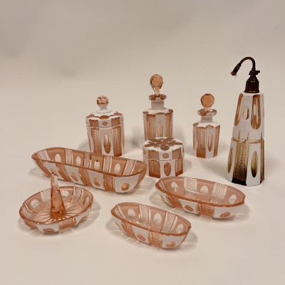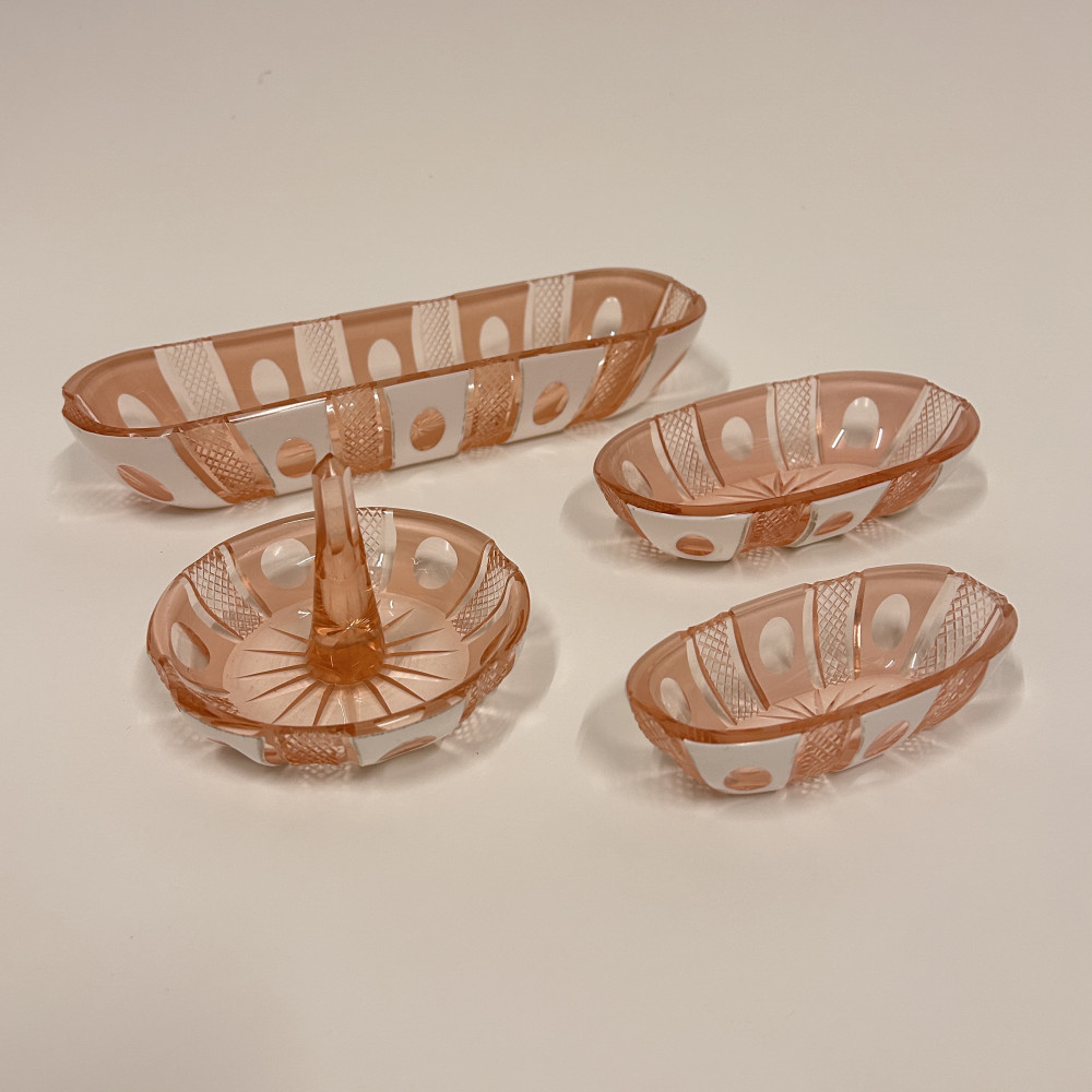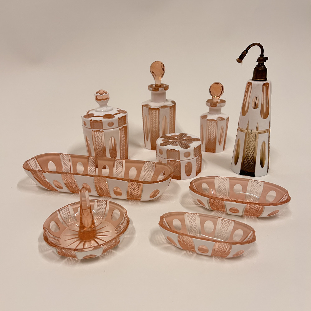 Toaletní set vyrobený z růžového opalinového skla. Opalínové sklo je druh mléčně zbarveného skla, které se někdy nazývá také opálové sklo. Tyto sety byly populární především v 19. a 20. století.