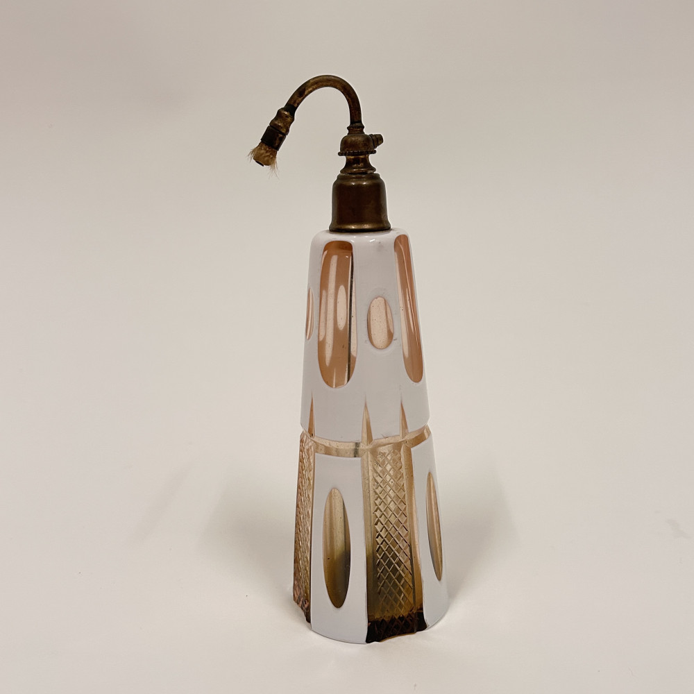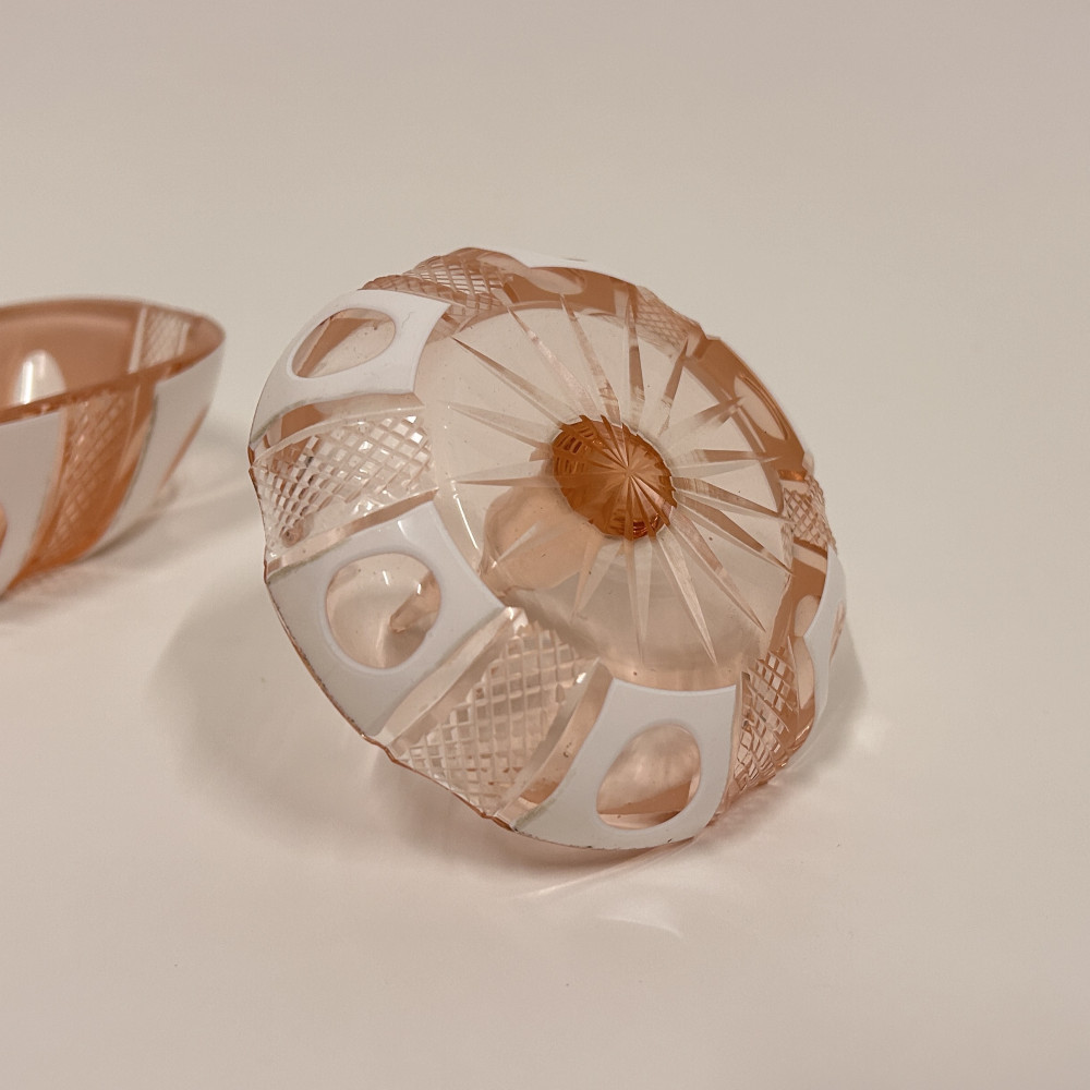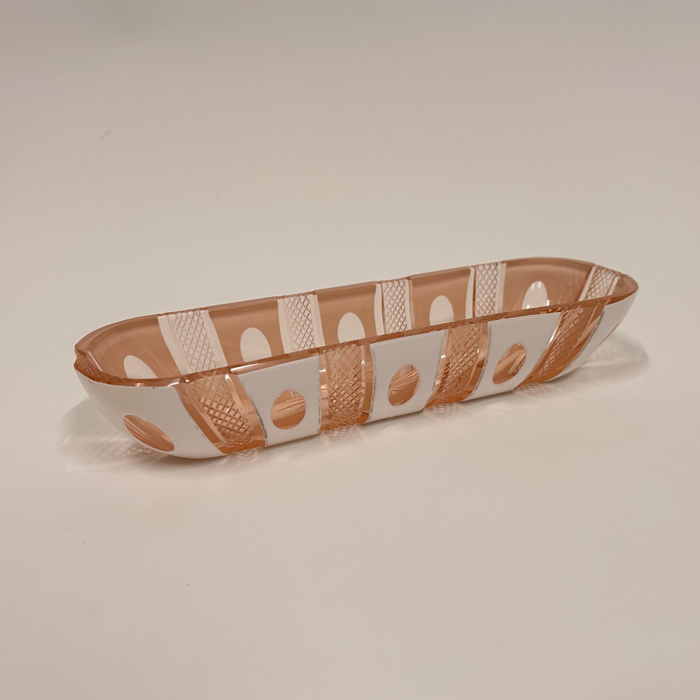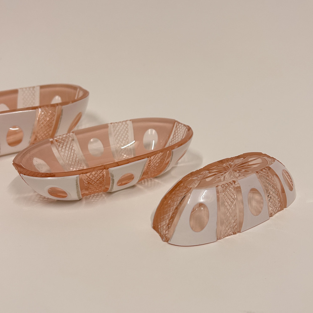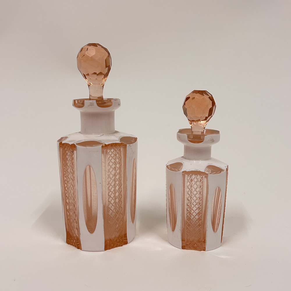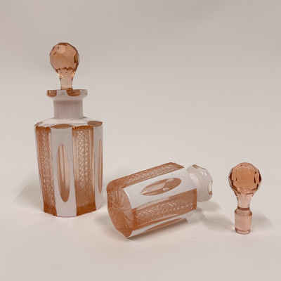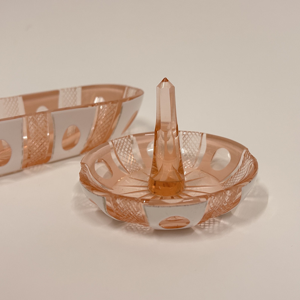 Toaletní set vyrobený z růžového opalinového skla. Opalínové sklo je druh mléčně zbarveného skla, které se někdy nazývá také opálové sklo. Tyto sety byly populární především v 19. a 20. století.