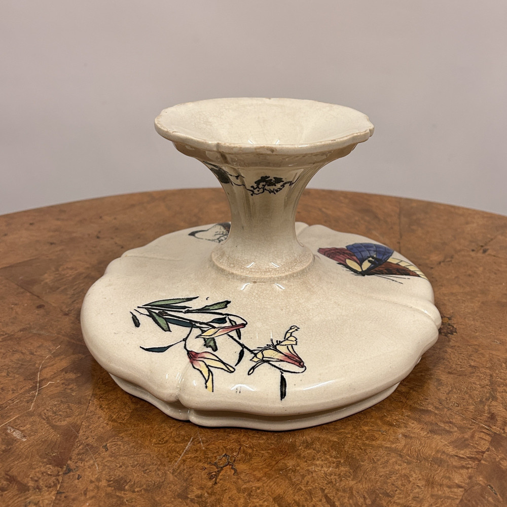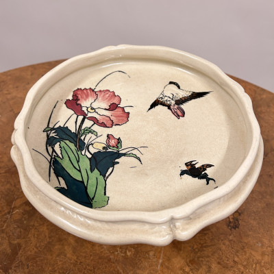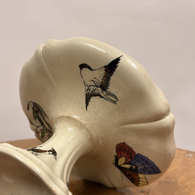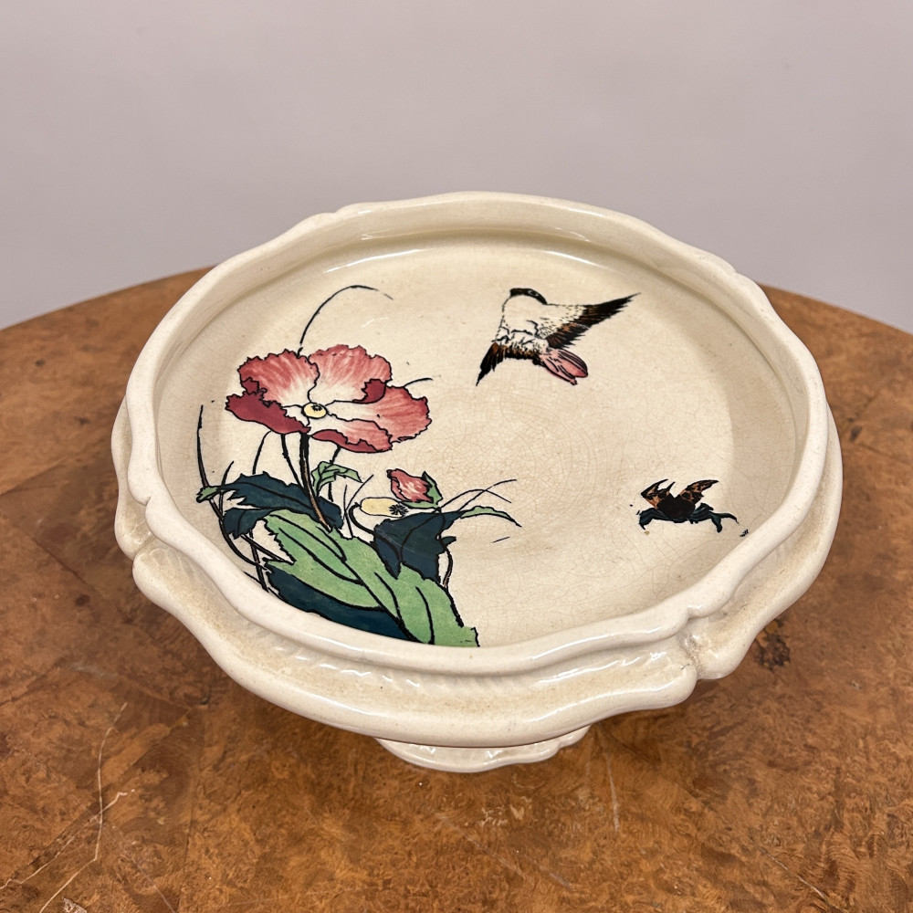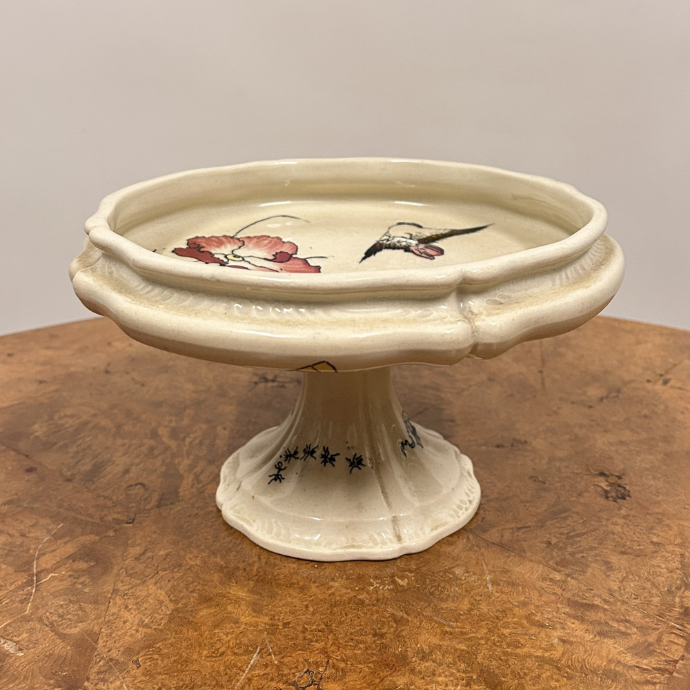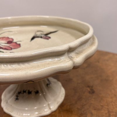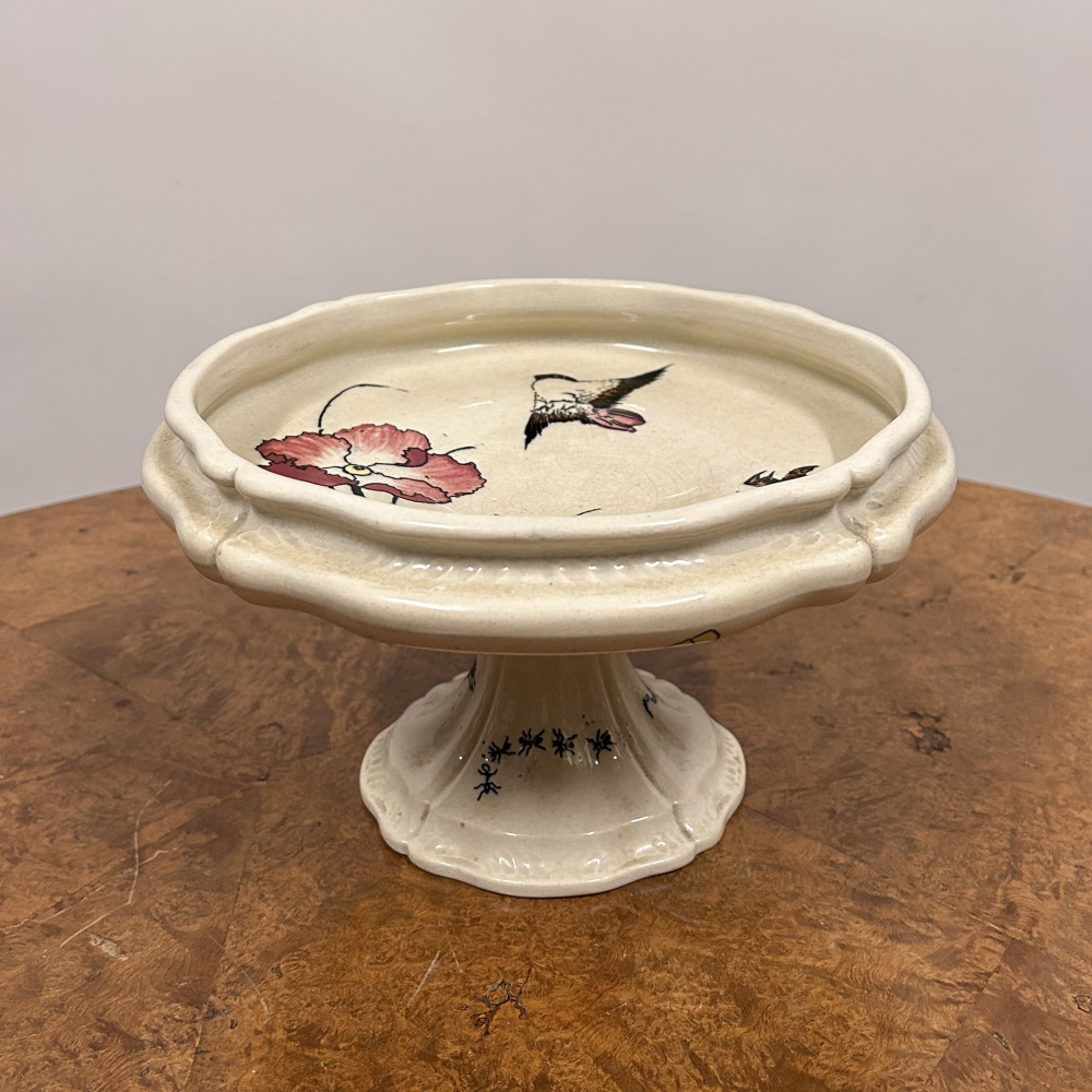 Starožitný keramický nástolec je podnos na nožičce, který se používá k servírování ovoce, kompotů, dortů nebo cukroví. Zdoben ručně malovanými motivy, které zahrnují růžové květy a ptáka.