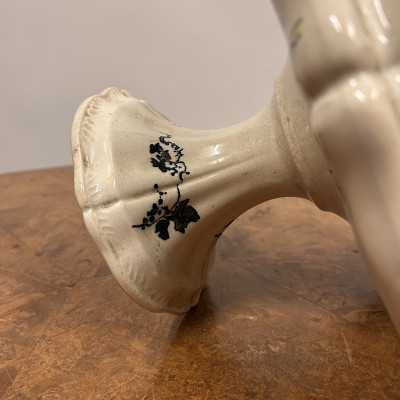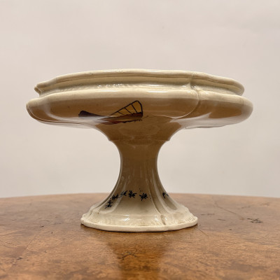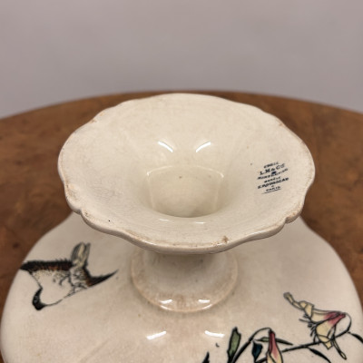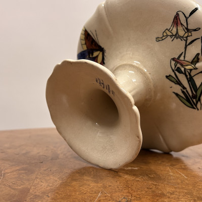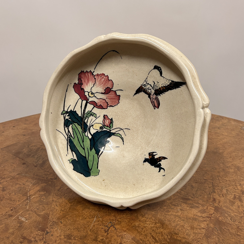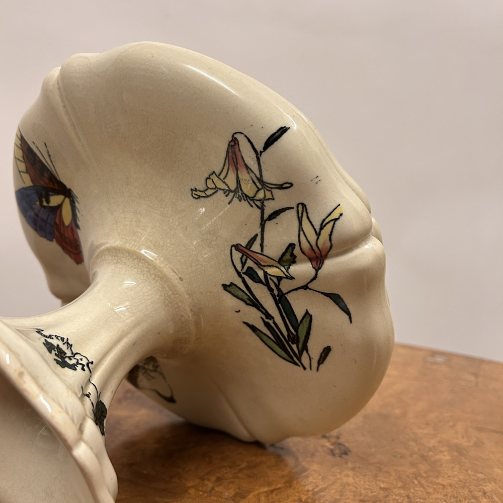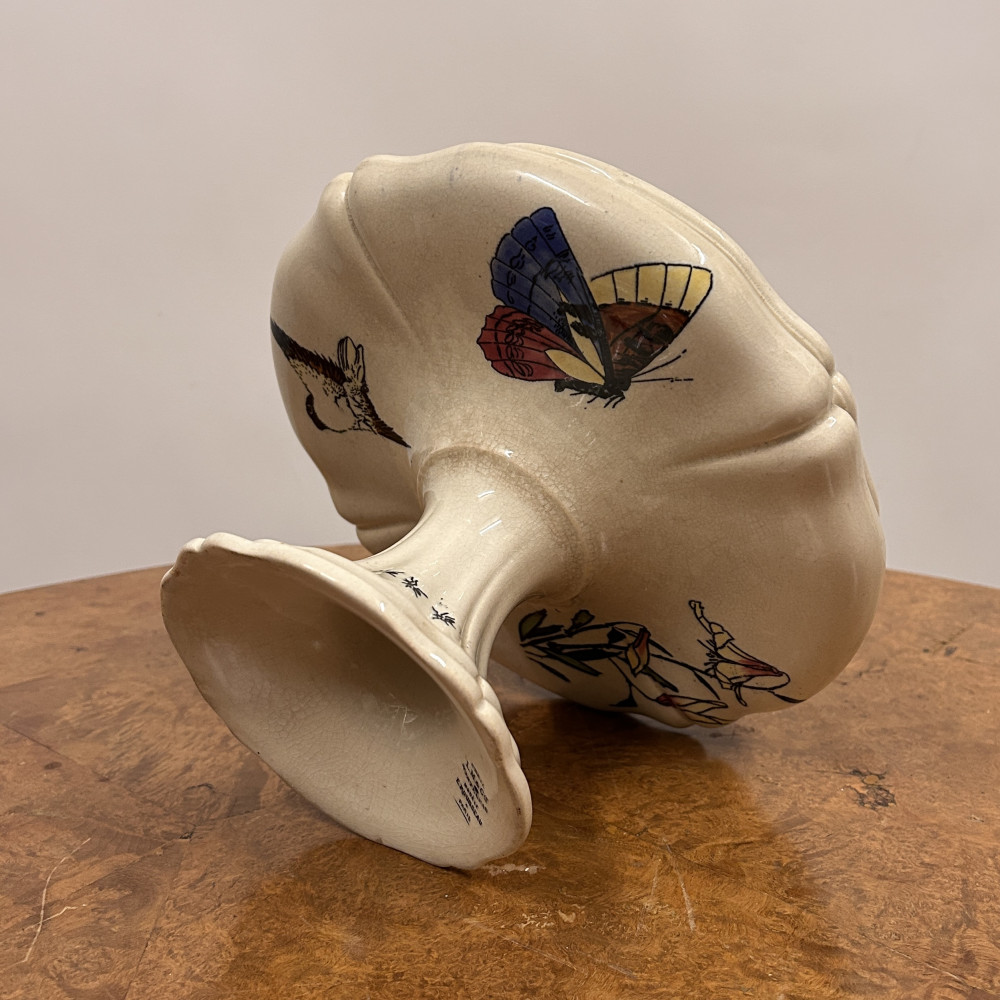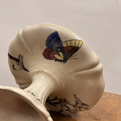 Starožitný keramický nástolec je podnos na nožičce, který se používá k servírování ovoce, kompotů, dortů nebo cukroví. Zdoben ručně malovanými motivy, které zahrnují růžové květy a ptáka.