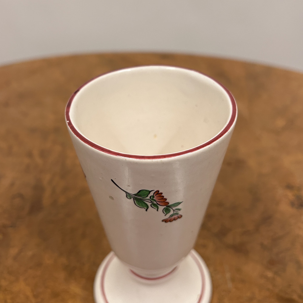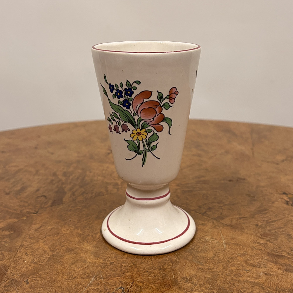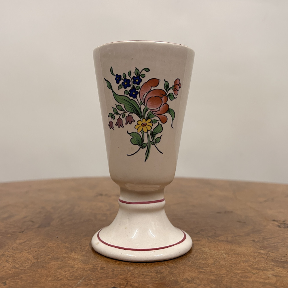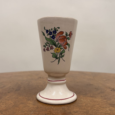 Jedná se o francouzský keramický pohárek, známý jako mazagran, s ručně malovaným květinovým vzorem, často označovaný jako vzor "Old Strasbourg" nebo "Réverbère". Tyto poháry byly typicky vyráběny francouzskou fajánsovou manufakturou Keller & Guérin (K&G) v Lunéville a pocházejí přibližně z 50. let 20. století.