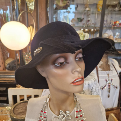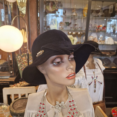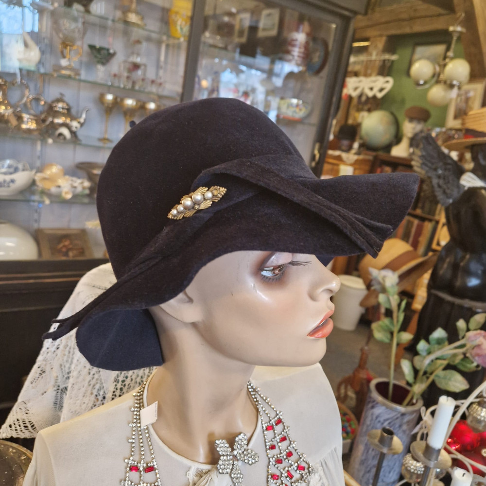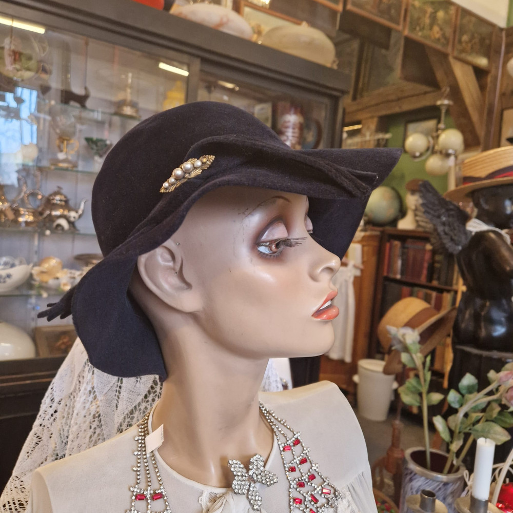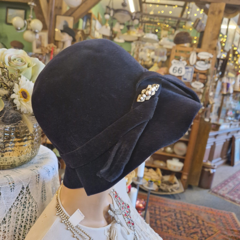 Dámský černý plstěný klobouk ve stylu cloche (zvon), doplněný vintage broží s imitací perel.