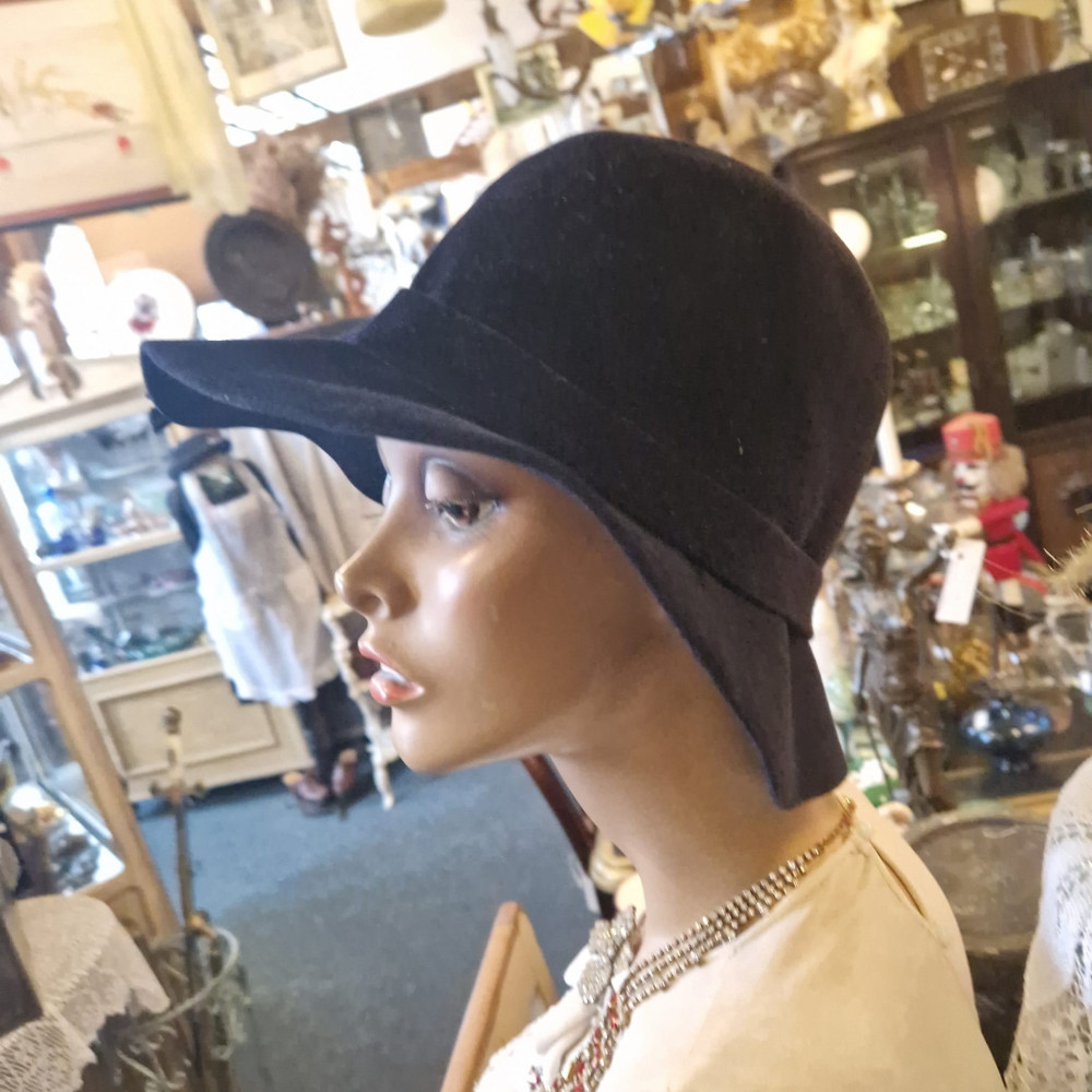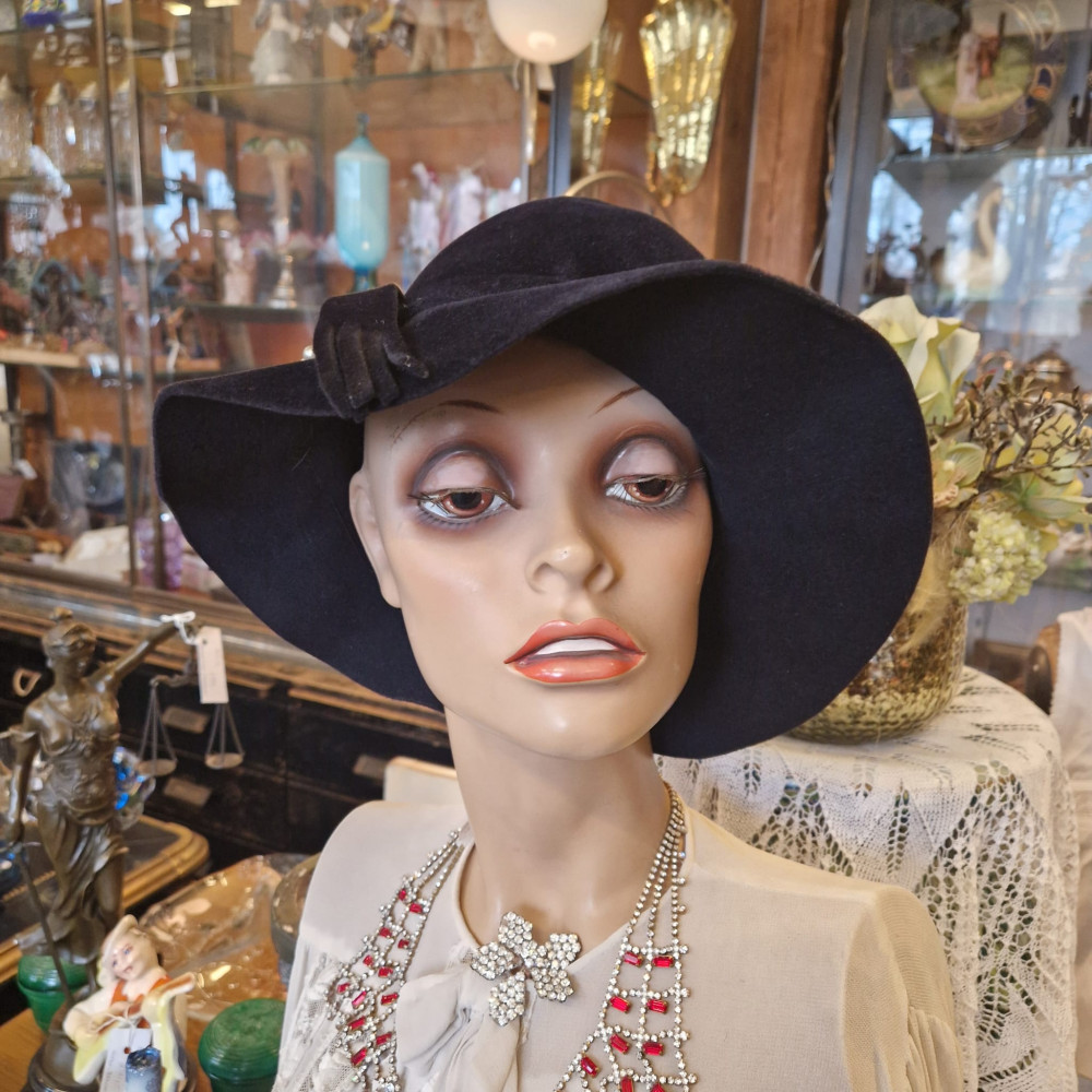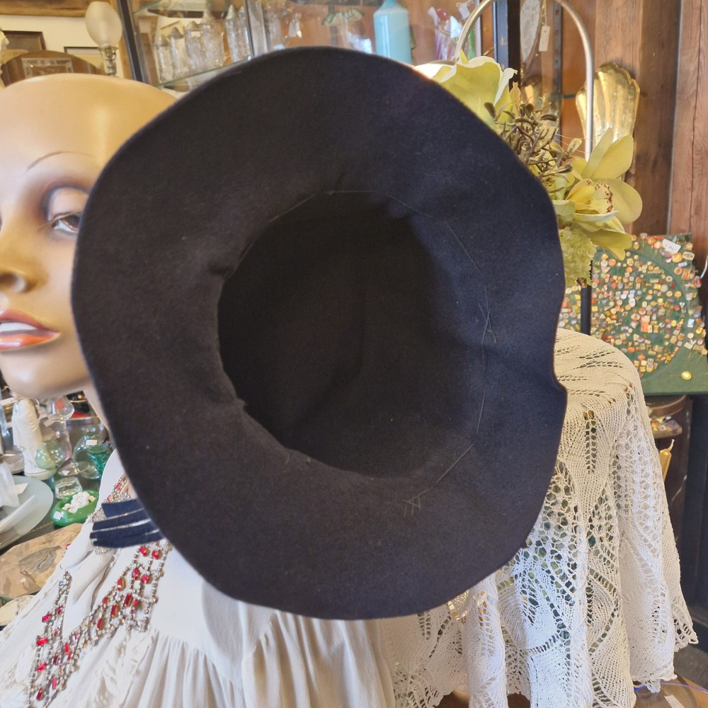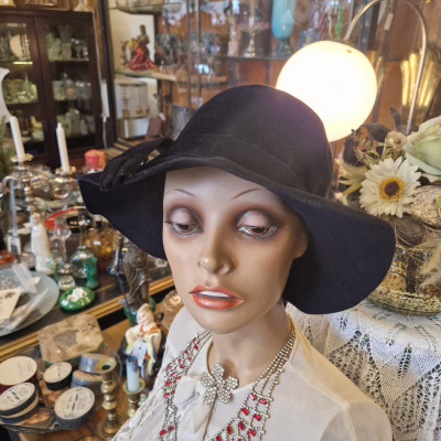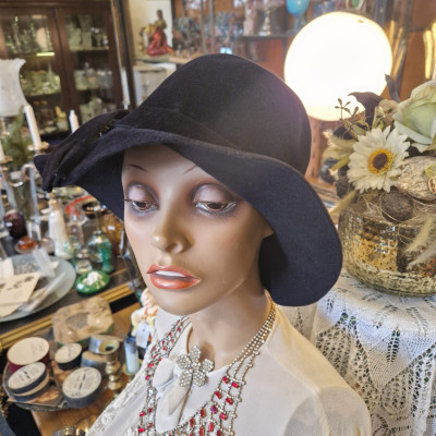 Dámský černý plstěný klobouk ve stylu cloche (zvon), doplněný vintage broží s imitací perel.