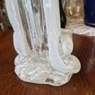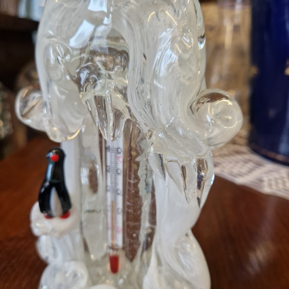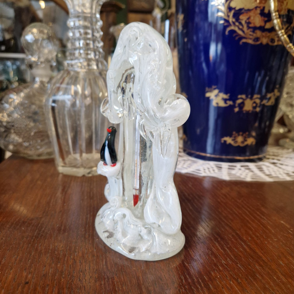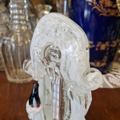 Dekorativní skleněný teploměr ve tvaru tučňáka na ledové kře, který je často připisován designérovi Jaroslavu Brychtovi pro sklárny Železnobrodské sklo (ŽBS). Z foukaného hutního skla, které pocházejí přibližně z druhé poloviny 20. století.