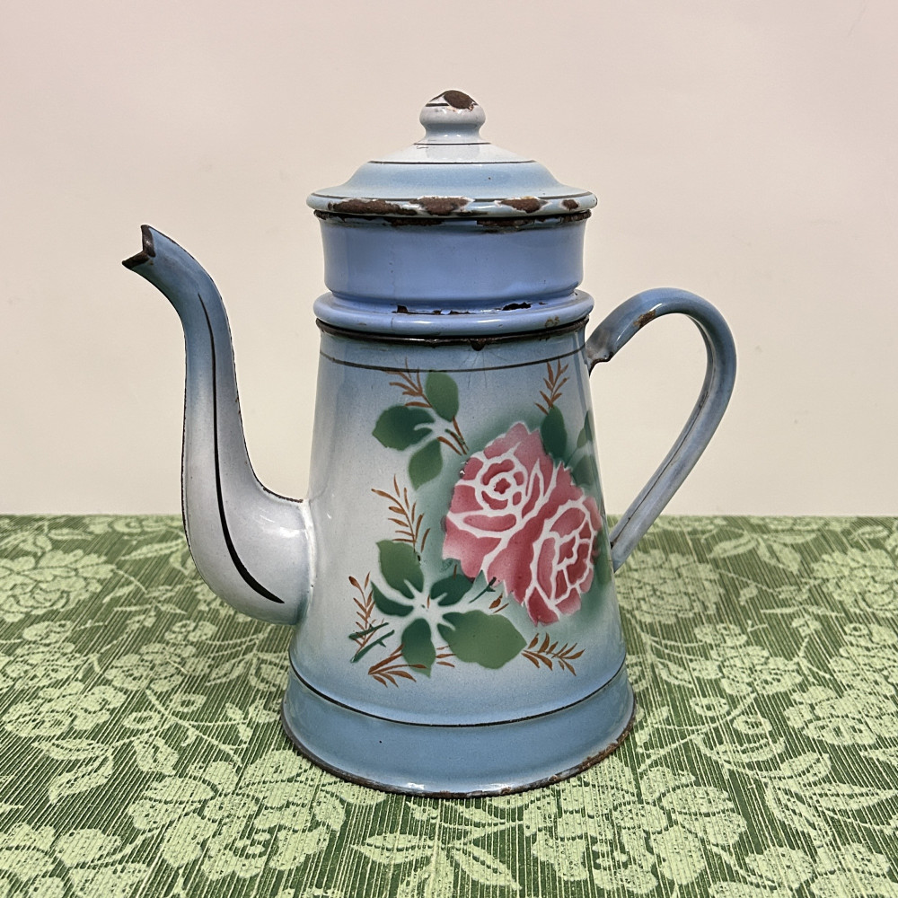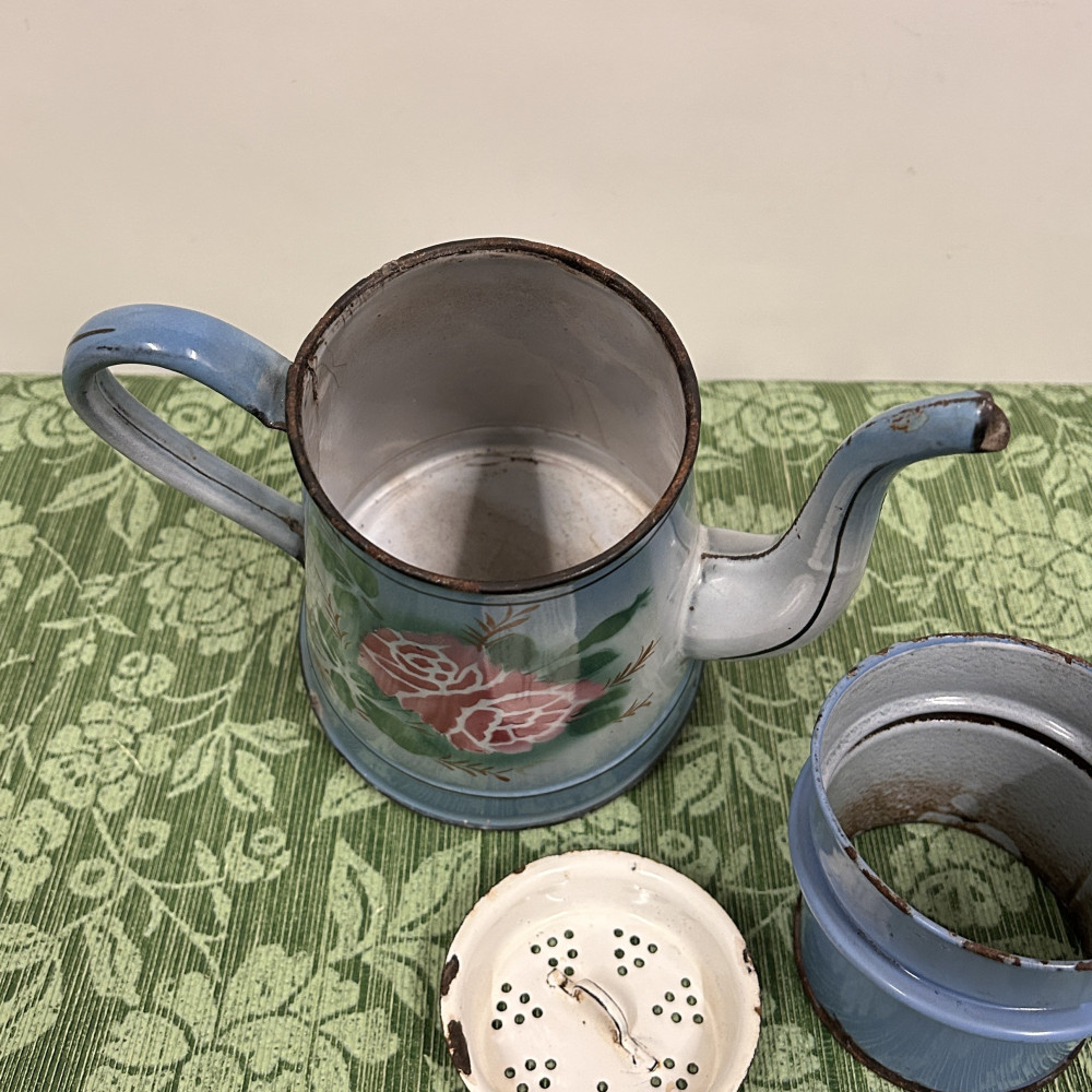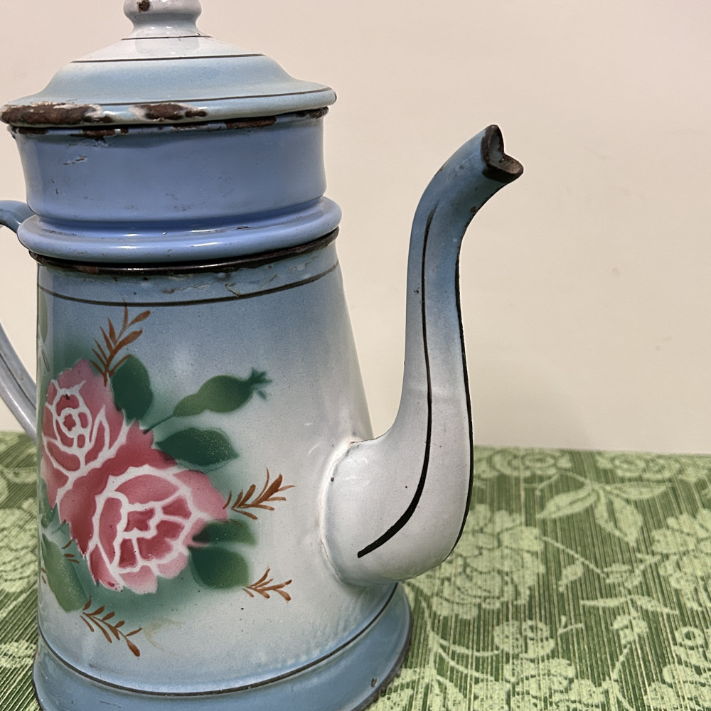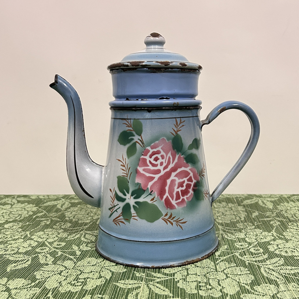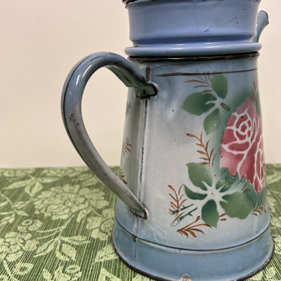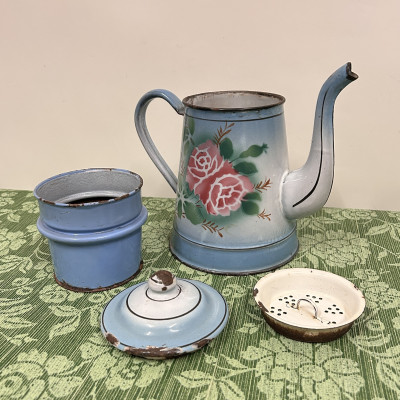 Starožitná francouzská smaltovaná konvice na kávu (známá také jako cafetière nebo coffee biggin), vyznačuje se typickým art deco stylem s barevným přechodem (ombré) a květinovým dekorem. Jedná se o vícedílnou soupravu určenou k přípravě překapávané kávy. Skládá se z hlavní konvice, vysokého filtračního nástavce (prostřední modrý válec), vnitřního sítka a víčka.