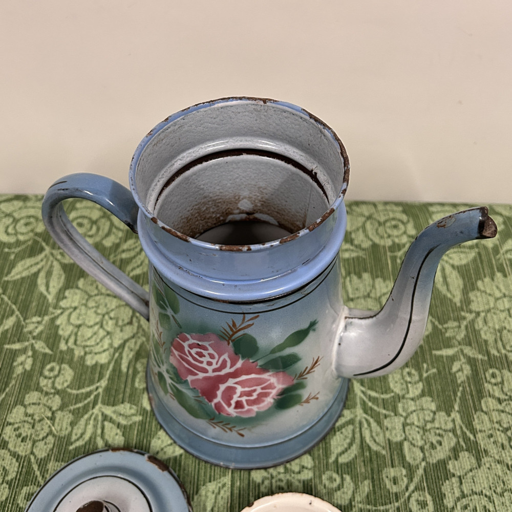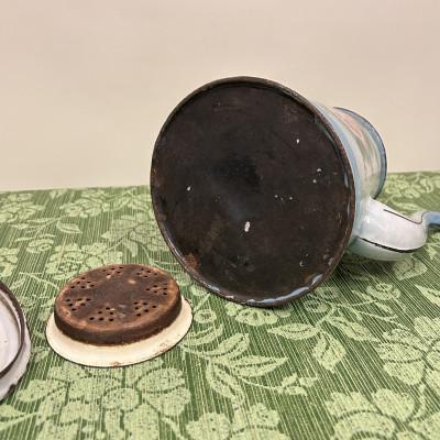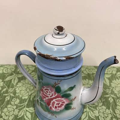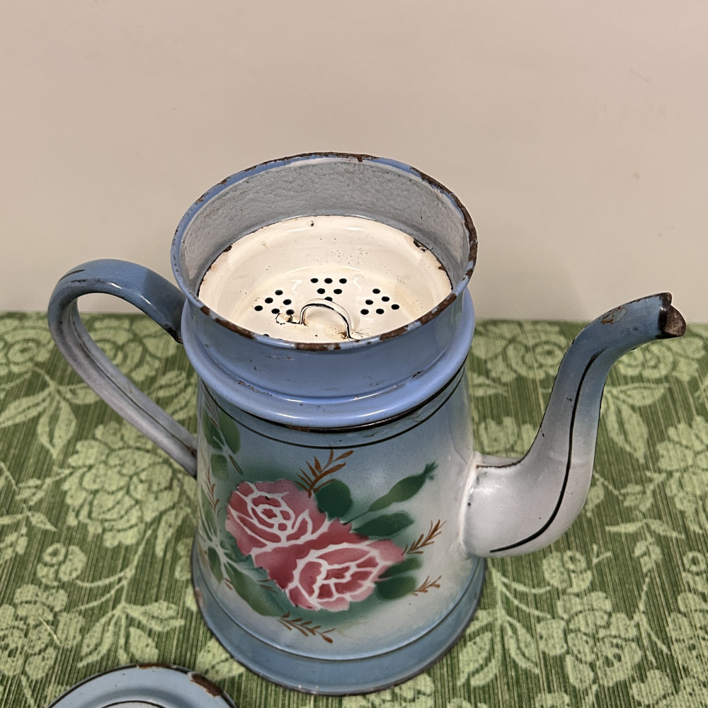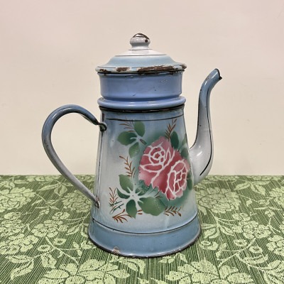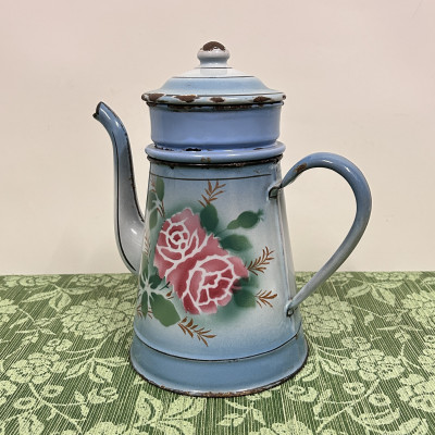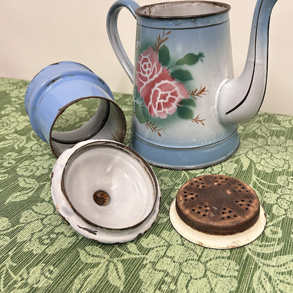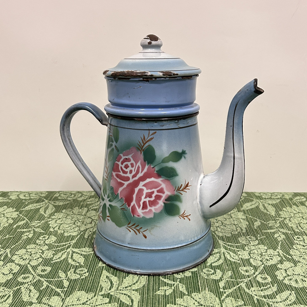 Starožitná francouzská smaltovaná konvice na kávu (známá také jako cafetière nebo coffee biggin), vyznačuje se typickým art deco stylem s barevným přechodem (ombré) a květinovým dekorem. Jedná se o vícedílnou soupravu určenou k přípravě překapávané kávy. Skládá se z hlavní konvice, vysokého filtračního nástavce (prostřední modrý válec), vnitřního sítka a víčka.