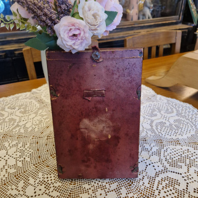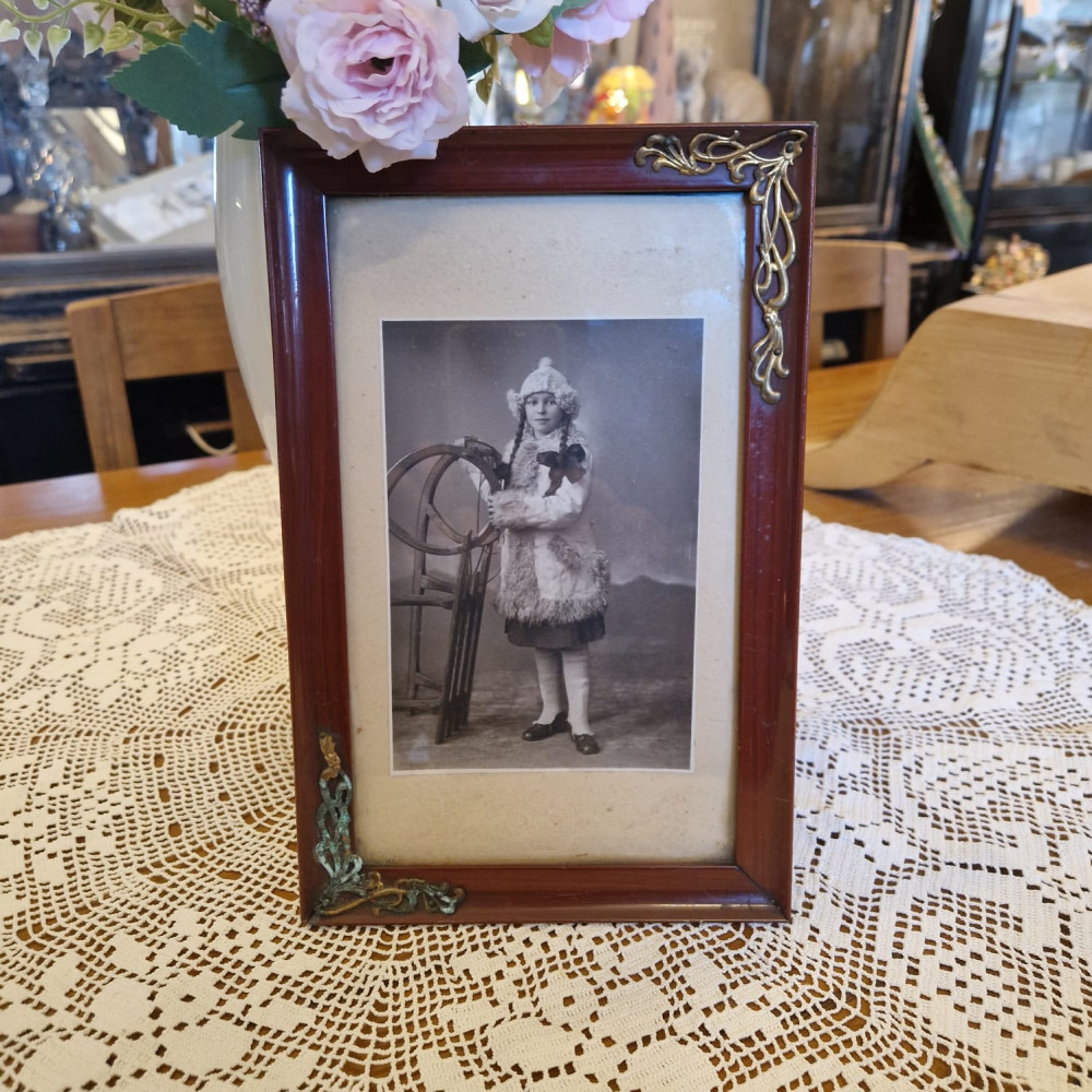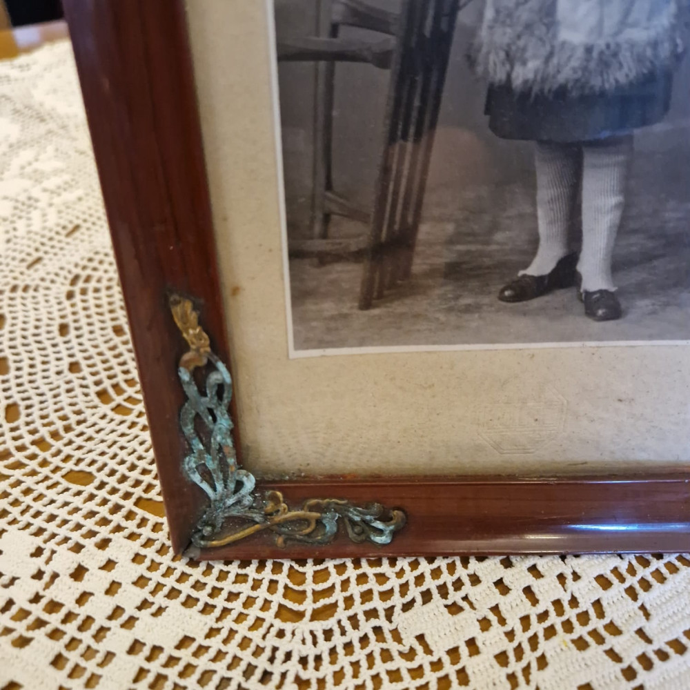 Starožitný dřevěný rámeček vyrobený z tmavého dřeva, zdobený ozdobným kováním v rozích.