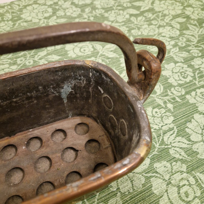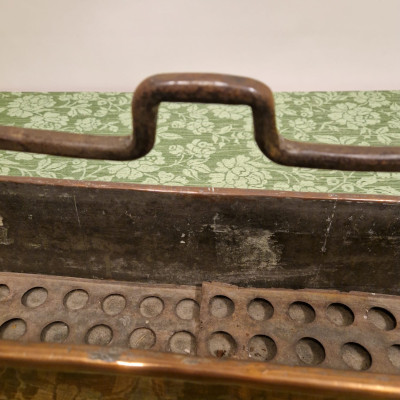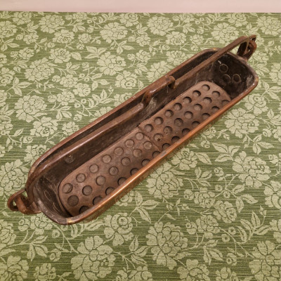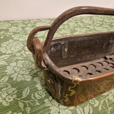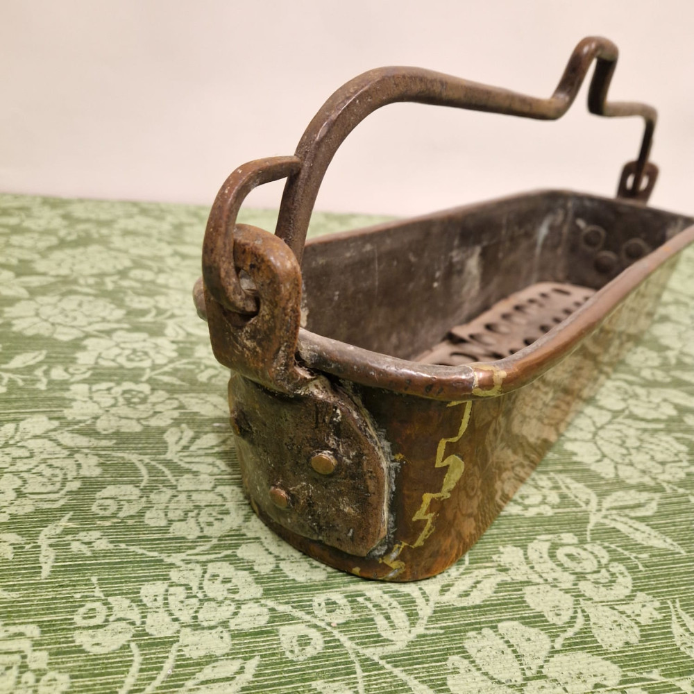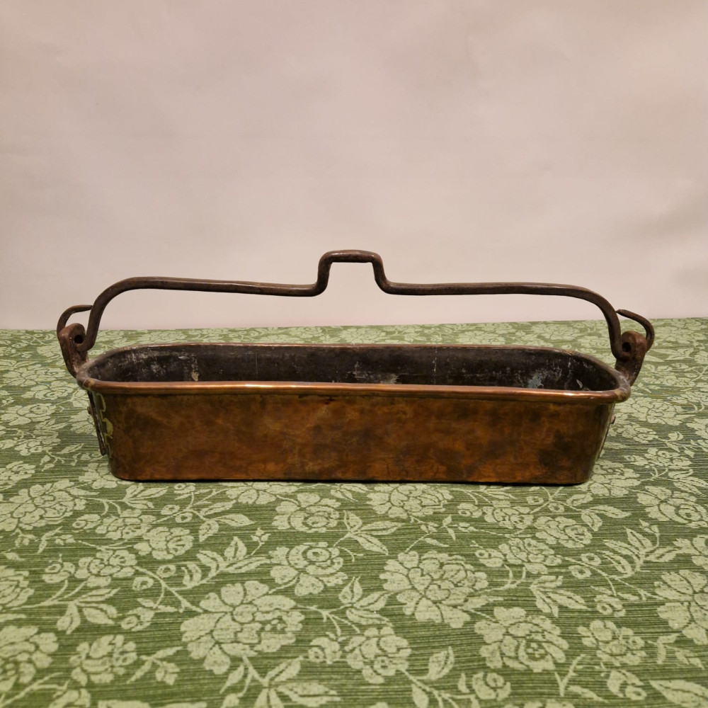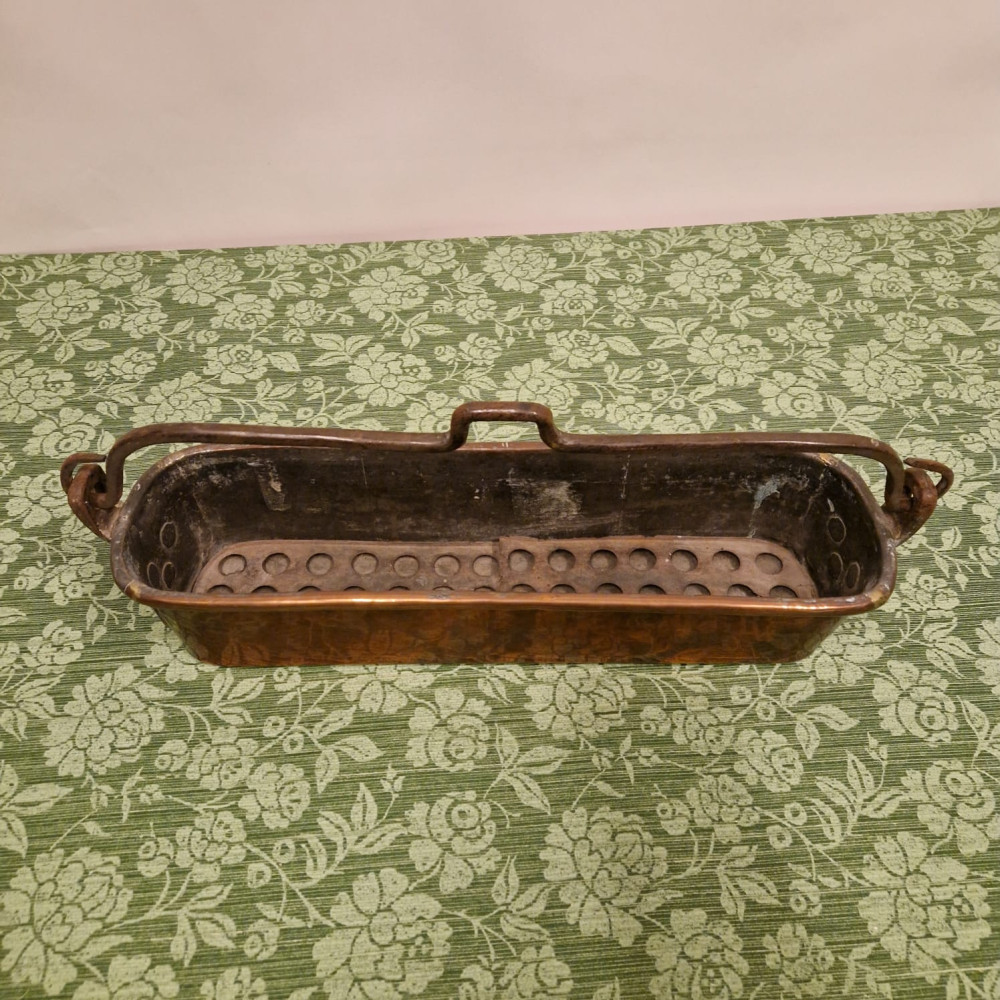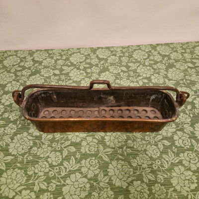 Starožitná měděná nádoba na ryby, ve francouzštině známá jako poissonnière. Tento specifický kus kuchyňského nádobí z 19. století se vyznačuje dlouhým úzkým tvarem, který umožňoval vaření nebo dušení celých ryb, jako je losos nebo pstruh.