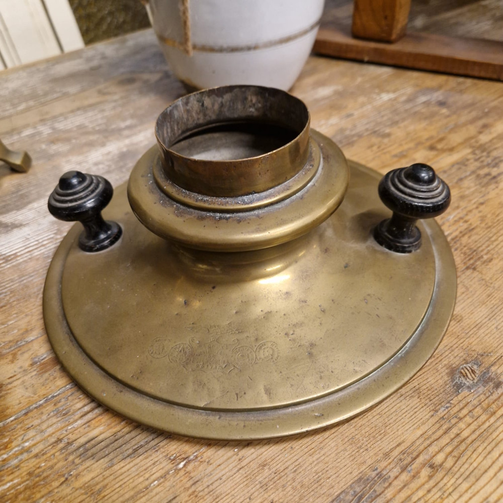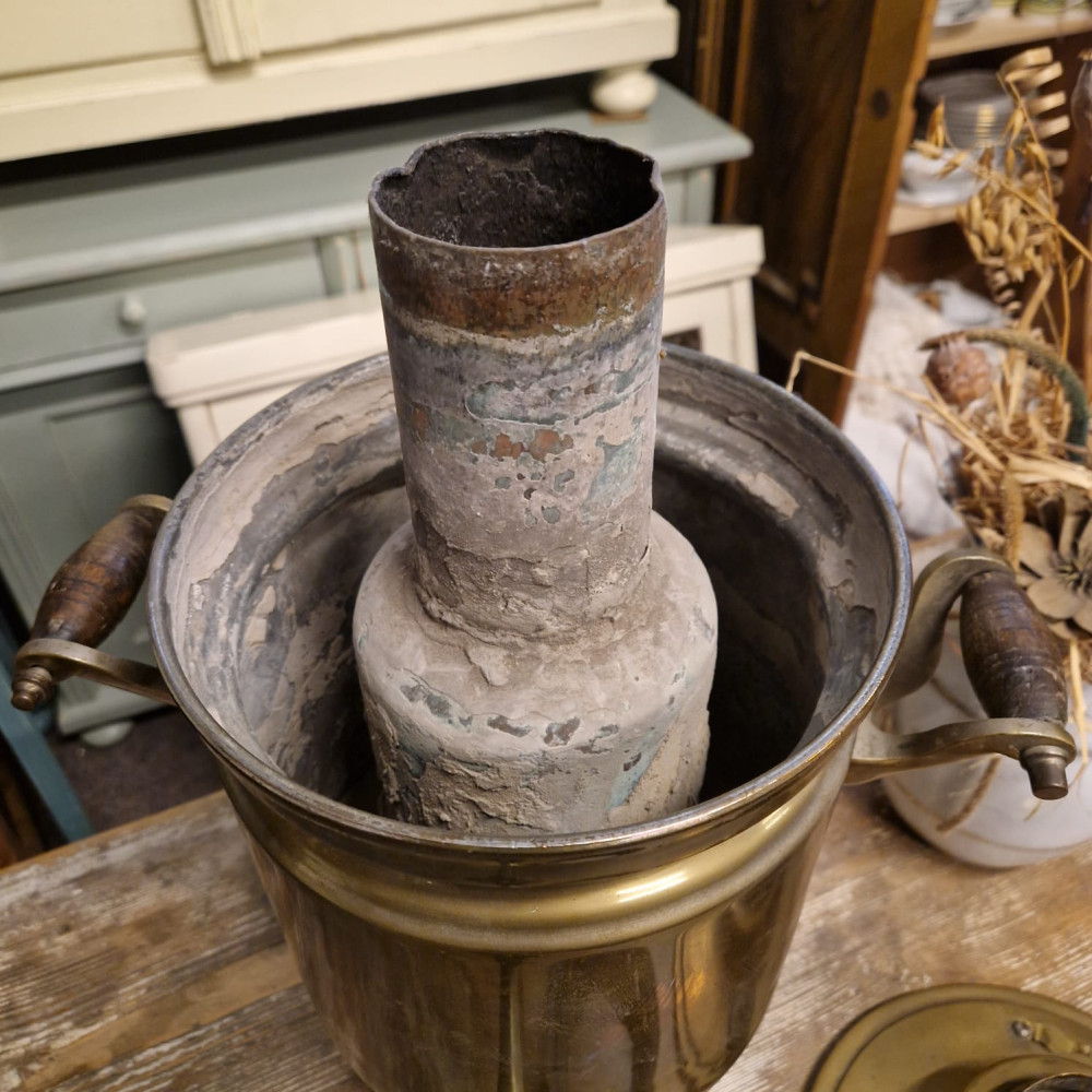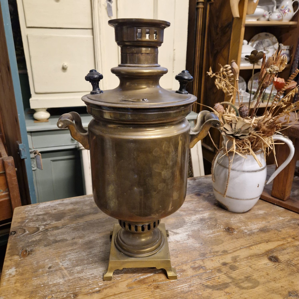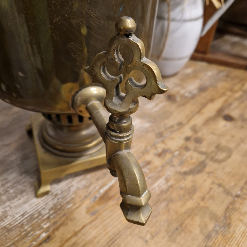 Starožitný ruský samovar z mosazi, tradiční nádoba sloužící k ohřevu a vaření vody.