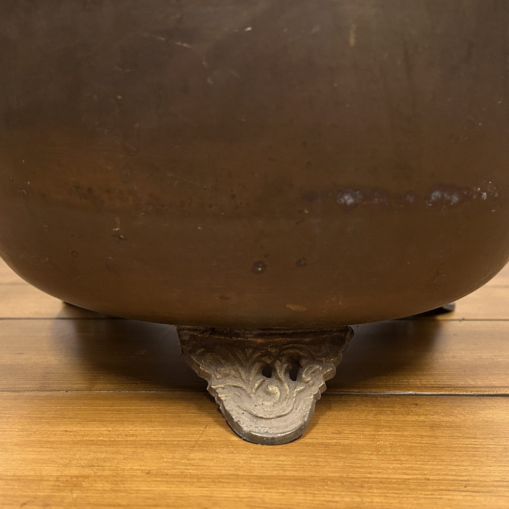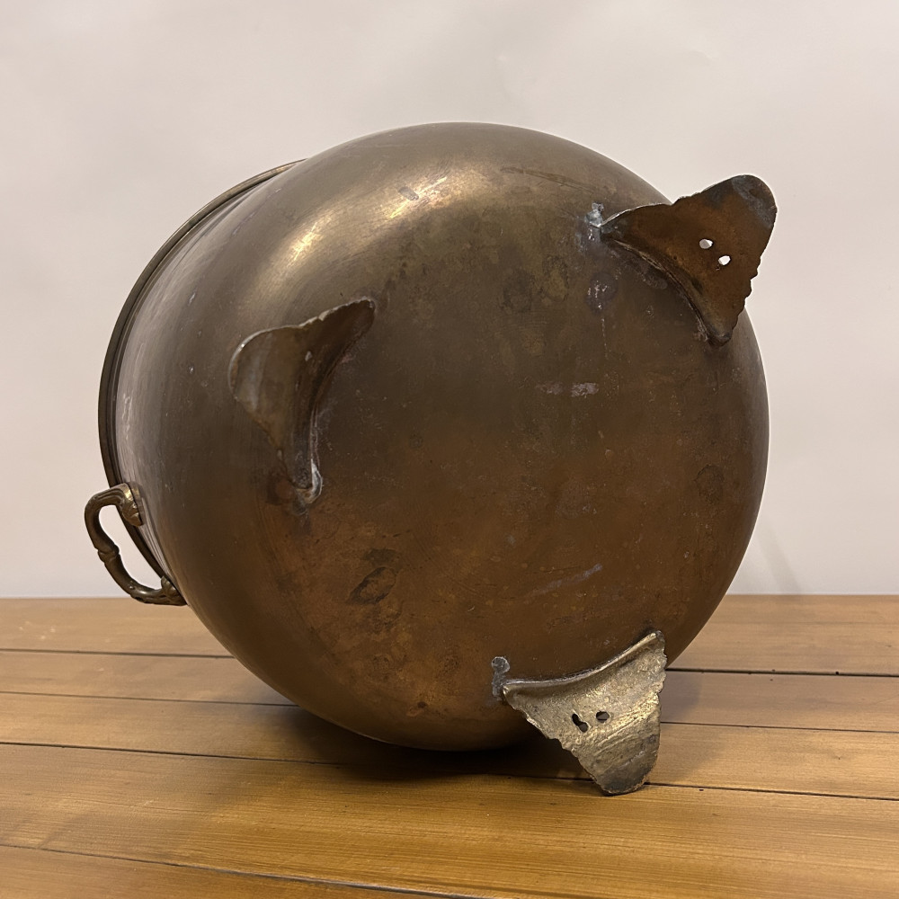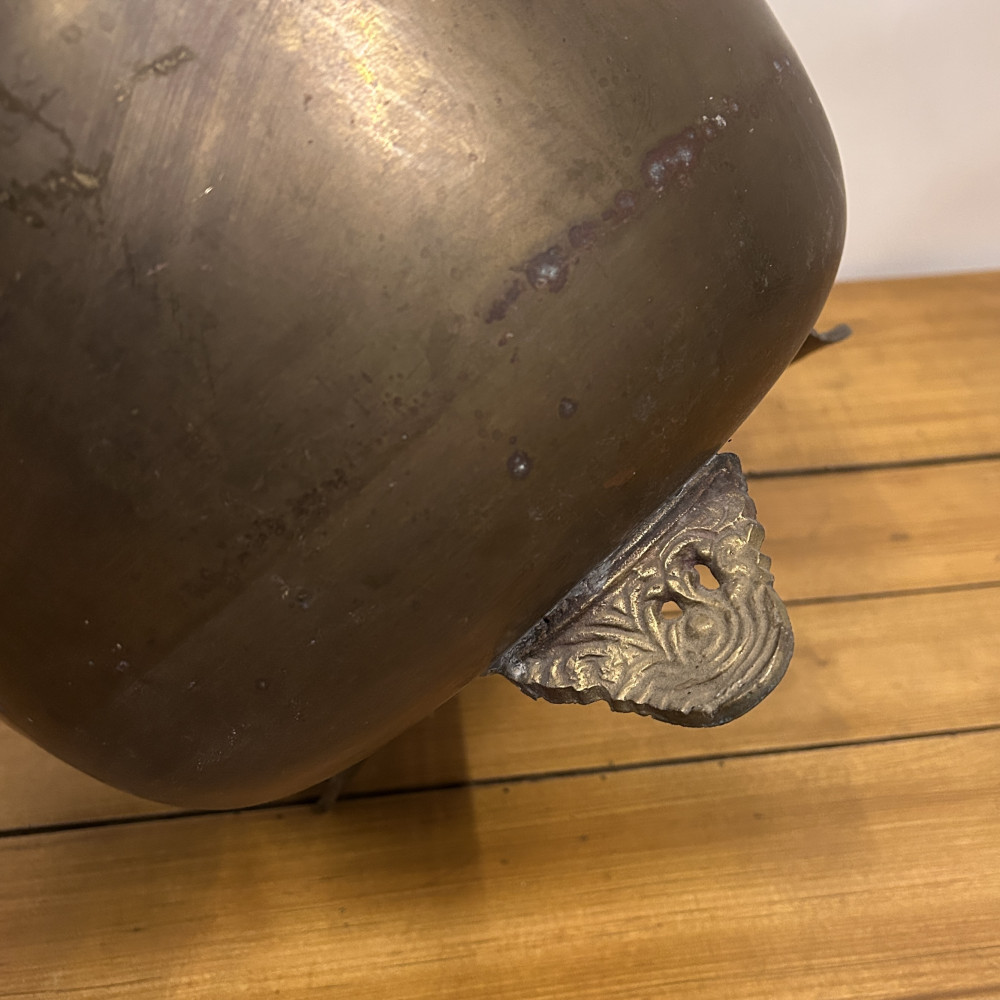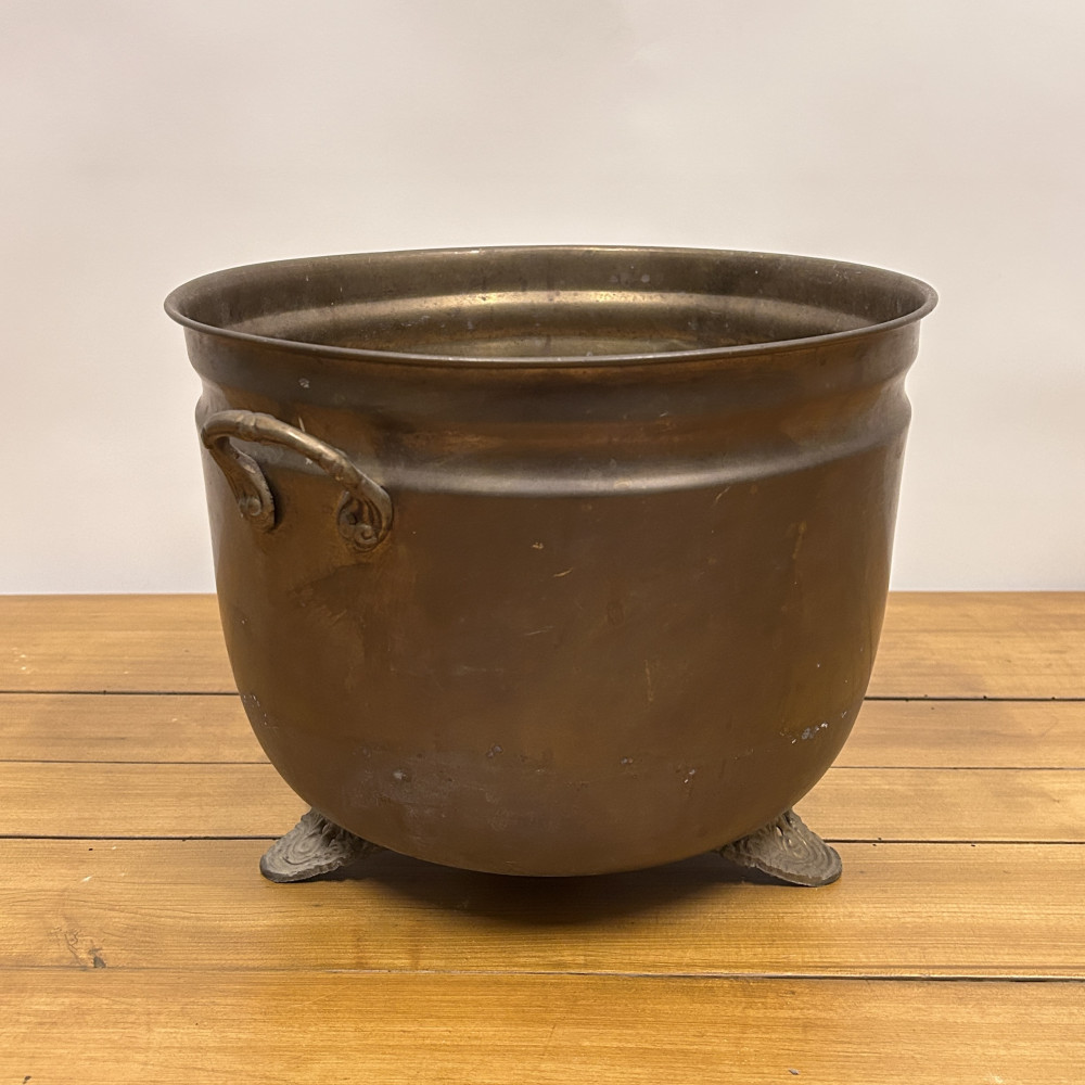 Starožitný mosazný květináč (často nazývaný také jako květník, jardiniéra nebo dekorativní kotlík) se dvěma uchy a ozdobnými nožkami.