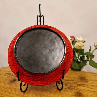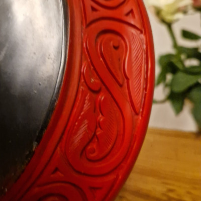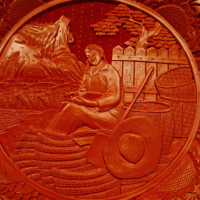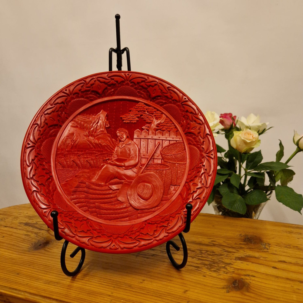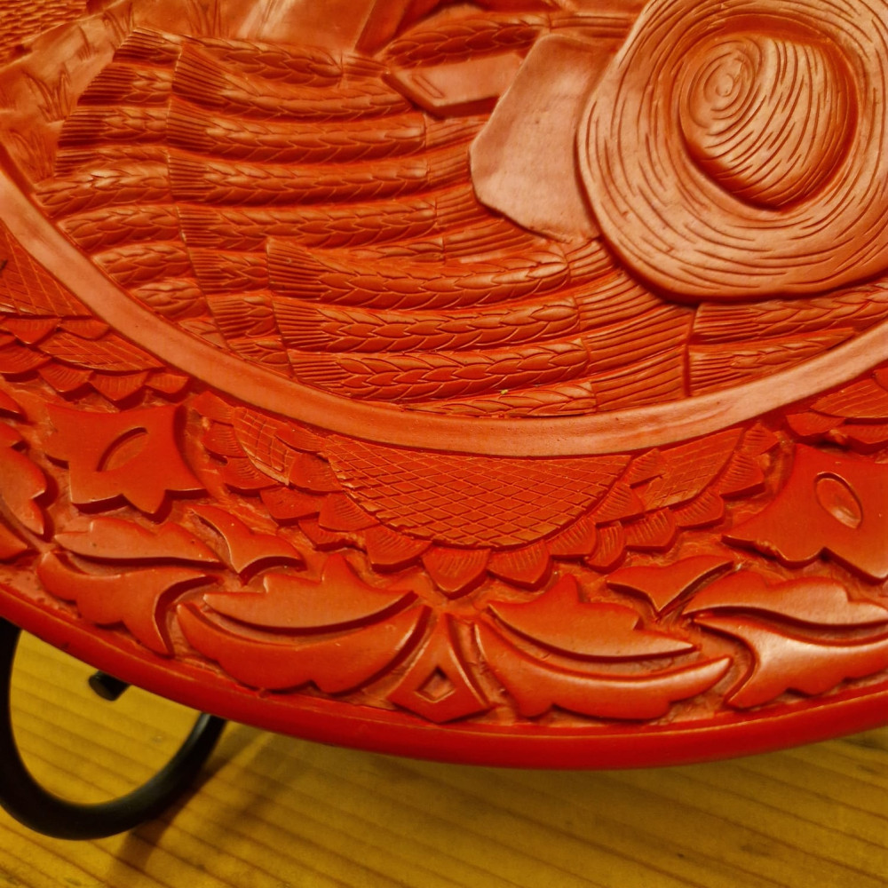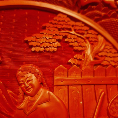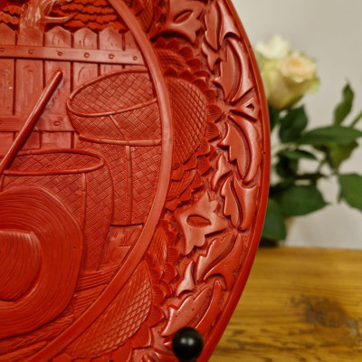 Elegantní dekorativní talíř vyrobený tradiční čínskou technikou cinnabar, kdy je na základní tělo naneseno mnoho vrstev červeného laku, které jsou poté ručně vyřezávány do bohatého reliéfního ornamentu.