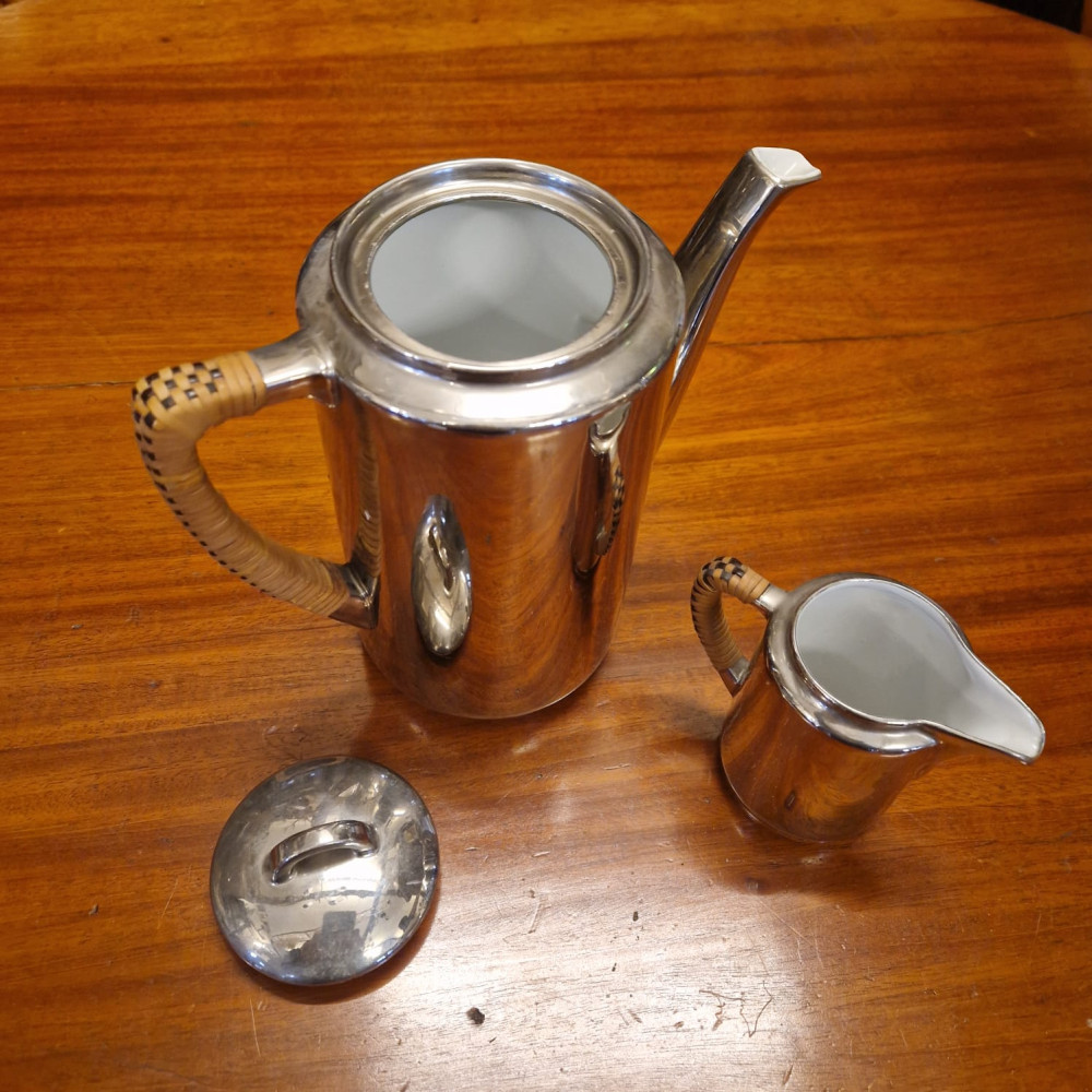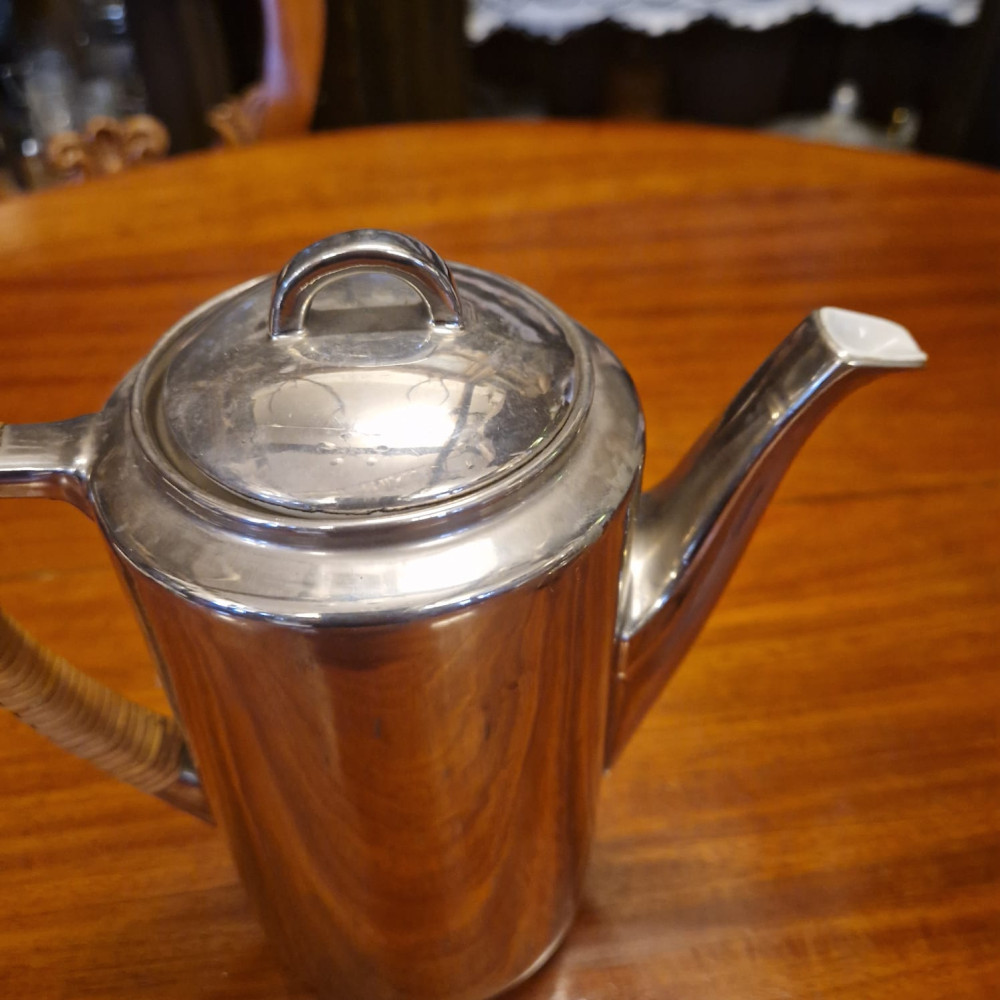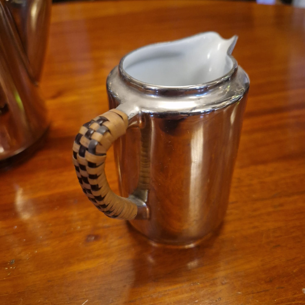 Porcelánová termokonvice s mléčenkou, obě s ratanovými rukojeťmi. Jedinečná termo porcelánová konvice spojuje eleganci klasického porcelánu s moderní technikou uchování teploty.