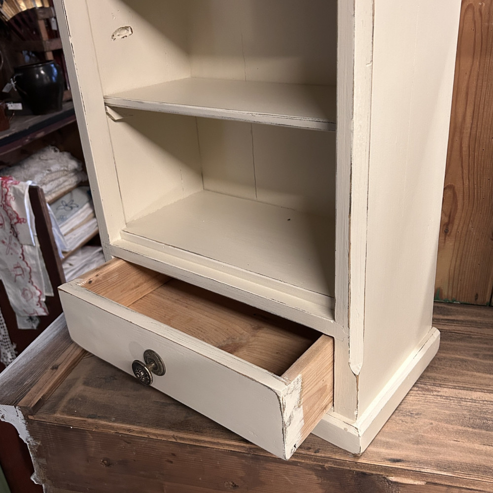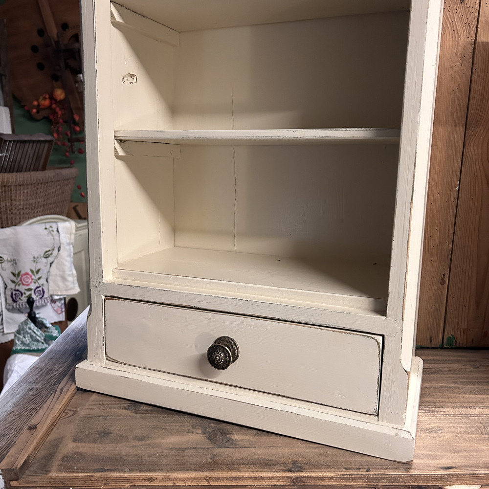 Dřevěná skříňka v krémové patině je vybavena zásuvkou s kovovou úchytkou. Díky dvěma kovovým úchytům na horní straně lze snadno zavěsit na zeď. Perfektní do kuchyně, jídelny, předsíně nebo chalupy.
