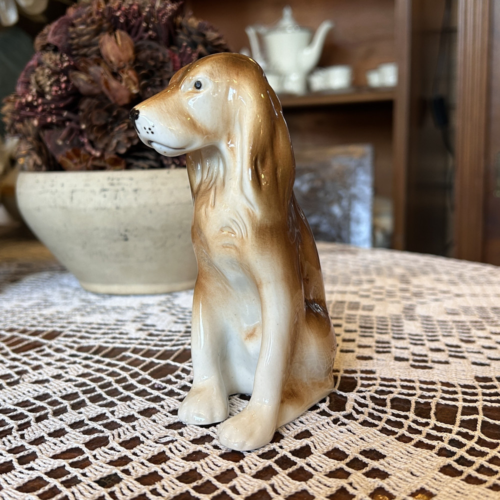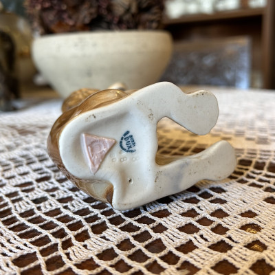 Porcelánová figurka sedícího kokršpaněla od známého českého výrobce Royal Dux Bohemia z Duchcova. Značeno na spodní části trojúhelníčkovou značkou a vtlačeným číslem Royal Dux Czechoslovakia.