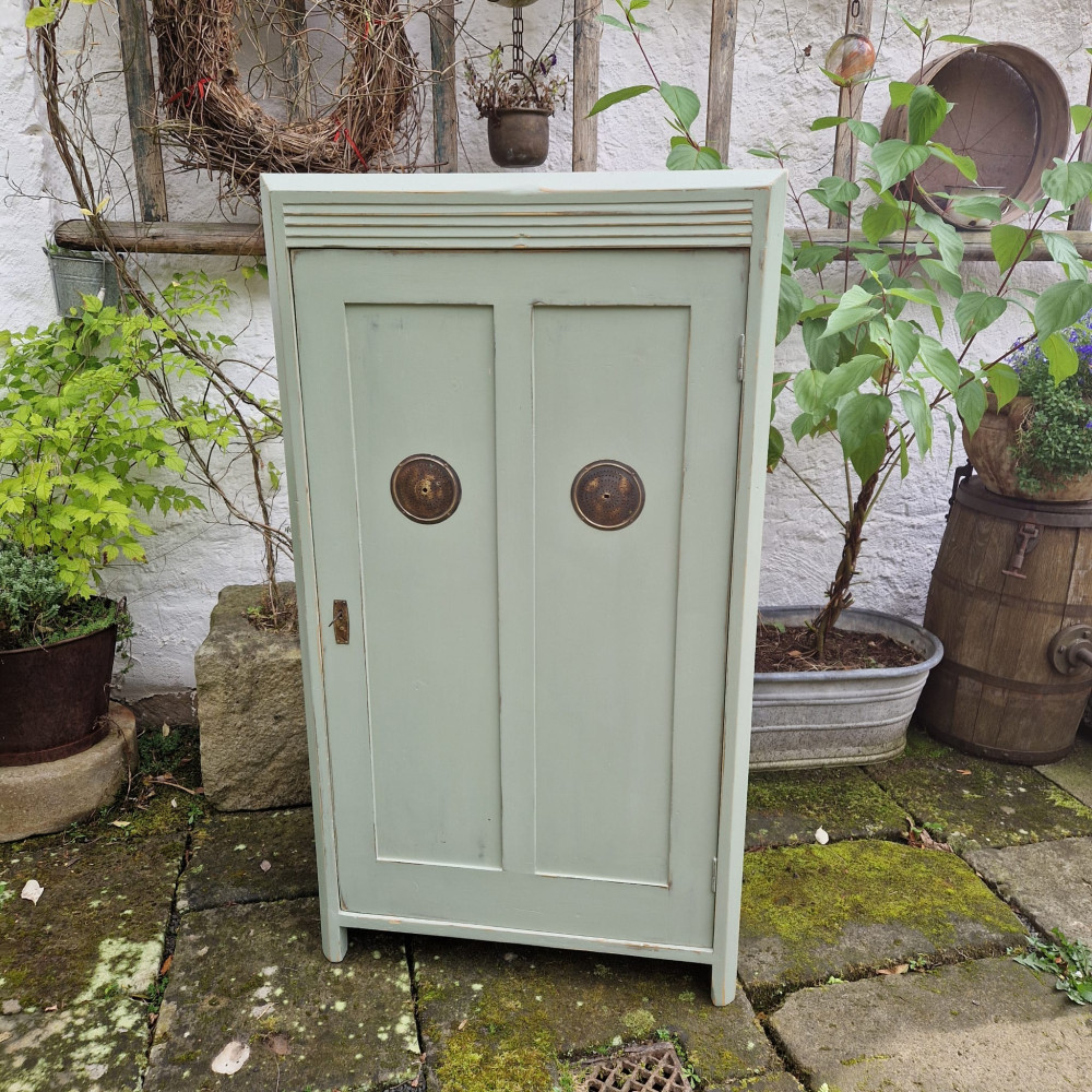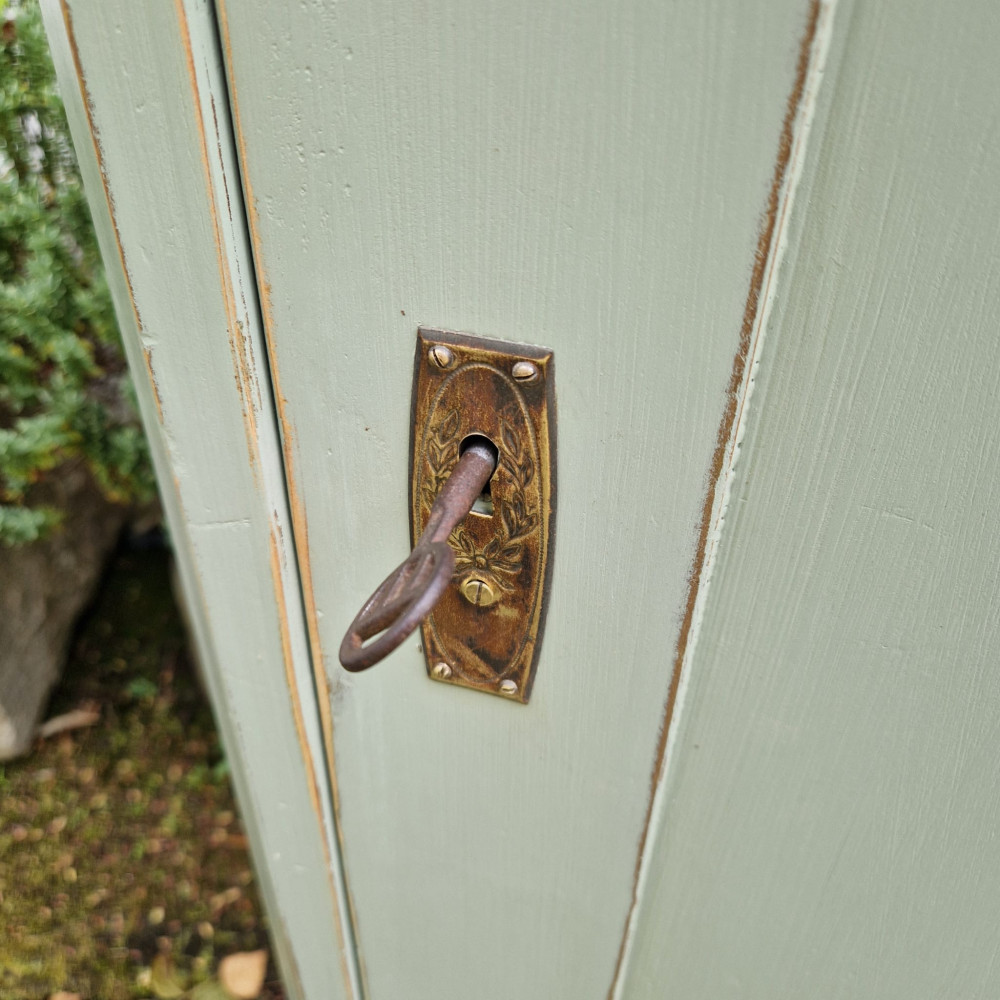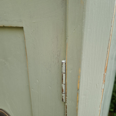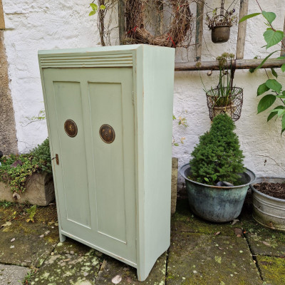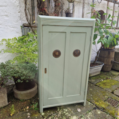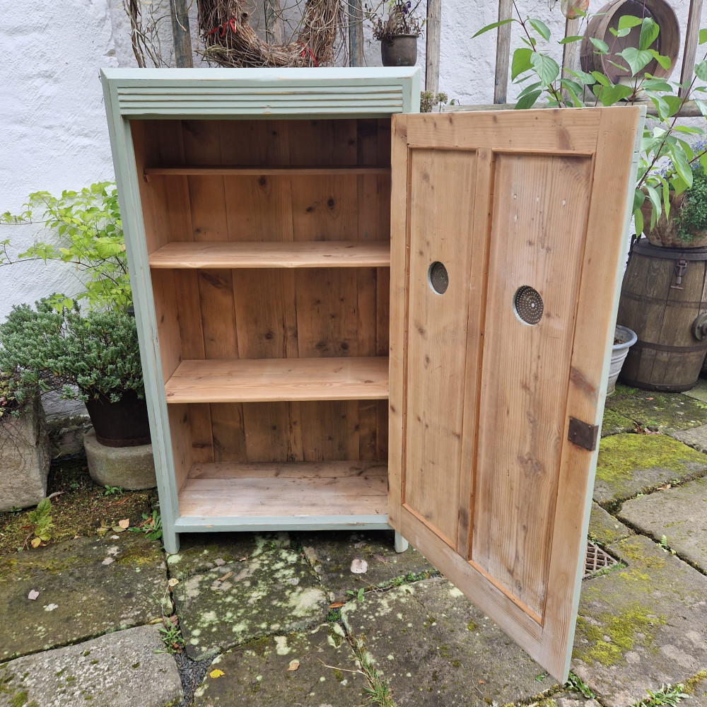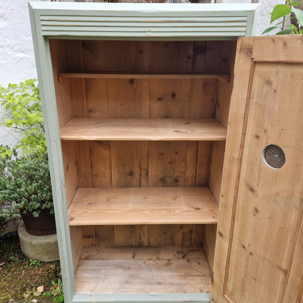 jednodvéřová skříňka na potraviny, tzv. špajzka ve světle zelené barvě s jemnou patinou